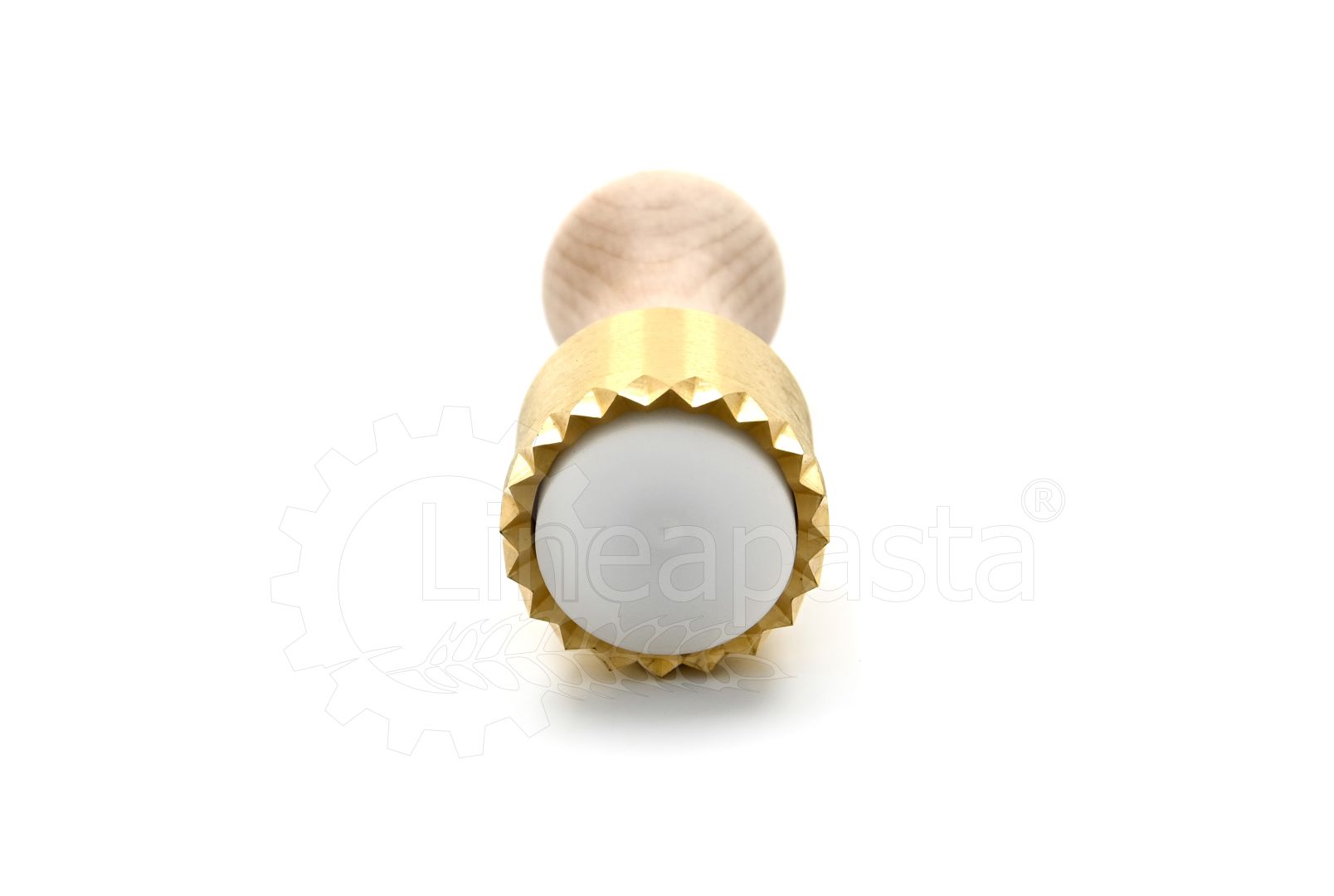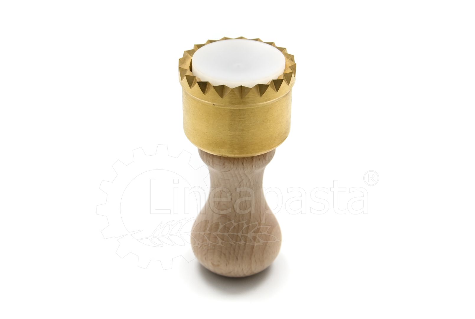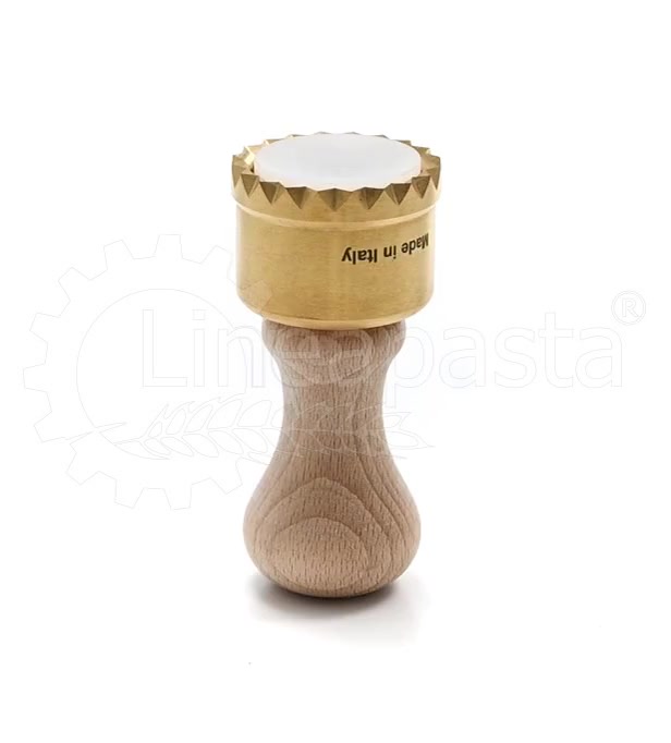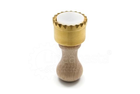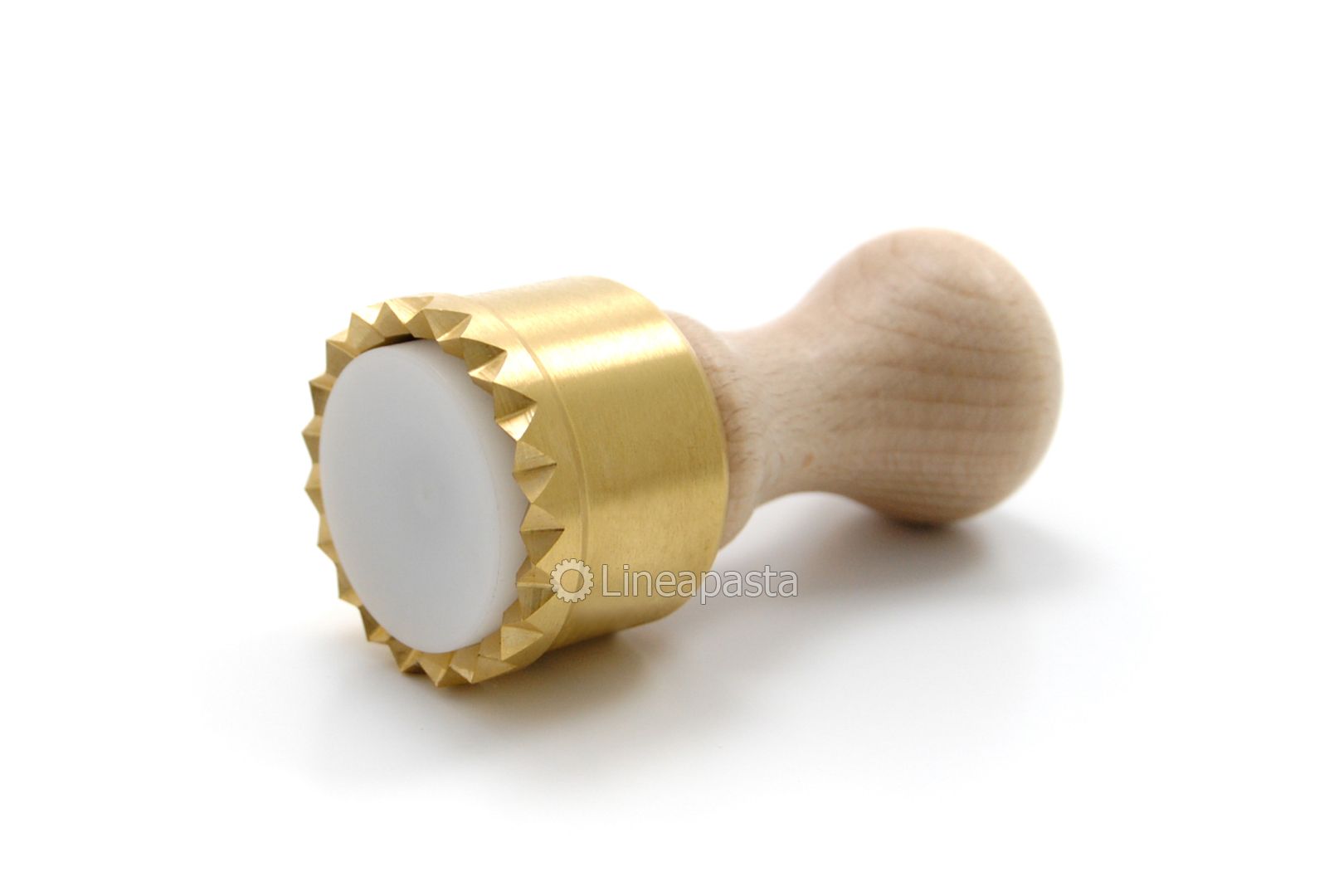 50mm diameter pasta cutter mould for round ravioli. The circular mould has a practical wooden handle fixed to a brass cutting part, inside which is inserted an effective plastic ejector that makes the creation of ravioli quick and easy.