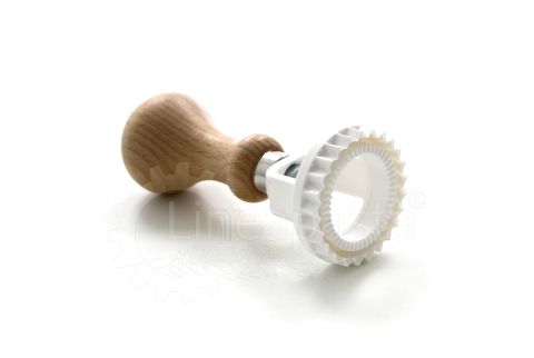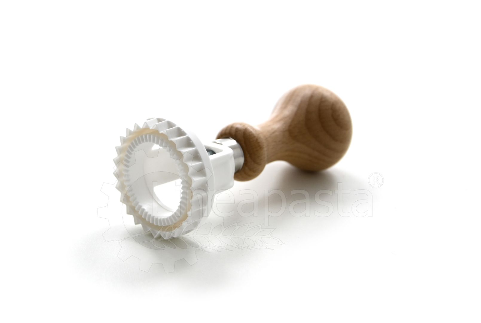 Ravioli mould made of derlin and equipped with a comfortable wooden handle. The mould allows you to cut the dough in the shape of a sun (50 mm diameter) and is equipped with an internal crown, which allows the filling to be hermetically sealed. This ravioli mould is suitable for both home and professional use.