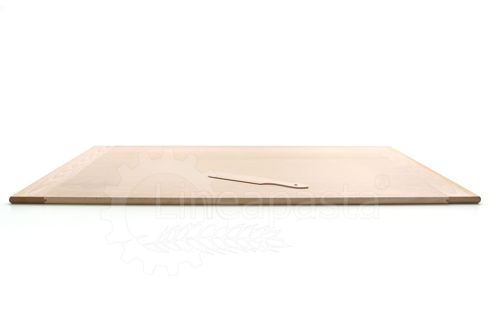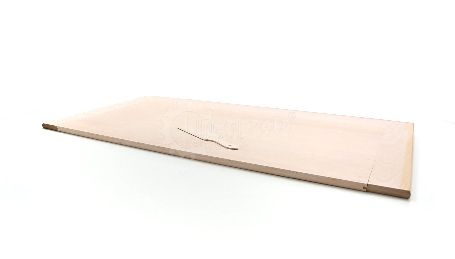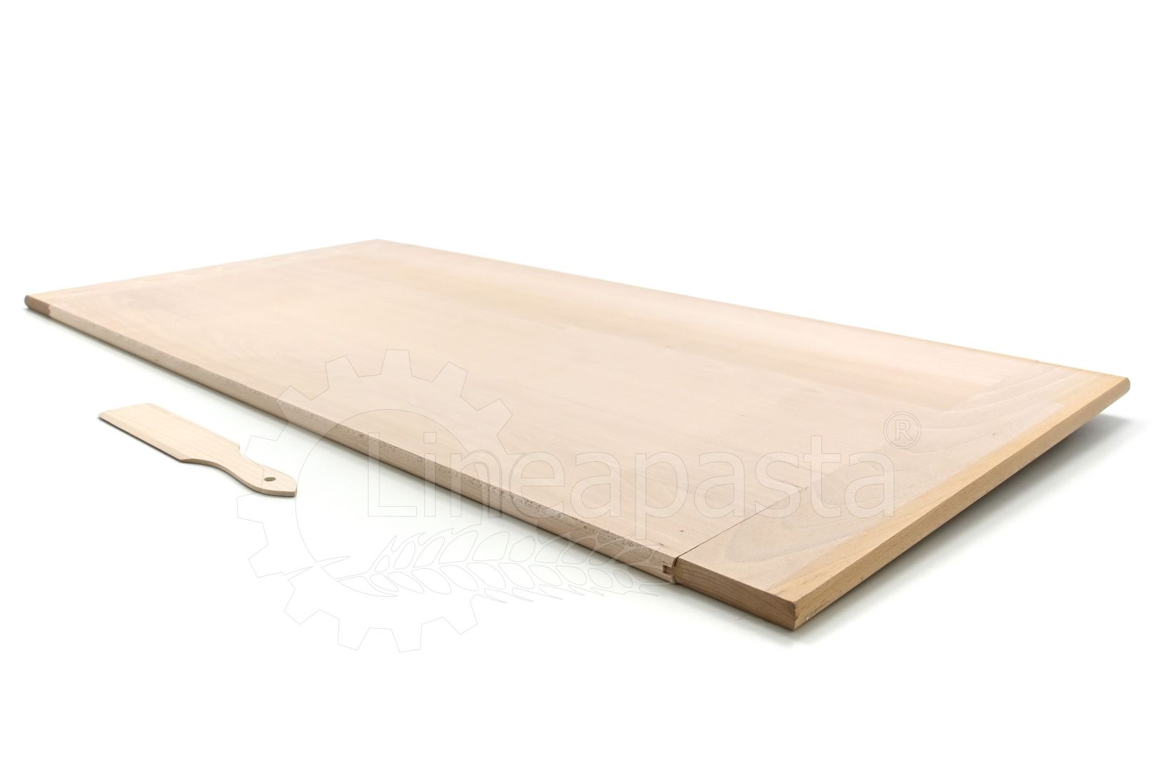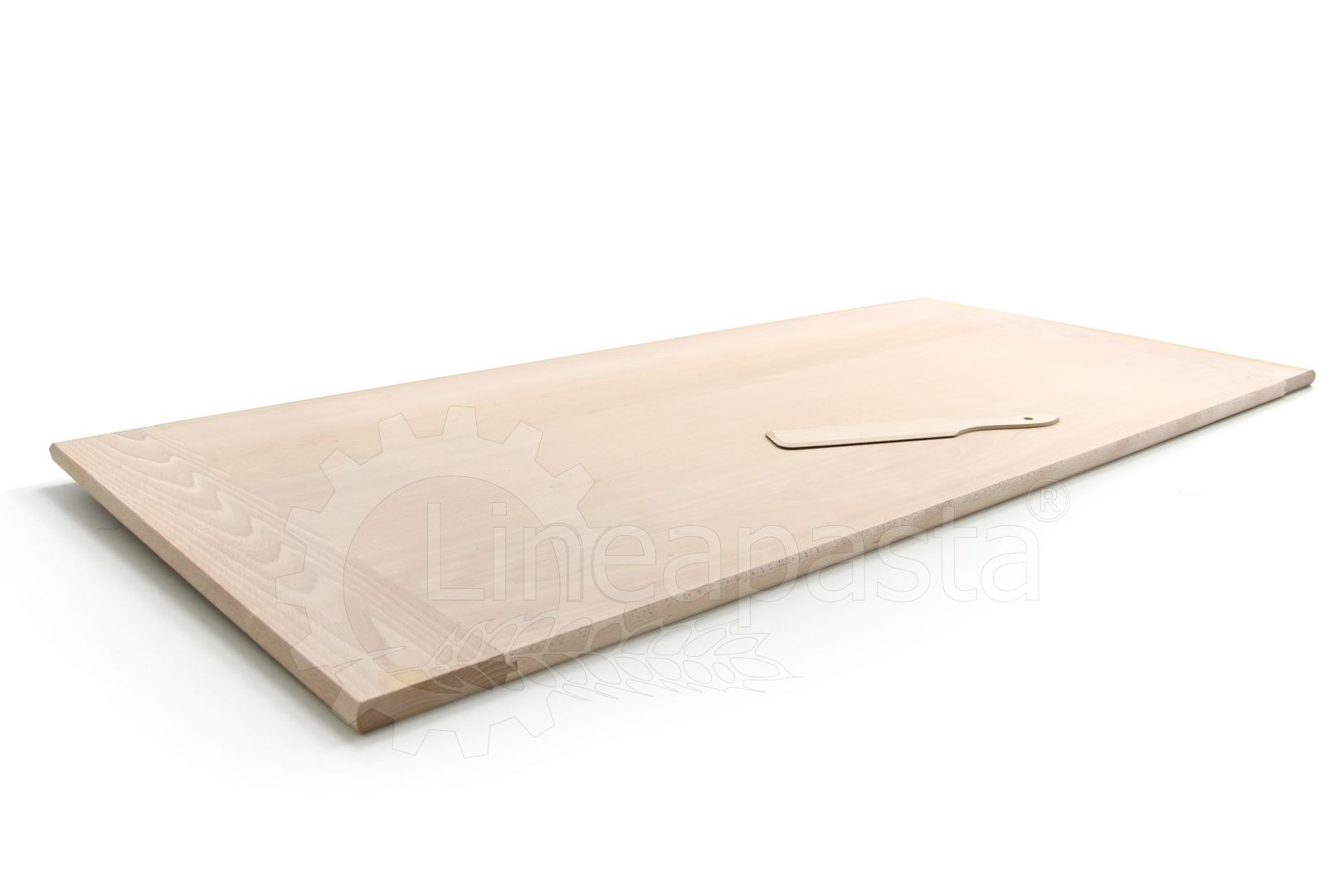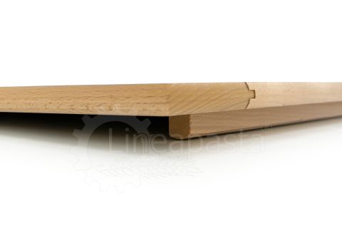 Beech wood board designed to work doughs for pasta, pizza, focaccia, puff pastry and desserts. The large beech wood surface acts as a work shelf, it has a practical riser and allows you to avoid ruining or dirtying the kitchen table during the production phase. The board is supplied with a 30 cm wooden spatula.
