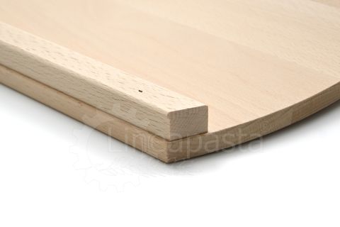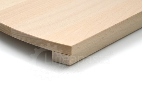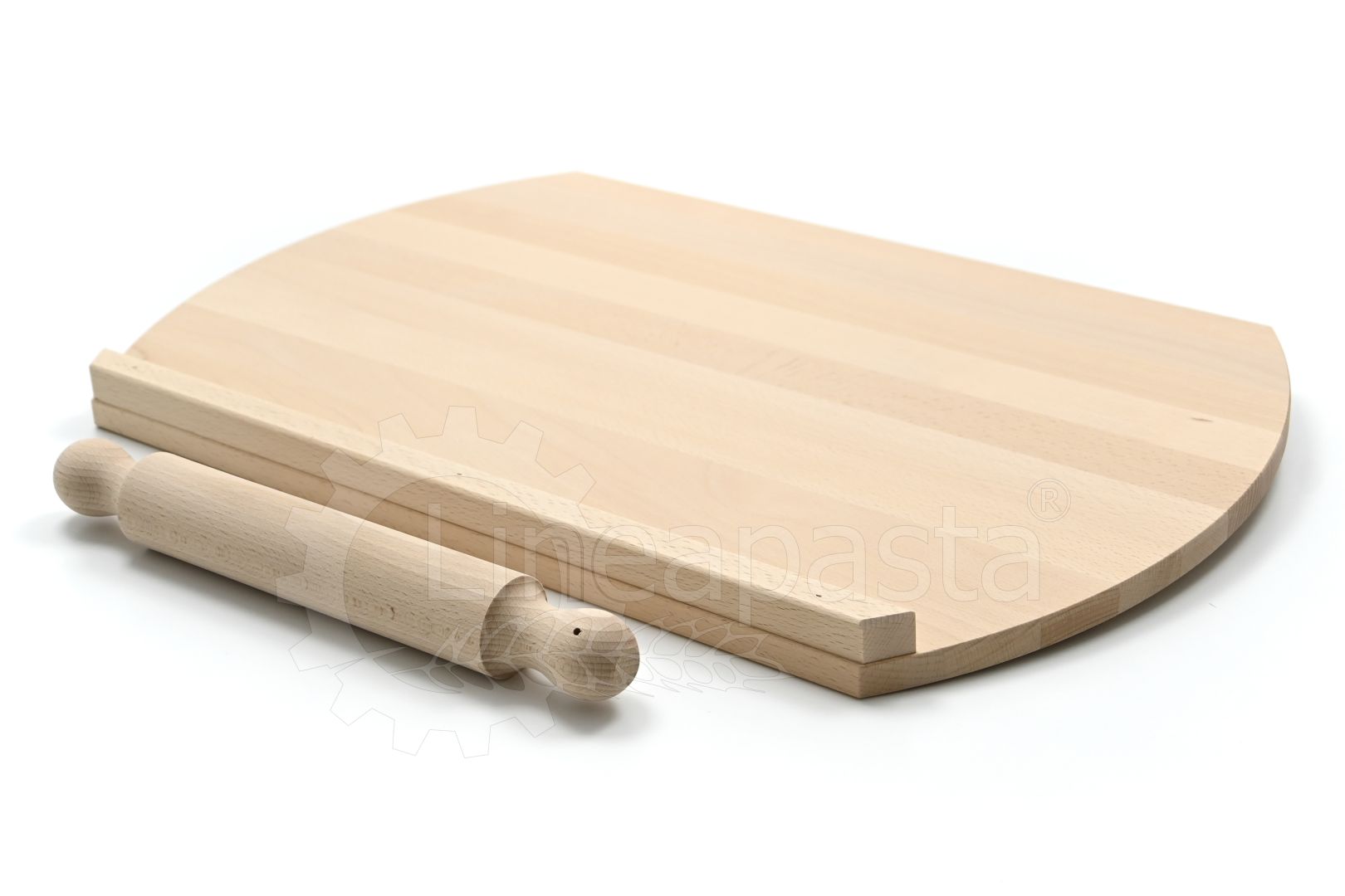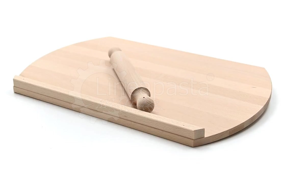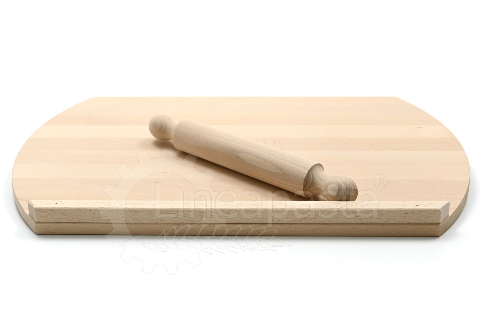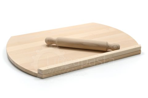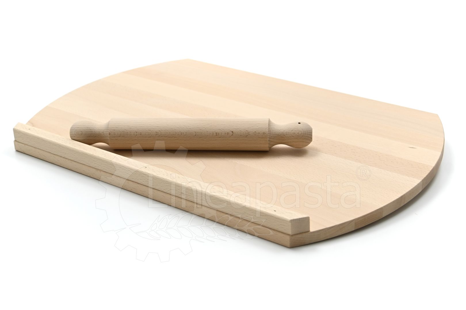 Beech wood board complete with rolling pin, useful to roll out dough such as pasta, bread or pizza without soiling or spoiling the kitchen table. The wooden board serves as a worktop, has a large enough surface to allow the user to work comfortably and is equipped with an integrated rise that tilts the worktop slightly. The wooden board is also equipped with a second reinforcement placed at the lower end of the shelf, which prevents the rolling pin from slipping to the ground during the dough processing.