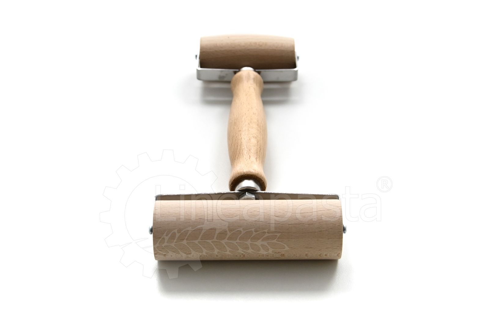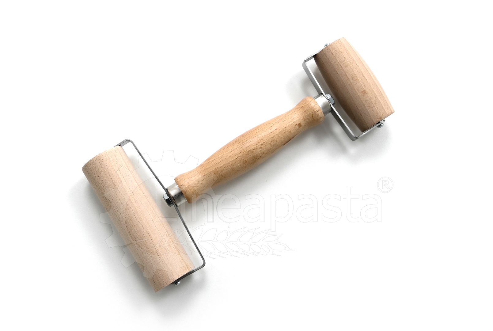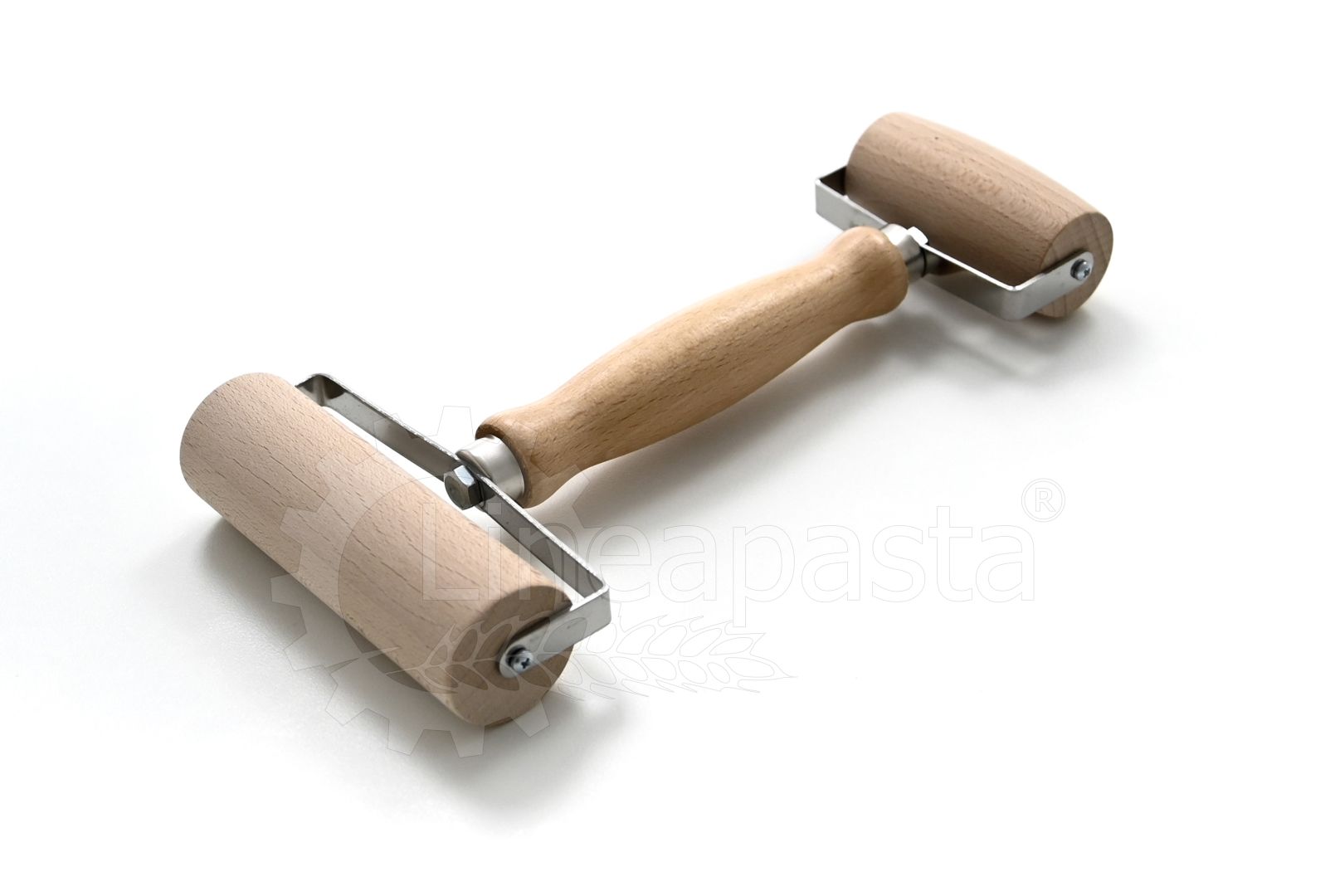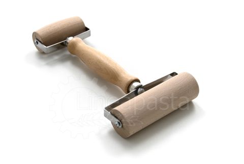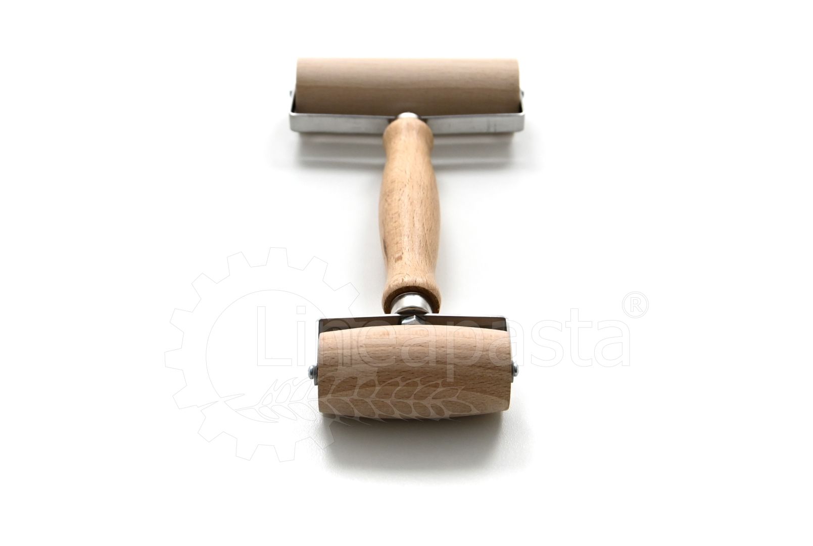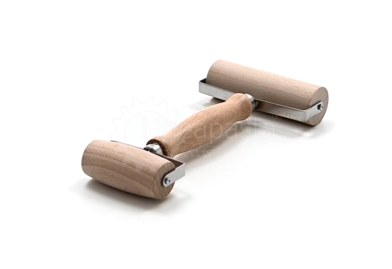 Tool made up of two 35 mm diameter dough rollers, 70 and 110 mm long respectively. The two rolling pins are connected to each other by a stainless steel structure and a practical wooden handle, which allows the user to handle the rolling pin with ease. Suitable for both domestic and professional use, the two dough rollers are ideal for preparing dough such as for pasta, pizza and biscuits.