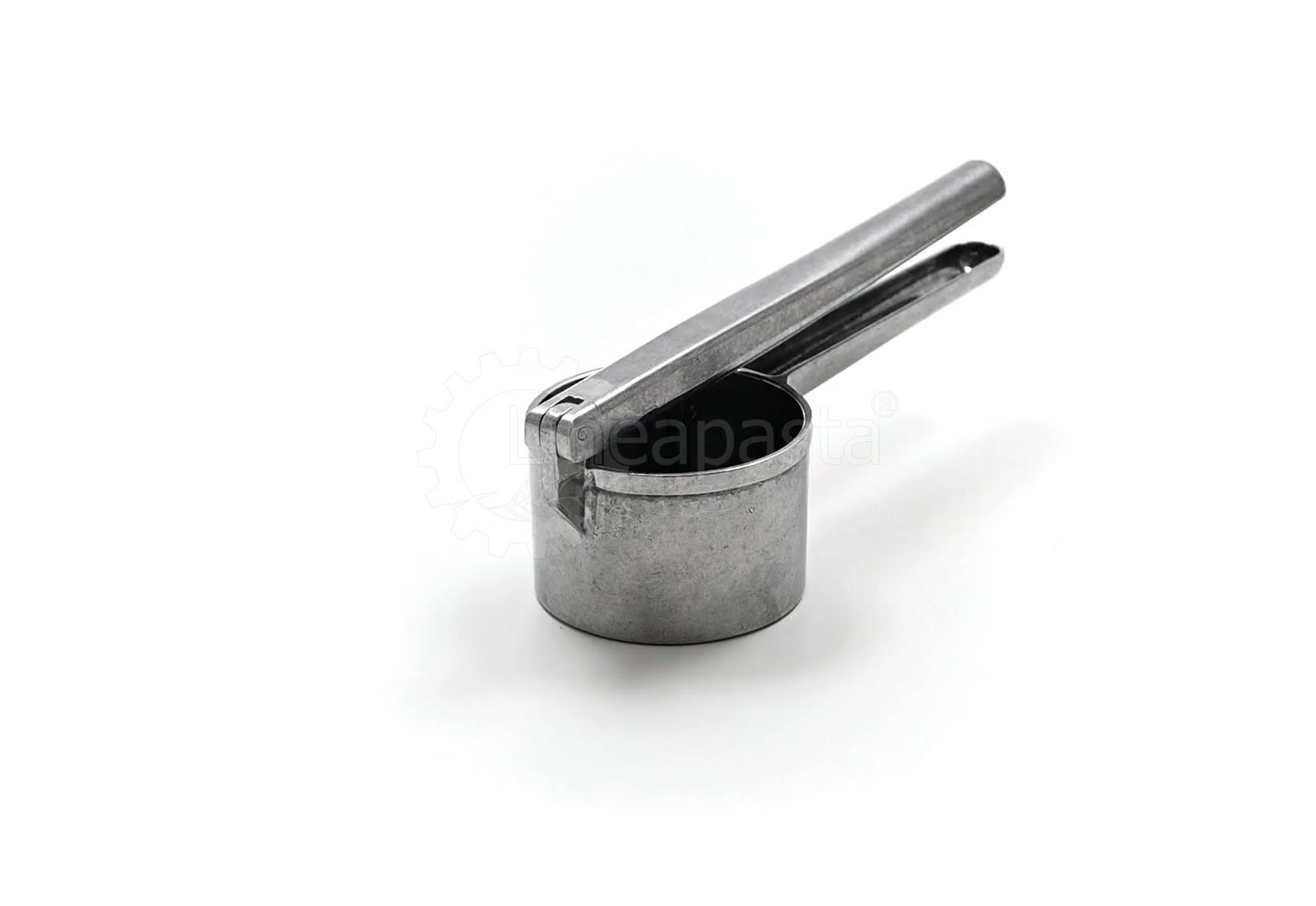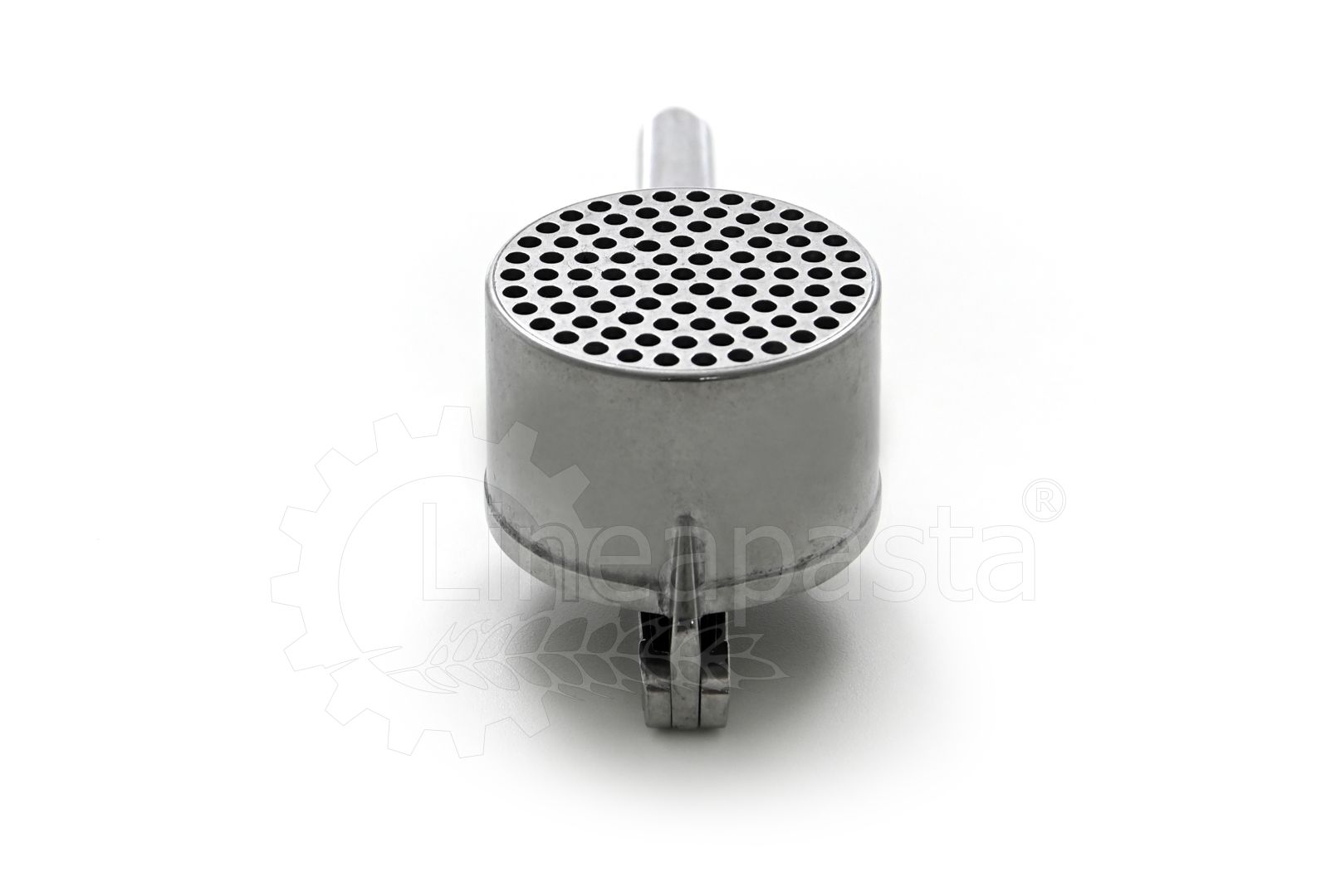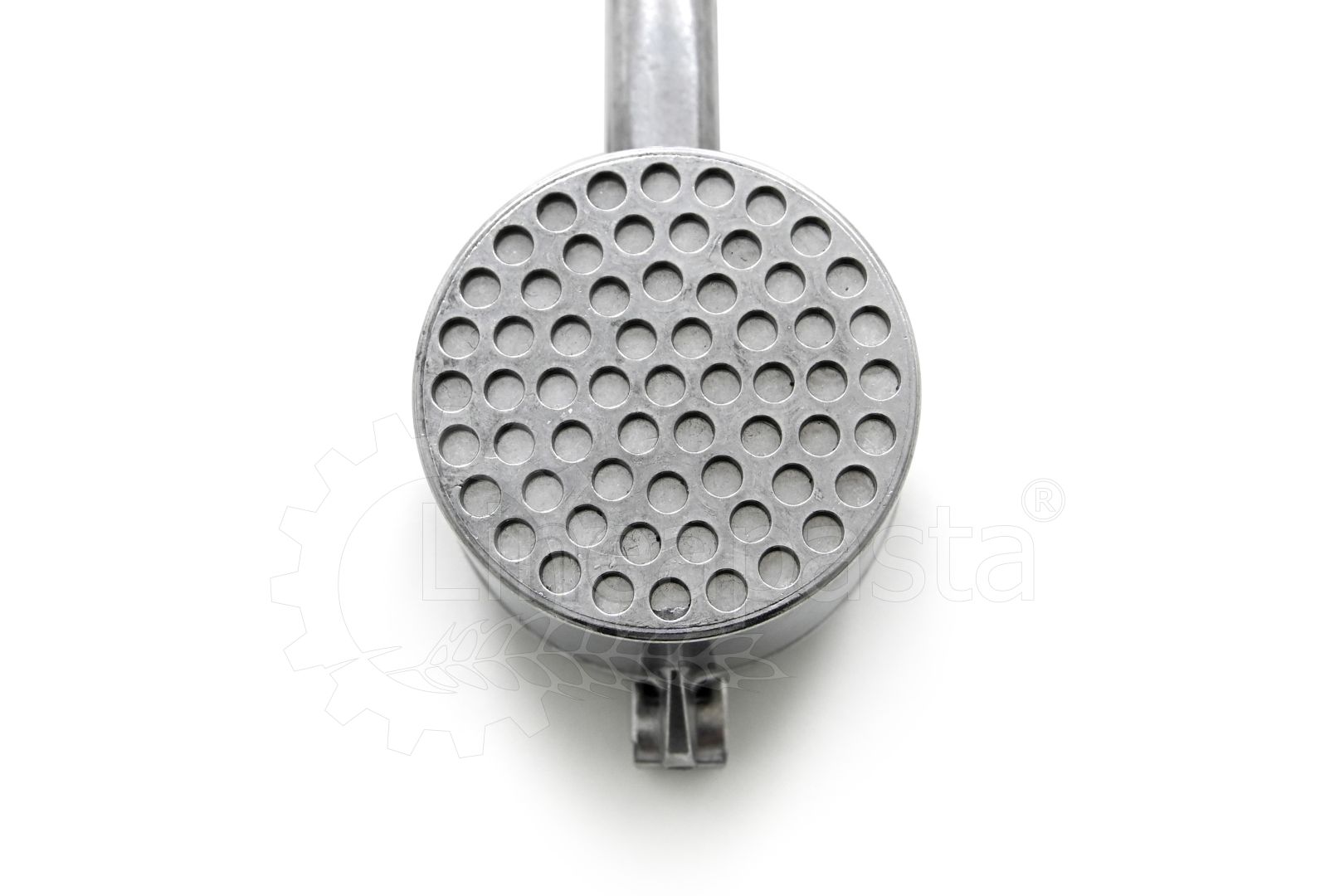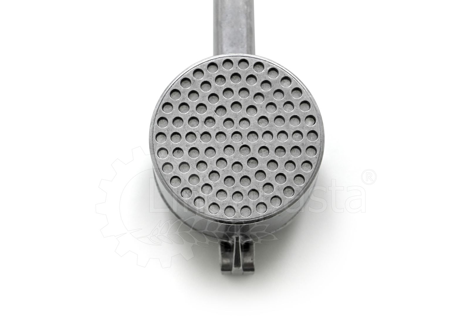Aluminum masher designed for the production of passatelli, suitable for both domestic and professional use. This tool is made up of a 90 mm diameter circular container with holes in the bottom which, through a crushing process, produces different types of dough. Also usable as a potato masher, this passatelli mould is available in three variants: with 5,5 mm or 7 mm holes and 5,5 mm stars.
