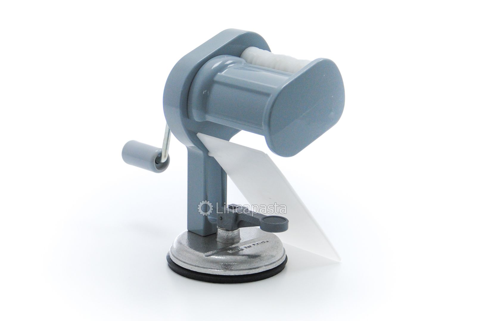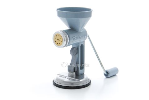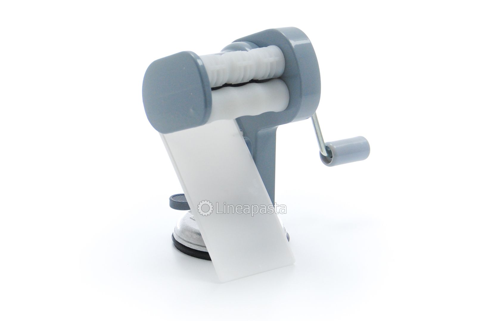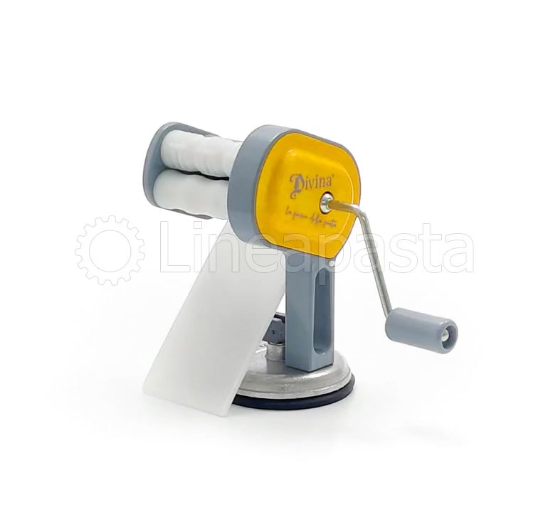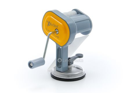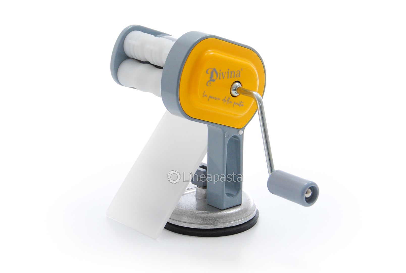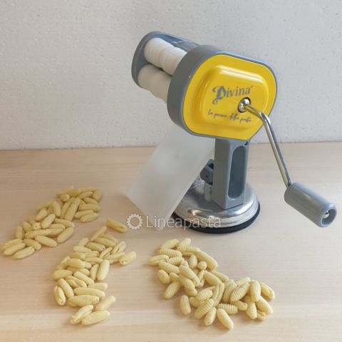The manual machine for fresh pasta Divina Demetra is a typical regional pasta forming machine produced and manufactured in Italy. Ideal for making homemade pasta such as orecchiette, gnocchetti sardi and cavatelli smooth and striped. Divina is a robust manual cavatelli machine, space-saving, easy to assemble, use and clean, used both for domestic and professional use. It is produced with robust and durable materials, with an enamelled aluminum body certified for power contact and front rollers made of food-grade plastic. The machine is operated by a side crank and is sold with a plastic slide that allows to drop cavatelli, gnocchetti and orecchiette made directly into a bowl placed in front of the machine. Divina by means of a simple suction cup fixing allows the pasta machine to be fixed on all smooth surfaces, with a perfect adherence guaranteed by a vacuum gauge operated by a small lever placed above the base.