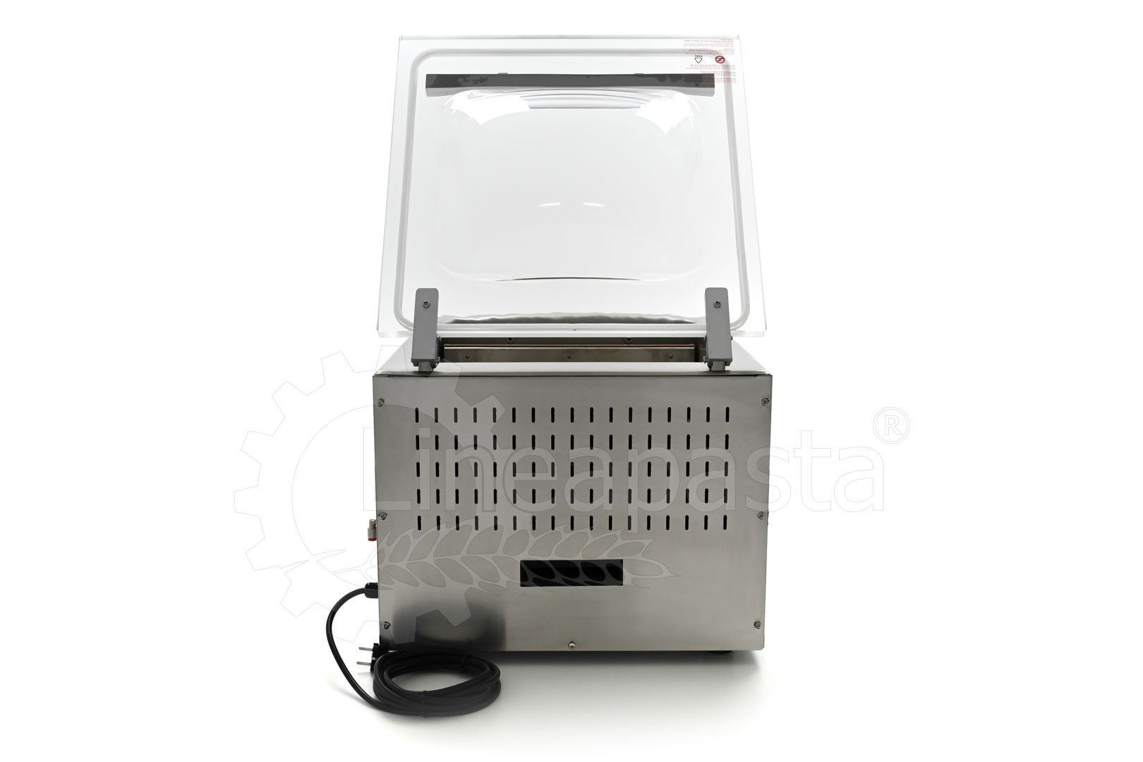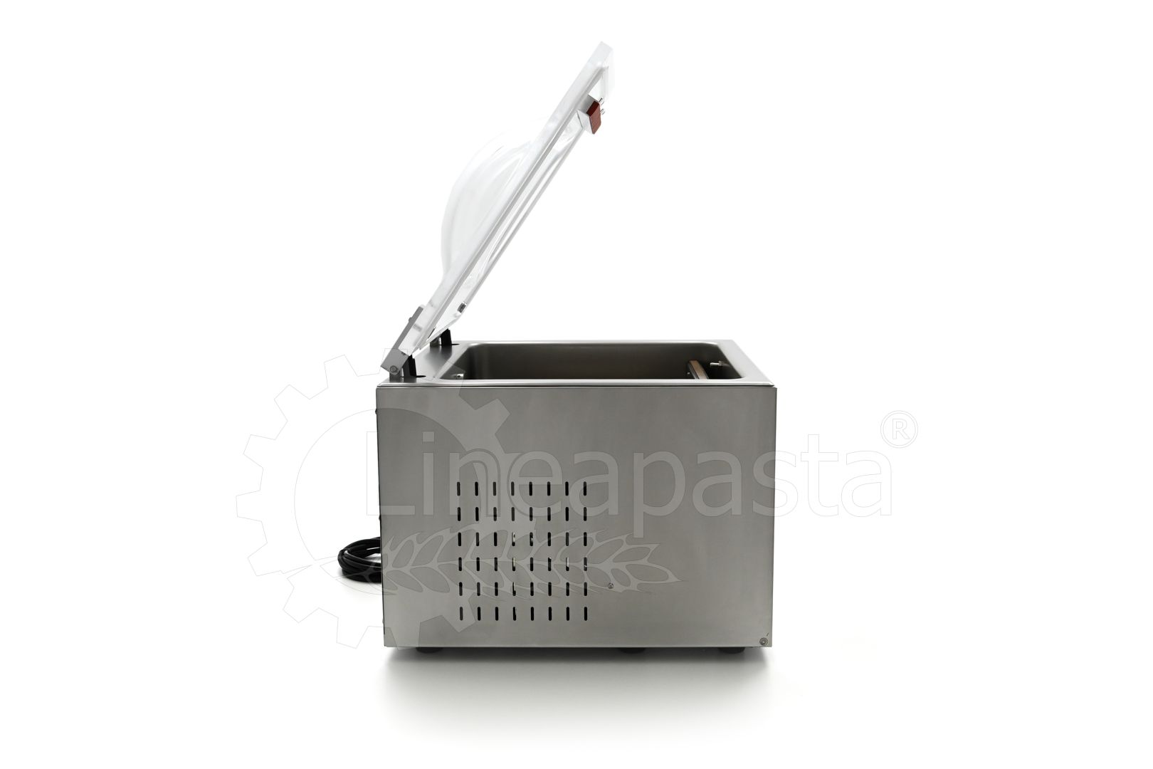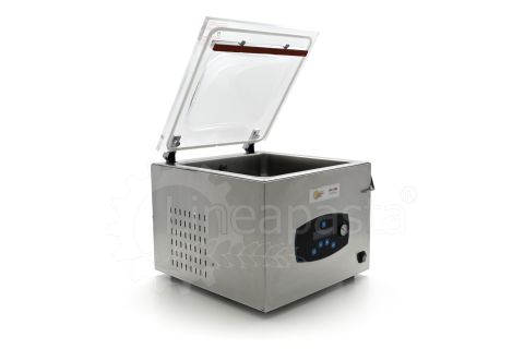 La envasadora de campana CC365 diseñada para charcutería, bares, cocinas profesionales o uso doméstico, permite el envasado de pasta gracias a un accesorio especial para trabajar con atmósfera modificada. La envasadora de campana CC365 se completa con una barra de sellado de 36,5 cm, un vacuómetro y un sensor útil para configurar el porcentaje de vacío en la bolsa o bandeja. El modelo CC365 se puede personalizar para adaptarse mejor a las solicitudes de producción del cliente, de hecho, permite la instalación de una barra de corte de residuos, una barra de doble soldadura o la instalación de un sistema de atmósfera modificada para mantener el sabor, la forma y la consistencia de los alimentos para ser empaquetado. En la envasadora CC365 también se puede instalar un programa específico para agilizar y simplificar los procesos de marinado de alimentos, un mando externo Soft Air para regular la intensidad del retorno de aire, un plano inclinado para líquidos, una tarjeta WiFi para diagnóstico remoto y una impresora térmica para etiquetas de alimentos. La estructura de la envasadora es de acero inoxidable mientras que la tapa transparente es de policarbonato, para una fácil limpieza y un uso duradero.