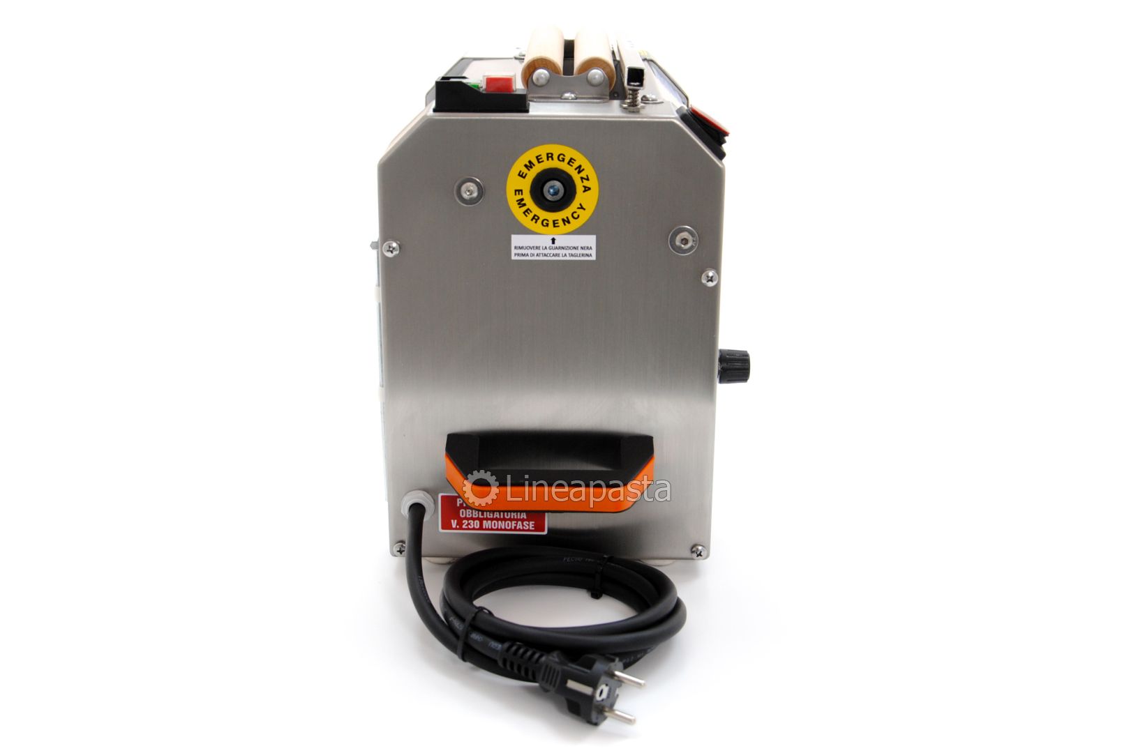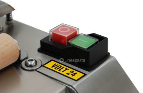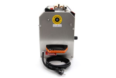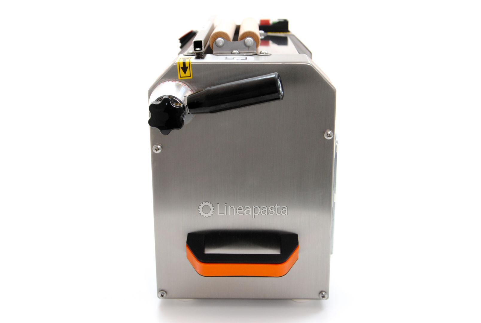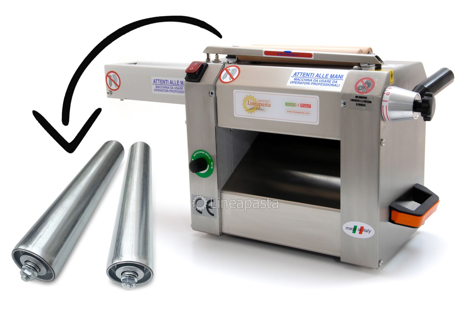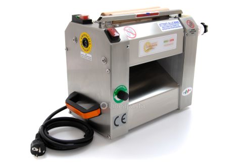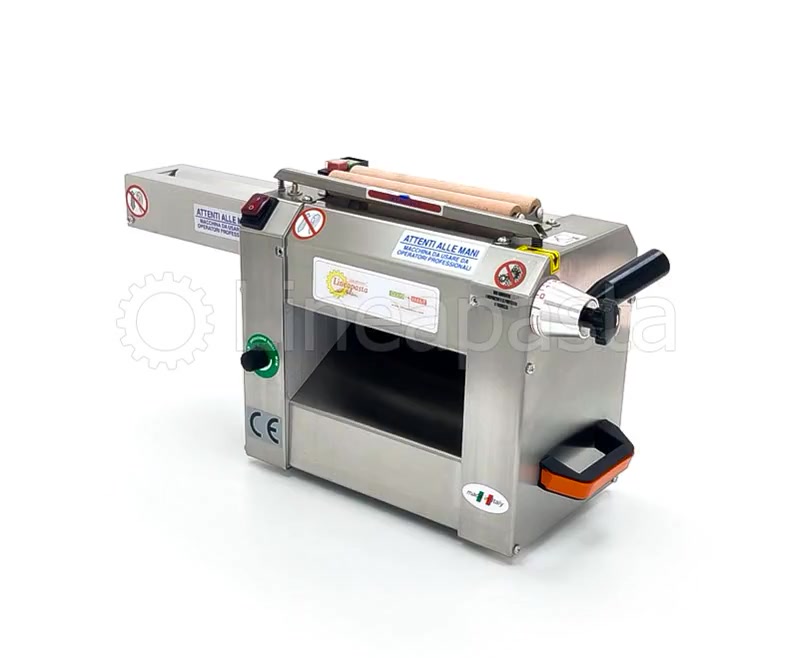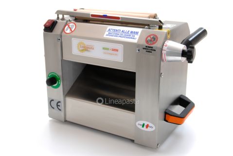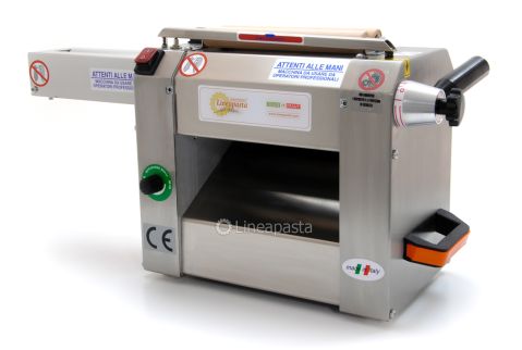 Laminadora de pasta fresca de sobremesa con cilindros de acero inoxidable de 220 mm de longitud, la máquina está fabricada íntegramente en acero inoxidable y aluminio. La laminadora de masa SR es ideal tanto para uso doméstico como profesional, permitiendo estirar diferentes tipos de masa con facilidad: masa para hojaldre, para pizza y también para pasta de azúcar. Para la preparaciòn de la masa, os recomendamos nuestras Amasadoras de espiral IS. Práctica y fácil de utilizar, permite regular la apertura del rodillo de 0 a 5 mm, para obtener el espesor de masa deseado. La laminadora SR está equipada con un potenciómetro que le permite ajustar la velocidad de rotación de los rodillos. La máquina tiene un alto grado de fiabilidad y está equipada con sistemas de prevención de accidentes esenciales para la seguridad del operador.