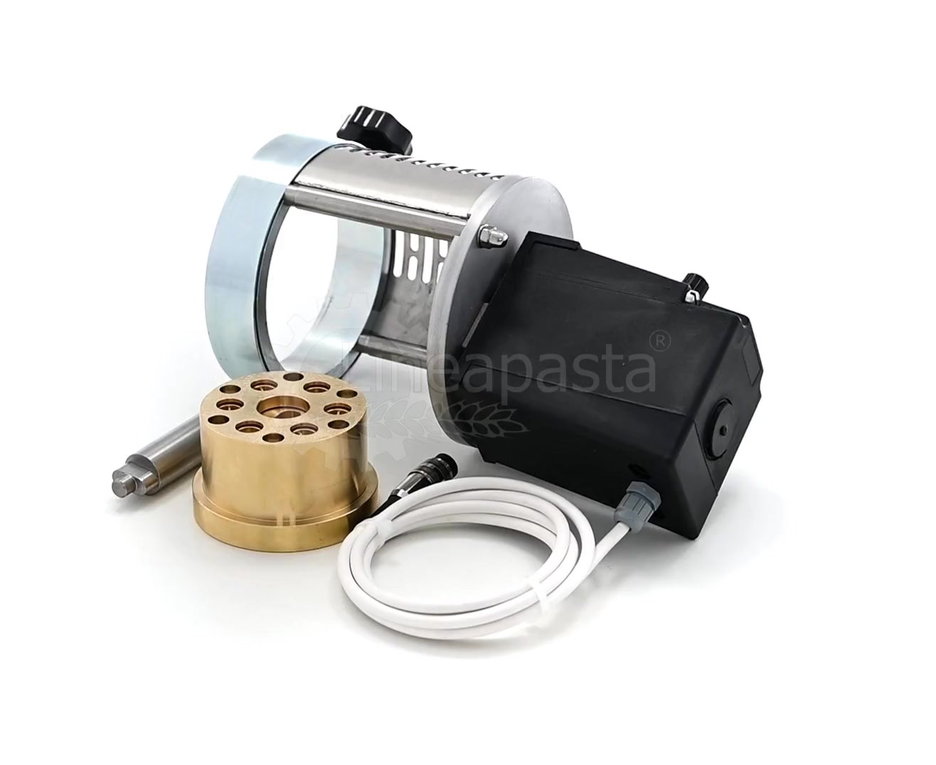 Kit diseñado para la producción de pasta busiata de 6 mm, compatible con máquinas de pasta P6 y P12. El kit busiata está compuesto por una trefiladora busiata de 89 mm de diámetro y un motor eléctrico especial equipado con un pasador especial que se fija a la mecánica interna de la trefiladora. La velocidad de rotación del motor es regulable por el usuario y permite modificar el grado de rizado del formato.