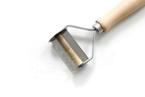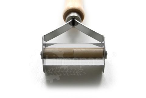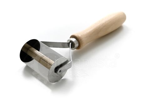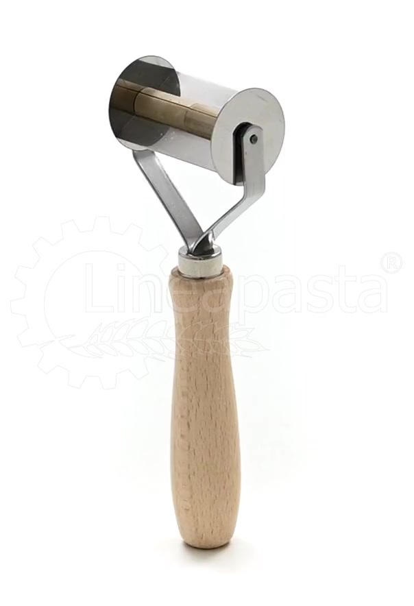 Cortador de masa dotado de mango de madera y dos cuchillas lisas de acero inoxidable, espaciadas formando una pista de 56 mm de ancho, con cuchillas perpendiculares a las ruedas que permiten cortar la masa en dos cuadrados en cada vuelta. Este cortador de pasta está diseñado para la producción de raviolis, cappelletti y tortellini.