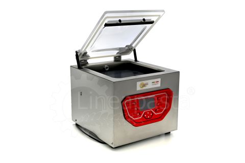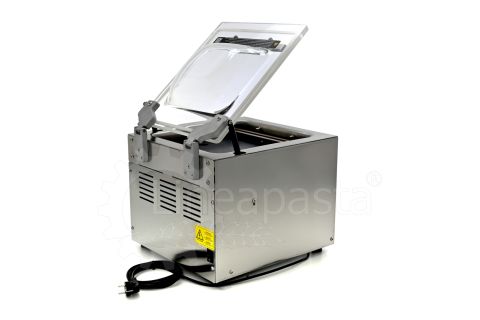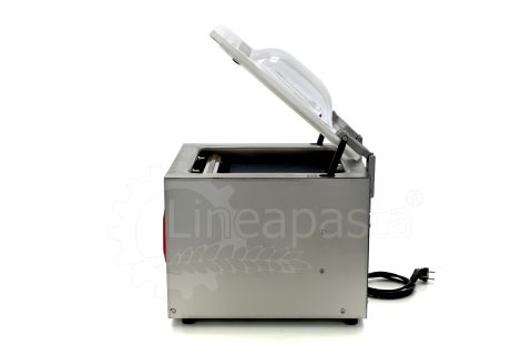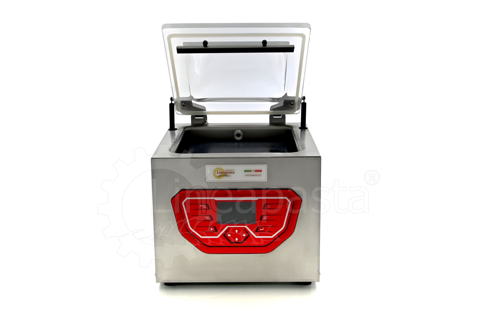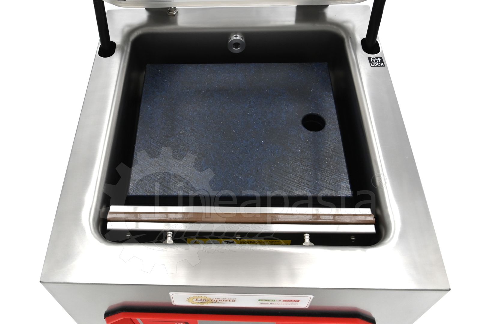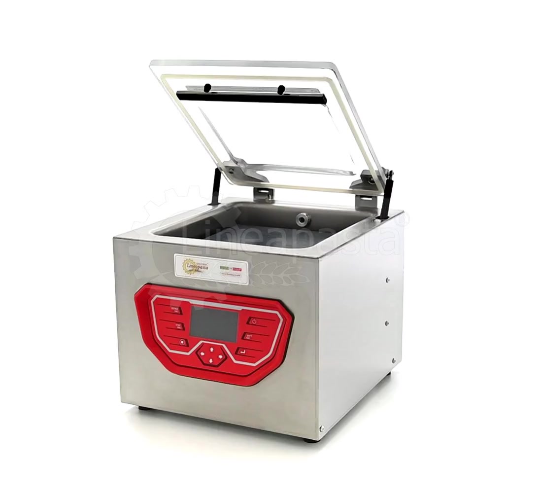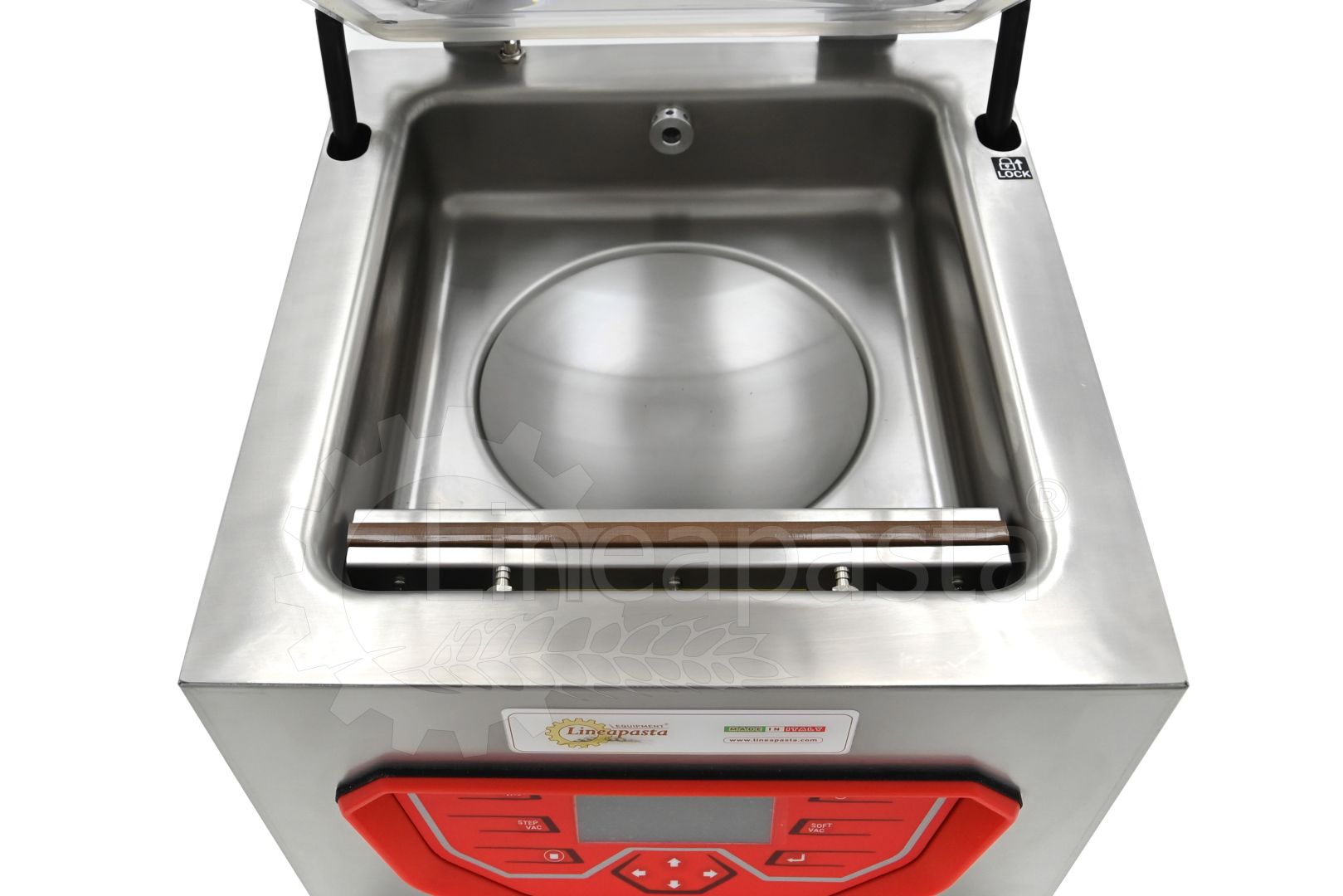 Machine d’emballage à cloche CC350 avec barre de soudure, idéale pour le conditionnement prolongé de la pâte car elle est équipée de la fonction optionnelle avec atmosphère modifiée (ATM) qui permet de préserver la forme et les caractéristiques du produit. Le conditionnement sous atmosphère modifiée sur machine à cloche est indispensable car il évite l’écrasement de la pâte qui se créerait avec la création du vide dans l’emballage.