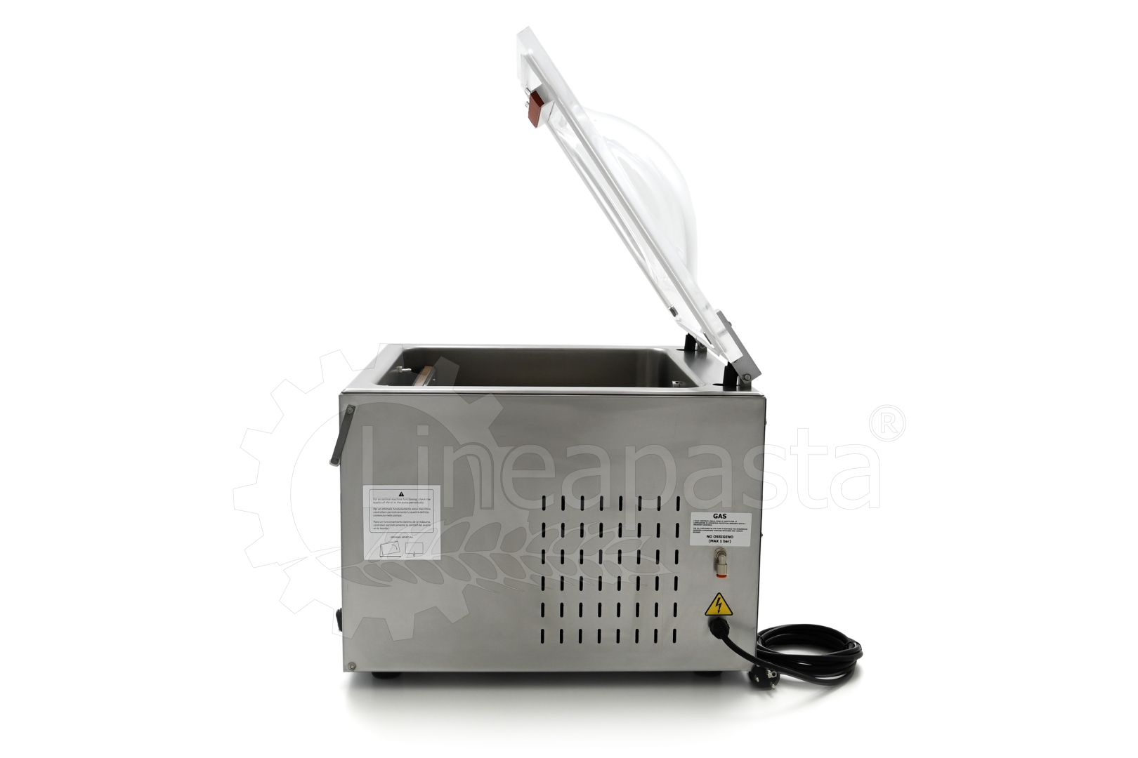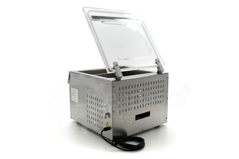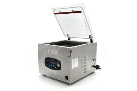 La machine d'emballage à cloche CC420 conçue pour les épiceries fines, les supermarchés, les bars, les cuisines professionnelles ou à usage domestique, permet le conditionnement de pâtes grâce à un accessoire spécial pour travailler avec l'atmosphère modifiée. Le modèle CC420 est équipé d'une barre de soudure de 42 cm, d'un vacuomètre et d'un capteur conçu pour régler le pourcentage de vide dans la barquette ou le sachet. Cette machine d'emballage en forme de cloche peut être personnalisée pour s'adapter au mieux aux besoins de production du client, en effet elle permet l'installation d'une barre à double soudure, d'une barre de coupe des déchets ou l'installation d'un système d'atmosphère modifiée pour maintenir la consistance, la saveur et la forme des aliments. Un programme peut également être installé dans la machine d'emballage CC420 pour simplifier et accélérer les processus de marinage des aliments, une carte WiFi pour le diagnostic à distance et une surface inclinée pour les liquides. Il est également possible d'implémenter une deuxième barre de soudure, un bouton externe Soft Air pour réguler l'intensité du flux d'air de retour et une imprimante thermique pour les étiquettes alimentaires. La machine d'emballage en forme de cloche est composée d'une structure en acier inoxydable et d'un couvercle en polycarbonate transparent, pour un nettoyage pratique et une utilisation durable