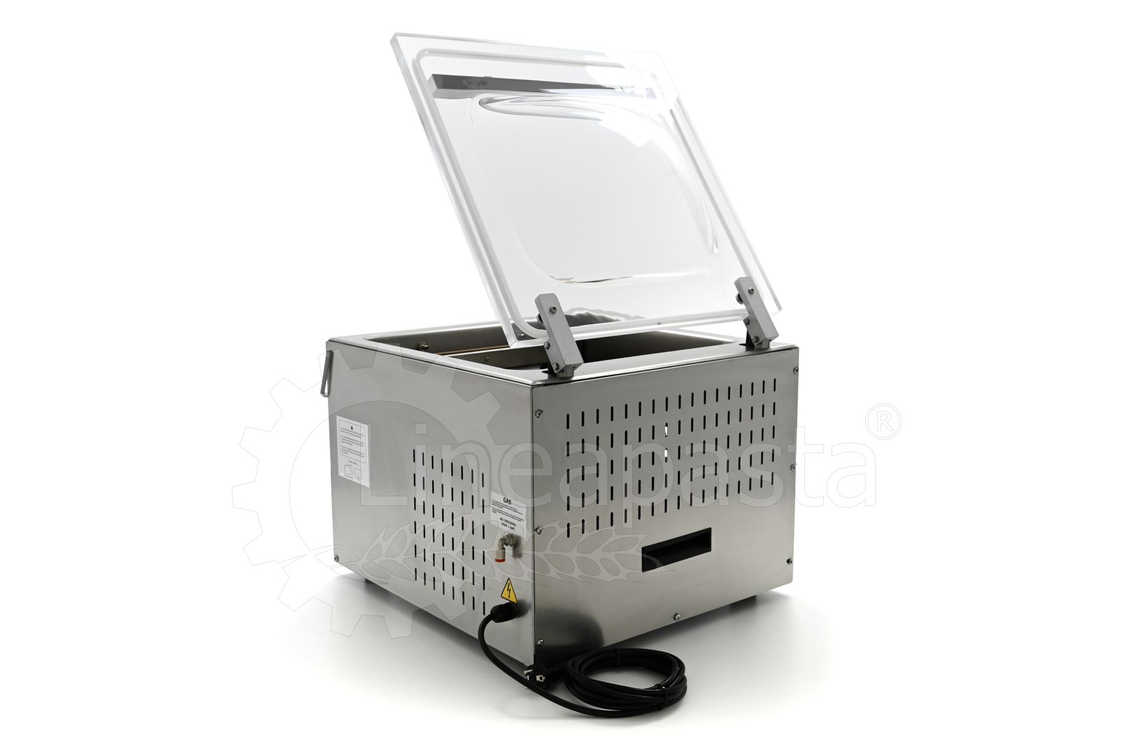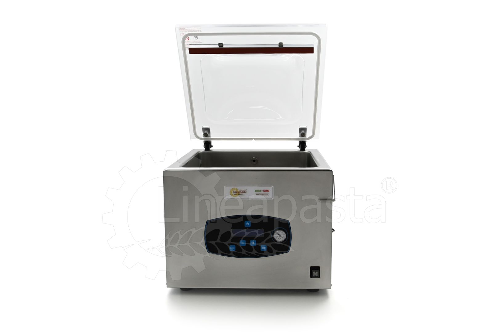 Machine d'emballage à cloche CC520 qui, grâce à l'accessoire pour travailler sous atmosphère modifiée, permet de conditionner des pâtes fraîches. Adapté aussi bien à un usage domestique qu'aux épiceries fines, supermarchés, bars ou cuisines professionnelles, il permet le conditionnement sous vide de divers aliments. Le modèle CC520 est équipé d'une barre de soudure de 52 cm, d'un capteur de vide et d'un vacuomètre conçu pour régler le pourcentage de vide dans le récipient. Ce modèle de machine d'emballage peut être personnalisé selon les besoins de production du client, en effet il permet l'installation d'une barre de coupe des déchets, d'une barre à double soudure ou l'installation d'un système à atmosphère modifiée pour maintenir la forme, la consistance et la saveur des aliments. être emballé sous vide. Dans la machine d'emballage à cloche CC520, vous pouvez également installer un programme pour accélérer et simplifier les processus de marinage des aliments, une carte WiFi pour le diagnostic à distance et une surface inclinée pour les liquides. Il est possible d'implémenter une imprimante thermique pour étiquettes alimentaires, une deuxième barre de soudure et un bouton Soft Air externe pour réguler l'intensité du flux d'air de retour. La machine d'emballage CC520 est composée d'une structure en acier inoxydable et d'un couvercle en polycarbonate transparent, qui permettent de nettoyer facilement les différents composants et garantissent une utilisation durable dans le temps.