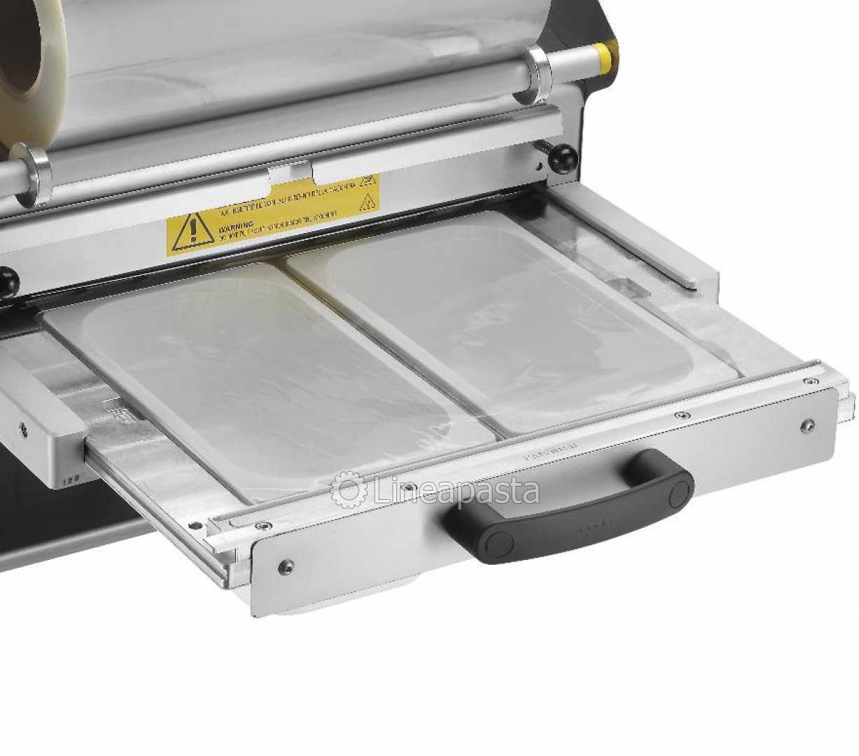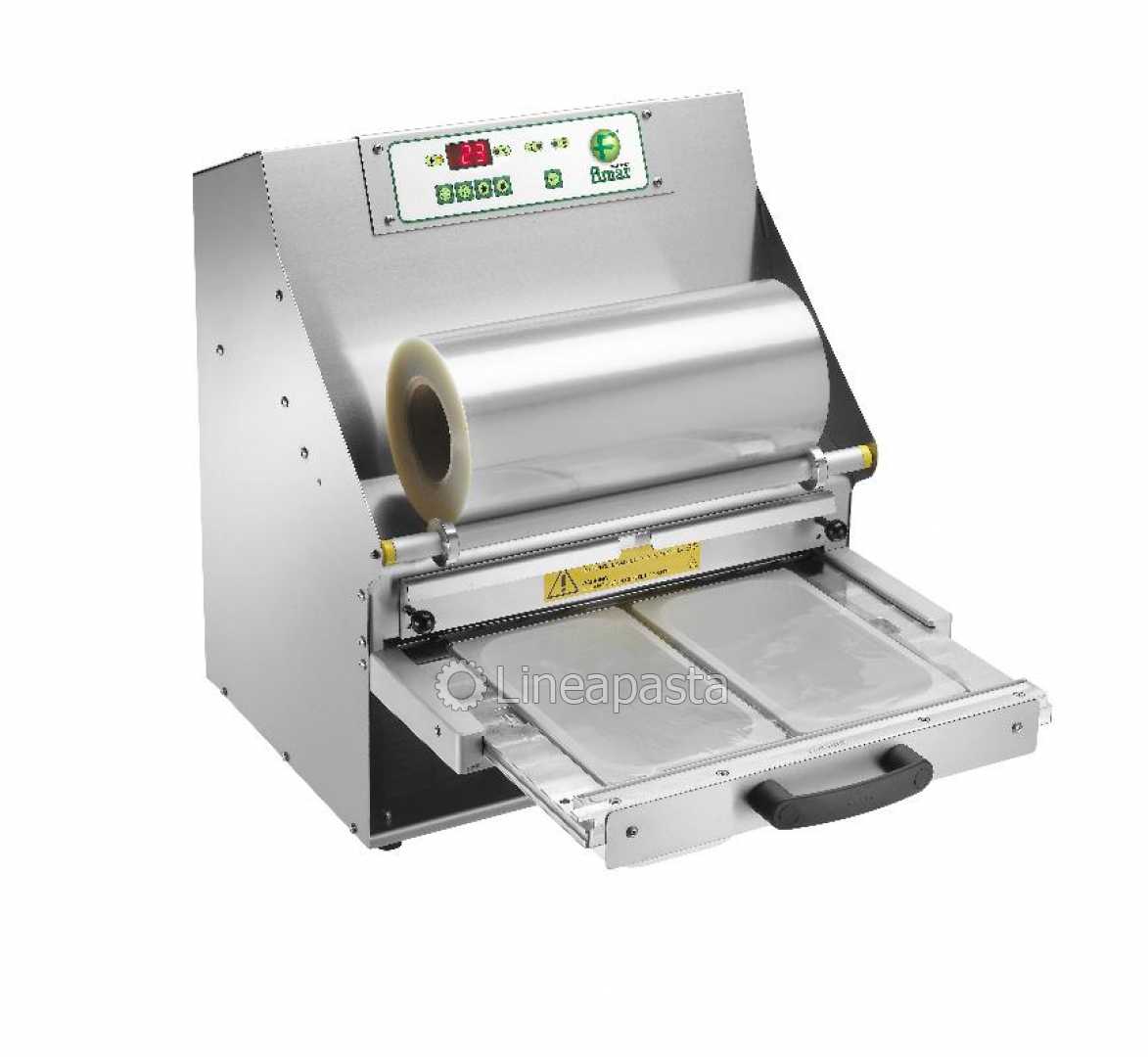 Thermoscelleuse alimentaire pour sceller de manière pratique et hygiènique les aliments dans les contenants afin de maintenir l'odeur et le gout mais sans prolonger la conservation. Toutes les machines sont construites en acier inox, avec une plaque raccordée pour éviter les brulures, entrainement automatique du film sans aucune aide manuelle, controle electronique de la température de soudure pour sceller parfaitement les contenants. Les modéles TSA sont avec un scellement automatique et sont dotés d'un unique tampon bereveté avec diverses combinaisons de diemnsions pour les diverses tipologie de contenants.