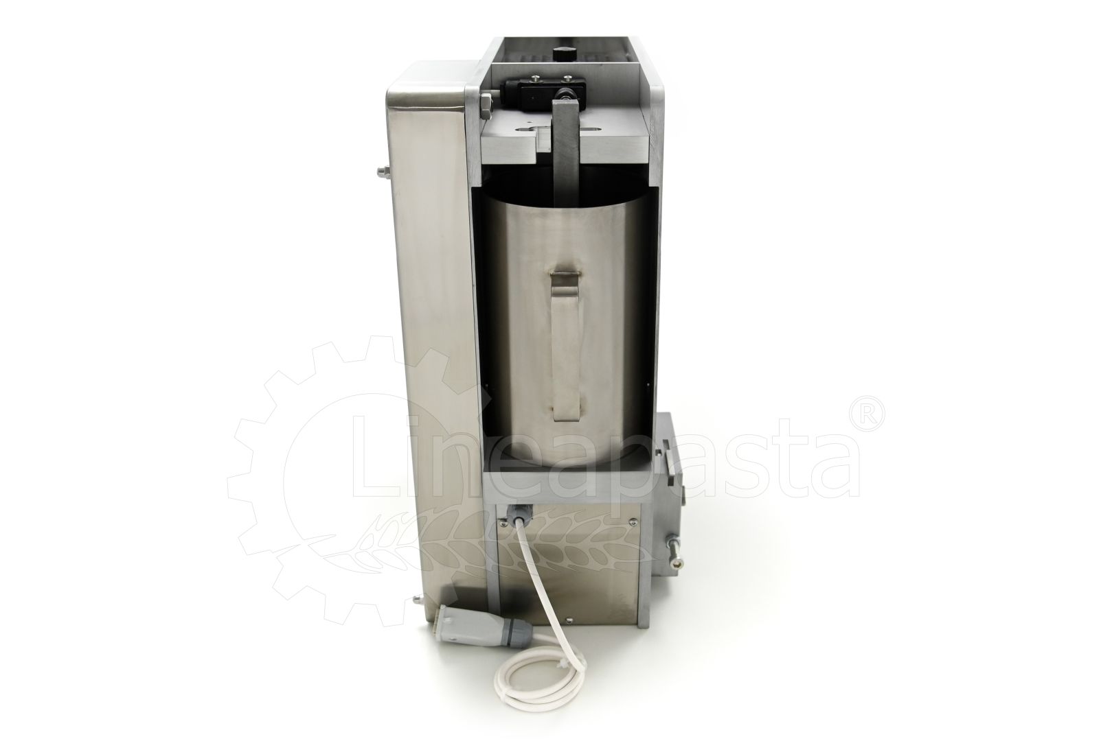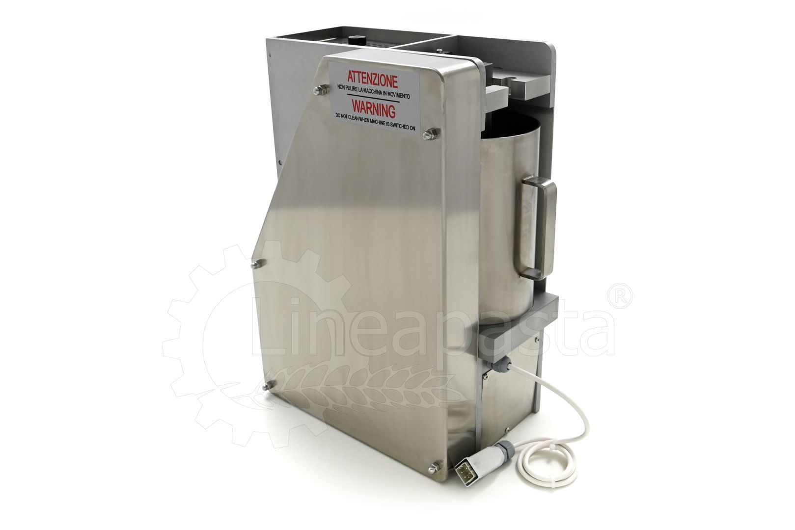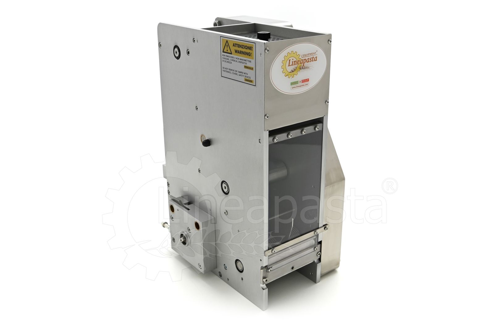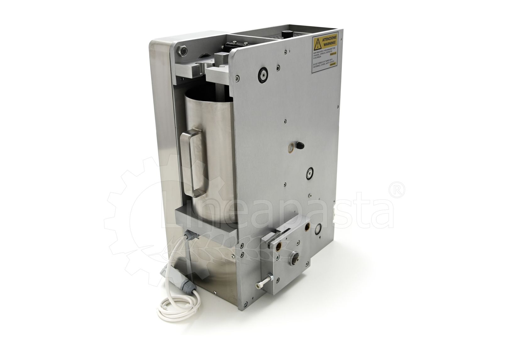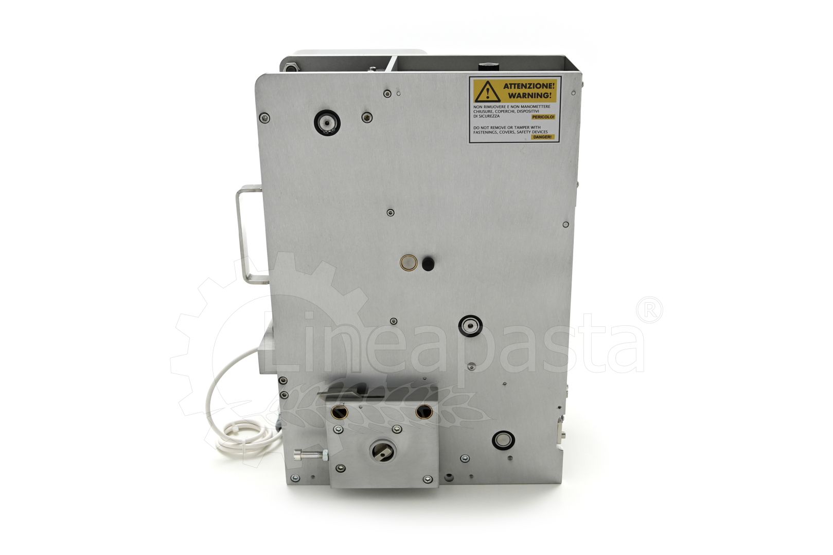 Le groupe gnocchi avec système à piston peut être combiné avec les modèles Monferrina P3, P6, P12, P.Nuova, Nina, Pidue et Cilindro, et permet de produire des gnocchis de pommes de terre de différentes tailles. Le groupe utilise le moteur de la machine à laquelle il est relié; le mélange de pommes de terre fraîches, préparé séparément (par exemple avec l'utilisation d'un mélangeur planétaire) est ensuite inséré dans le cylindre en acier inoxydable sur l'unité de gnocchi. La pâte est poussée par un piston dans la coupelle qui, selon la taille du trou choisi, déterminera la taille des gnocchis. Le gobelet standard fourni avec la machine a un trou de 17 mm de diamètre, mais des gobelets supplémentaires de Ø7, 12 ou 14 mm sont disponibles sur demande. Il est également possible d'intervenir sur le rayage du gnocco à l'aide d'un bouton, ce qui vous permettra d'obtenir des gnocchis de rayés à complètement lisses. La structure externe est en aluminium anodisé et les parties en contact avec la pâte sont en acier inoxydable. Il est équipé d'un panneau de commande et est conforme aux réglementations en vigueur en matière de prévention des accidents.
