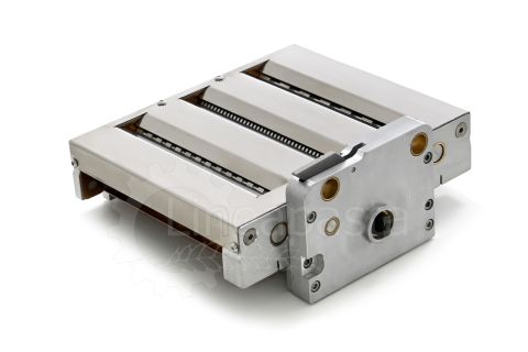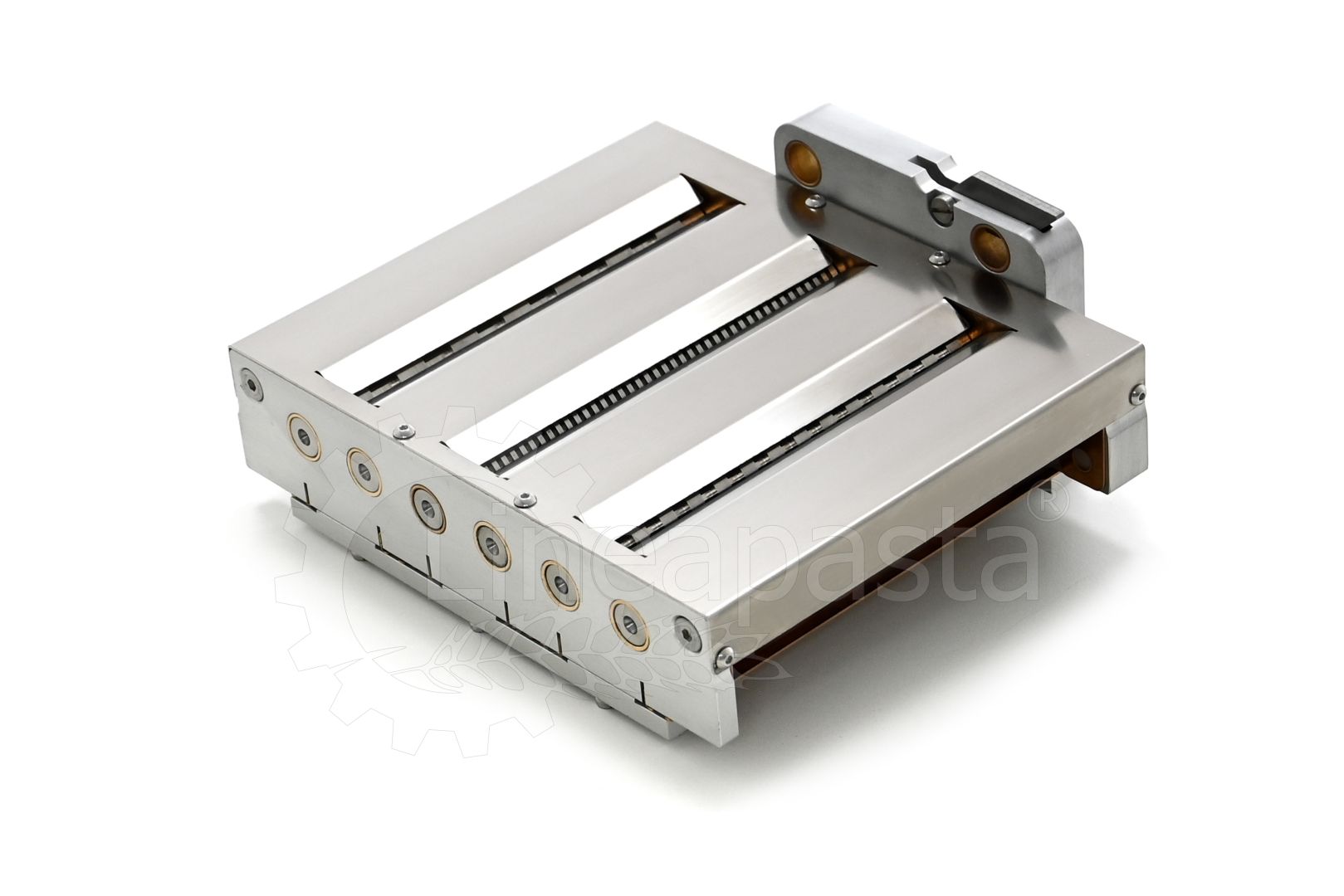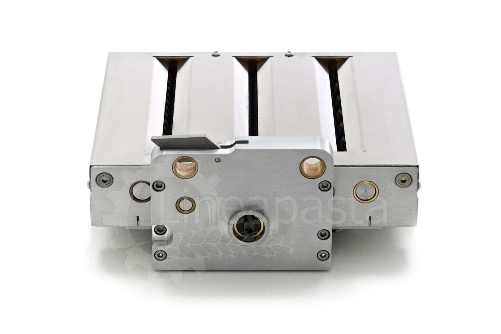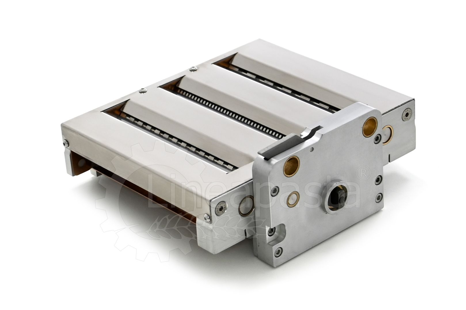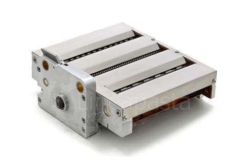 Groupe tagliatelle combinable avec les modèles Monferrina P.Nuova et Cilindro, disponibles dans les versions 170 mm (pour les modèles P.Nuova et Cilindro) et 340 mm (exclusivement pour le modèle Cilindro). Le groupe tagliatelle vous permet de couper les lasagnes en trois formes de pâtes longues différentes: tagliolini de 2 mm, tagliatelle de 6 mm et pappardelle de 12 mm. Cet accessoire ne nécessite pas d'alimentation externe mais utilise le moteur de la machine auquel il doit être relié via un raccord.