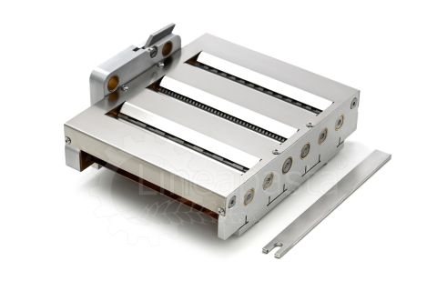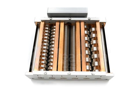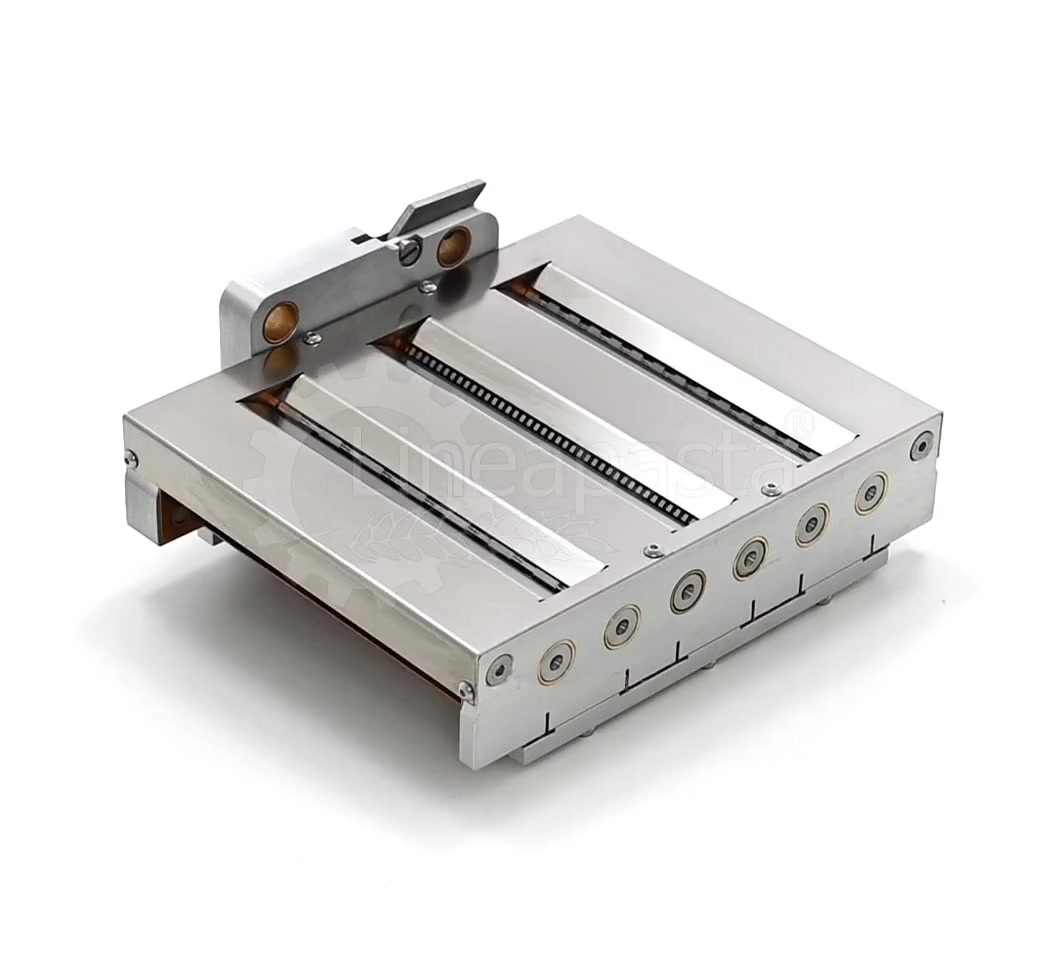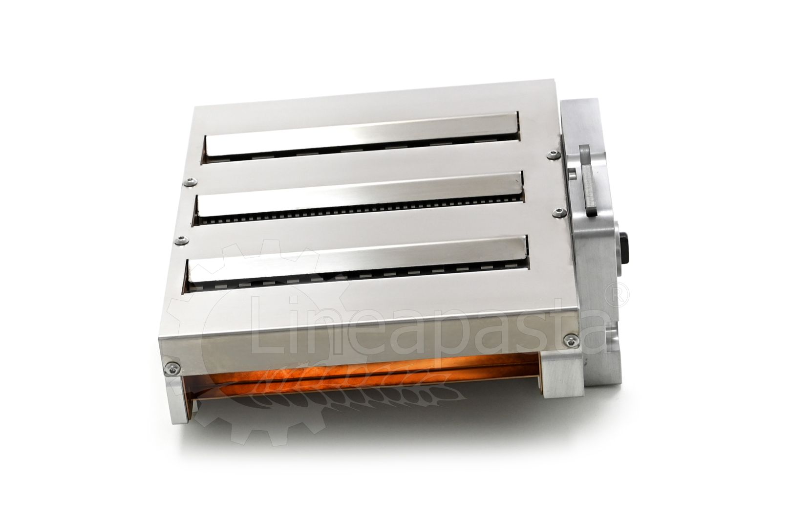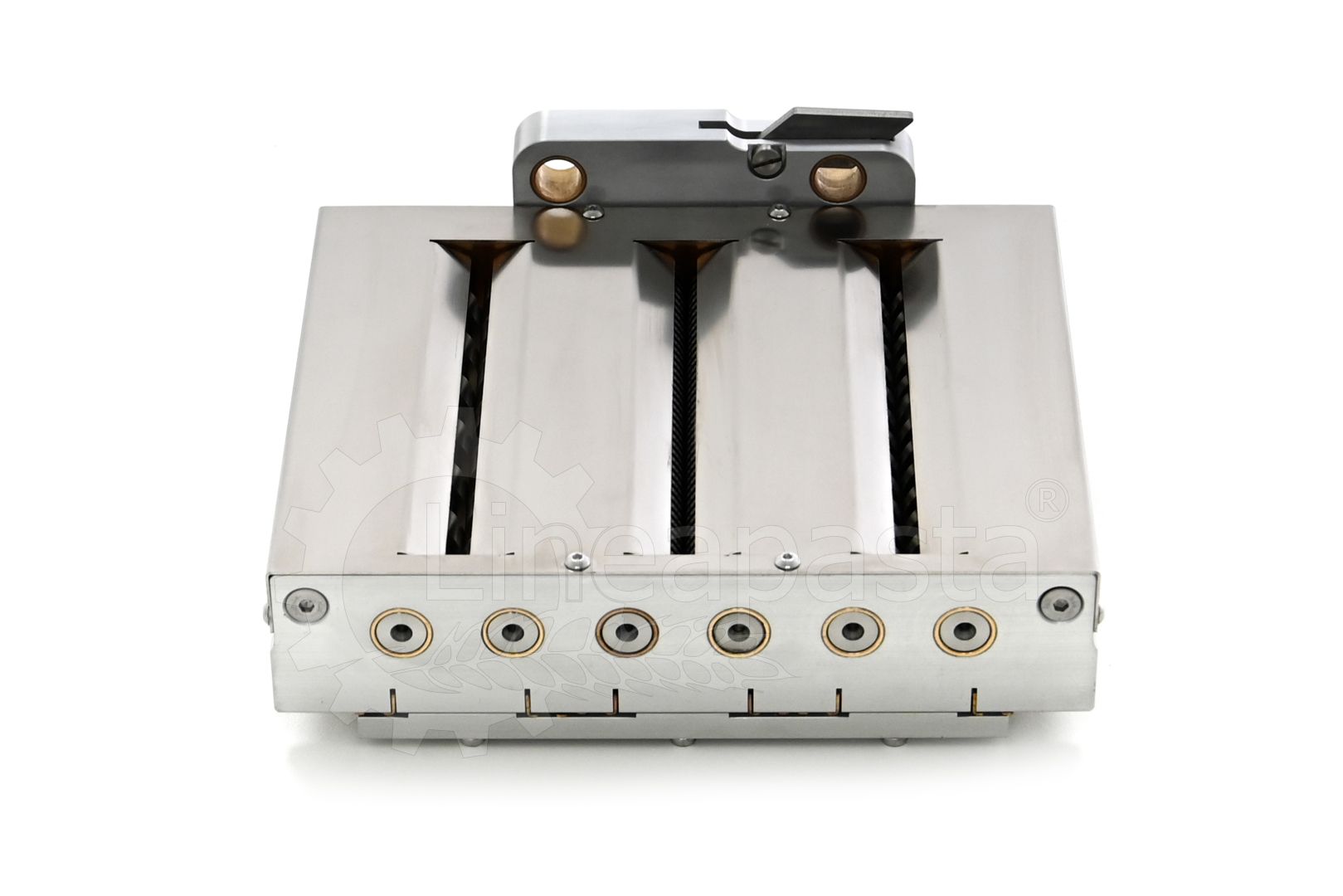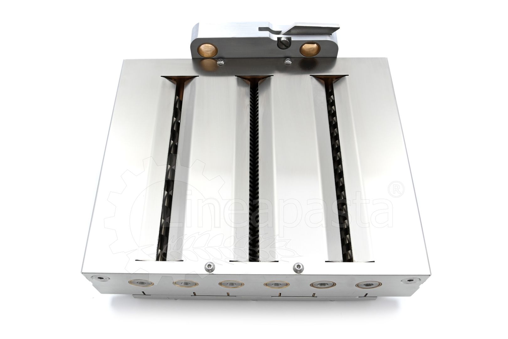 Groupe tagliatelle combinable avec les modèles Monferrina P.Nuova et Cilindro, disponibles dans les versions 170 mm (pour les modèles P.Nuova et Cilindro) et 340 mm (exclusivement pour le modèle Cilindro). Le groupe tagliatelle vous permet de couper les lasagnes en trois formes de pâtes longues différentes: tagliolini de 2 mm, tagliatelle de 6 mm et pappardelle de 12 mm. Cet accessoire ne nécessite pas d'alimentation externe mais utilise le moteur de la machine auquel il doit être relié via un raccord.