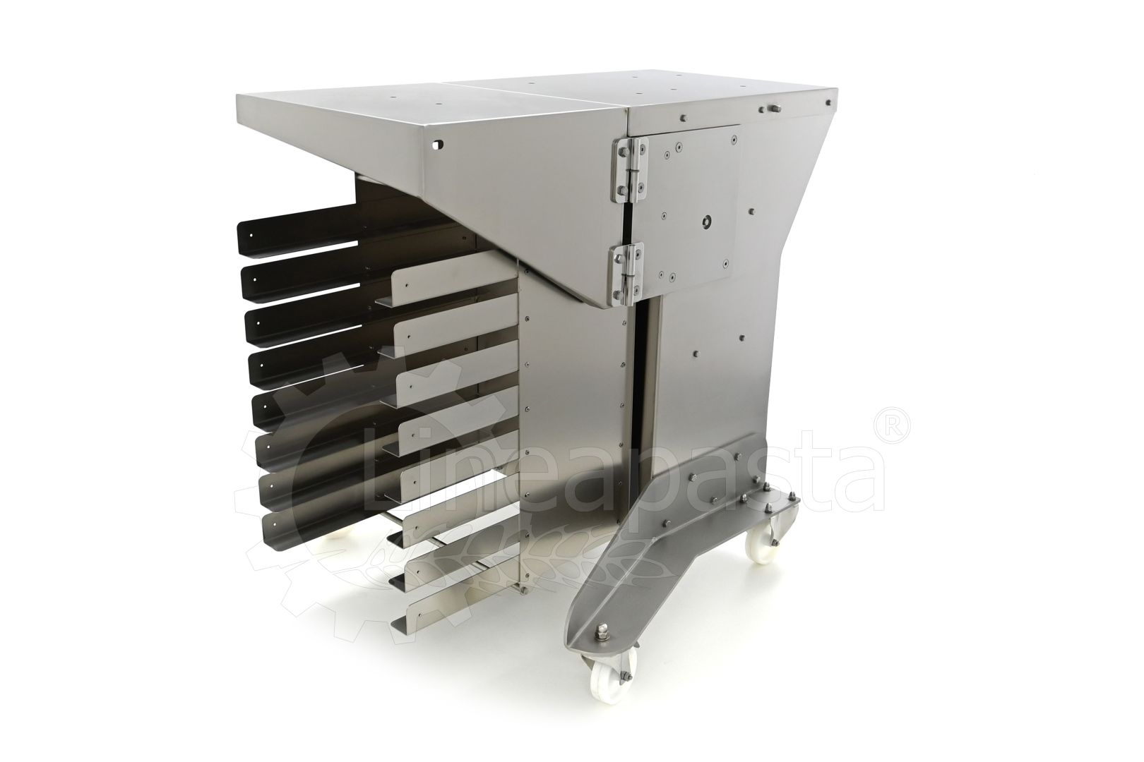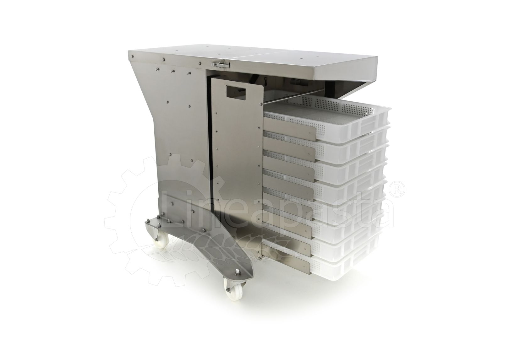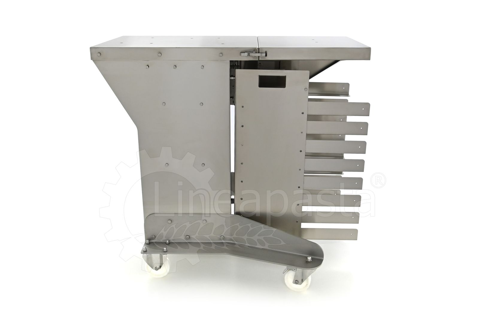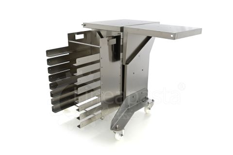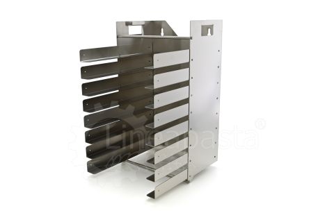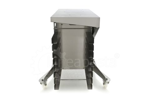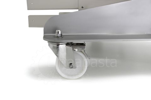 Chariot à pâtes entièrement réalisé en acier inox, il est conçu pour optimiser et accélérer la production de pâtes courtes, longues et farcies. Le chariot est équipé d’une étagère avant pivotante, utile comme point d’appui si nécessaire, et une étagère arrière où vous pouvez placer la machine avec laquelle vous voulez travailler. Le plan d’appui est monté sur une structure équipée de roues avec frein, à laquelle est intégré un siège pratique pour les clés de fixation fournies. Le chariot à pâtes est équipé d’une grille pouvant accueillir jusqu’à 8 bacs percés cm 60x40x7h, qui peut être démonté de la structure principale pour faciliter le nettoyage.