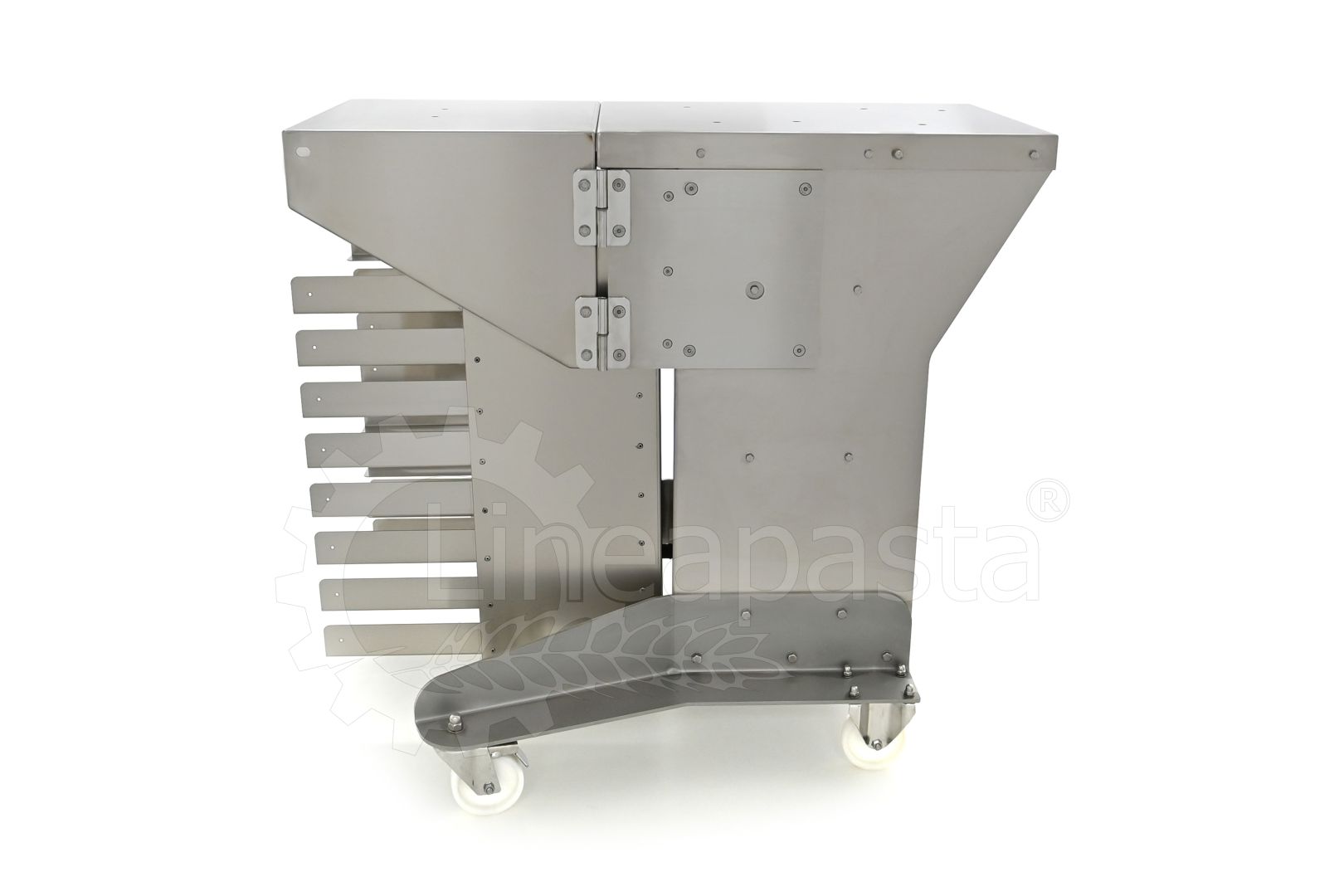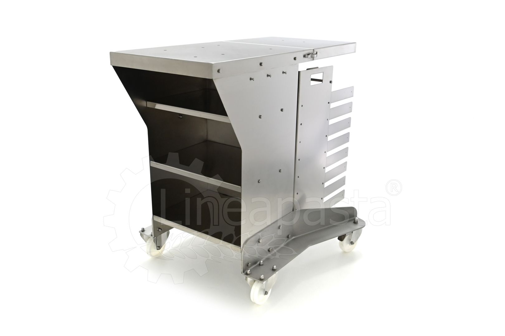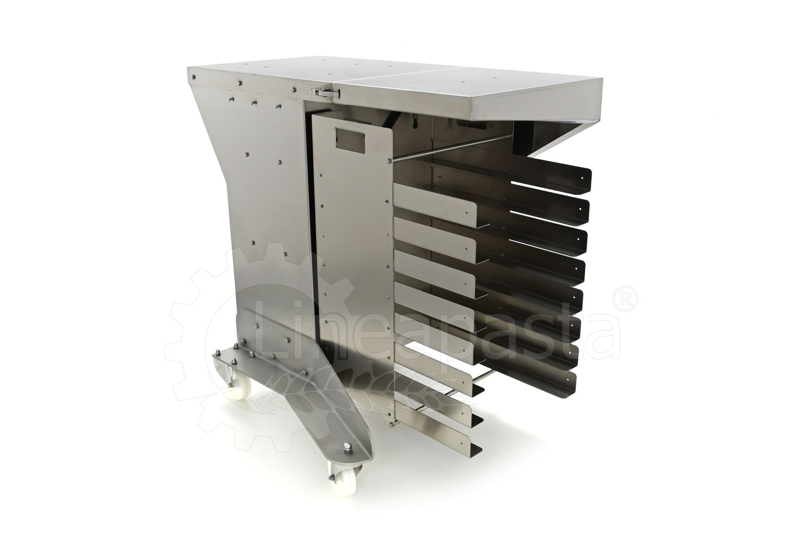 Chariot à pâtes entièrement réalisé en acier inox, il est conçu pour optimiser et accélérer la production de pâtes courtes, longues et farcies. Le chariot est équipé d’une étagère avant pivotante, utile comme point d’appui si nécessaire, et une étagère arrière où vous pouvez placer la machine avec laquelle vous voulez travailler. Le plan d’appui est monté sur une structure équipée de roues avec frein, à laquelle est intégré un siège pratique pour les clés de fixation fournies. Le chariot à pâtes est équipé d’une grille pouvant accueillir jusqu’à 8 bacs percés cm 60x40x7h, qui peut être démonté de la structure principale pour faciliter le nettoyage.