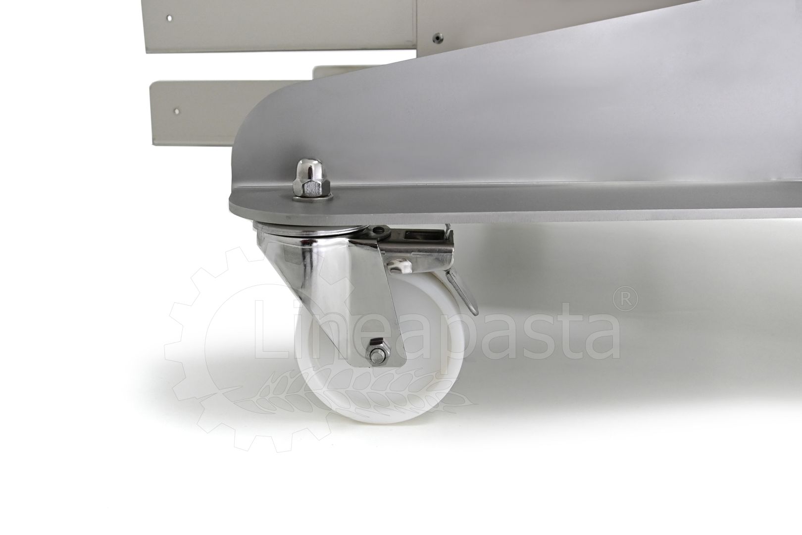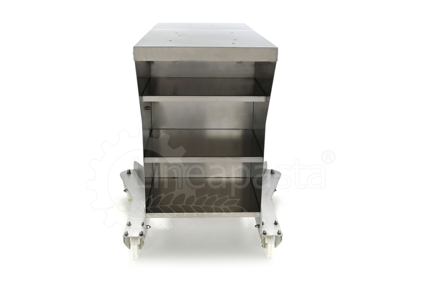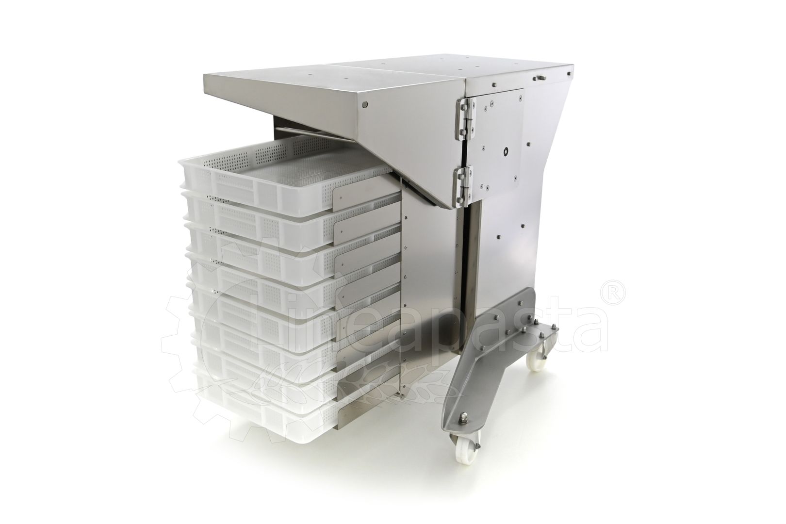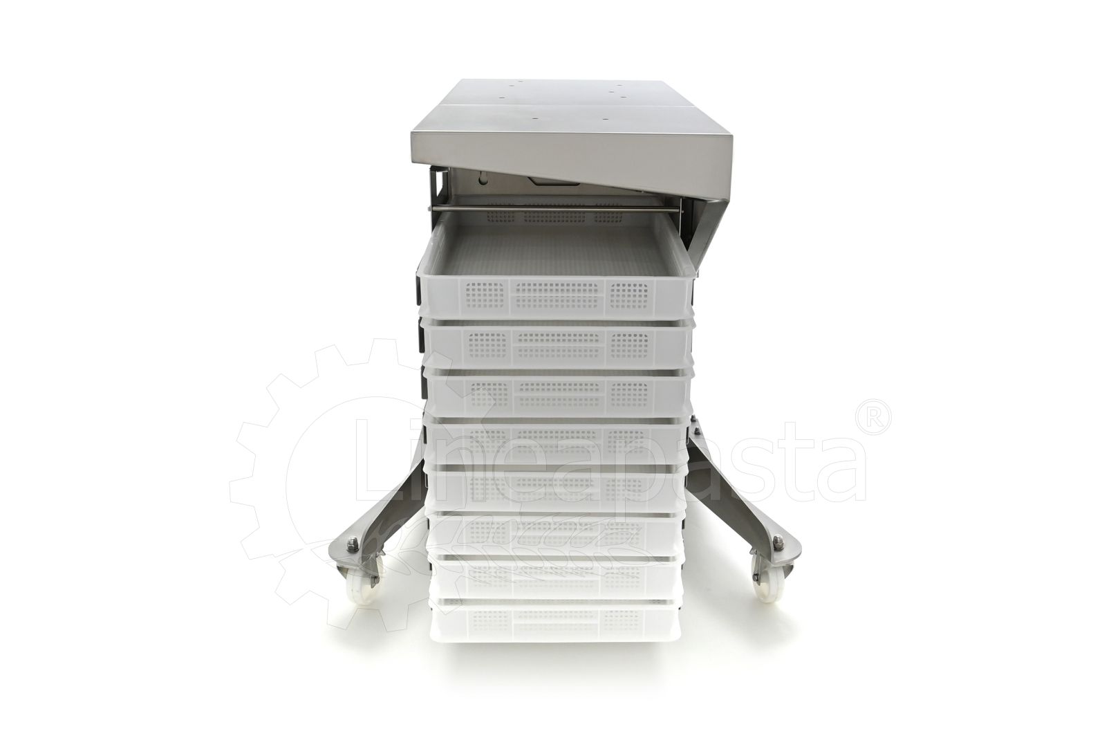 Chariot à pâtes entièrement réalisé en acier inox, il est conçu pour optimiser et accélérer la production de pâtes courtes, longues et farcies. Le chariot est équipé d’une étagère avant pivotante, utile comme point d’appui si nécessaire, et une étagère arrière où vous pouvez placer la machine avec laquelle vous voulez travailler. Le plan d’appui est monté sur une structure équipée de roues avec frein, à laquelle est intégré un siège pratique pour les clés de fixation fournies. Le chariot à pâtes est équipé d’une grille pouvant accueillir jusqu’à 8 bacs percés cm 60x40x7h, qui peut être démonté de la structure principale pour faciliter le nettoyage.