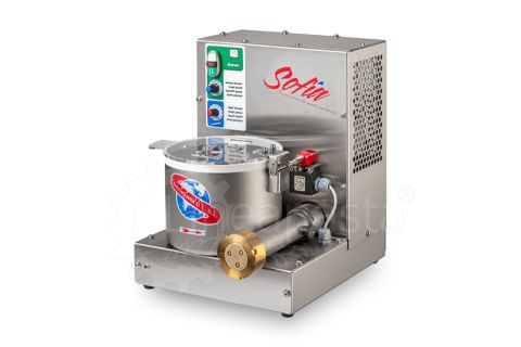 Machine à pâtes fraîches Sofia avec mélangeur centrifuge, adapté à la production de différents types de pâtes pour un usage domestique ou professionnel. Idéal pour les mélanges farinés et sans gluten, Sofia peut produire jusqu’à 5 kg de pâte par cycle. La presse avec cuve mélangeuse est de type centrifuge et permet un mélange plus rapide et une hydratation de la pâte statique, en diminuant l’oxydation de la pâte et en maintenant ainsi la couleur originale de la pâte. La machine est fournie avec quatre filières en bronze pour réaliser maccheroni rigati 8mm, fettuccine 8mm, caserecce et fusilli 3P. Sofia est dotée d’un système de sécurité qui, grâce à une carte électronique de dernière génération, permet d’inverser pendant 15 secondes le mouvement de rotation et d’arrêter la machine en cas de malaxage incorrect.