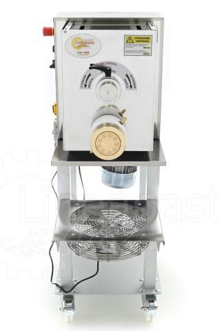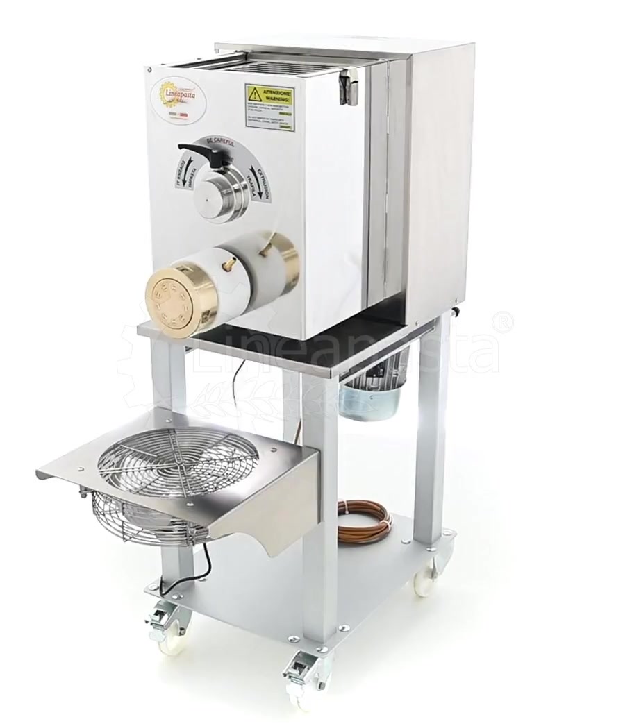 En plus du coupe-pâtes, 4 filières standards en laiton-bronze choisies dans le catalogue, un chariot avec ventilateur et un bac percé sont inclus. Des filières supplémentaires, ainsi que des filières spéciales en PTFE (téflon), des filières pour penne, la filières busiata, etc. peuvent être achetées séparément.