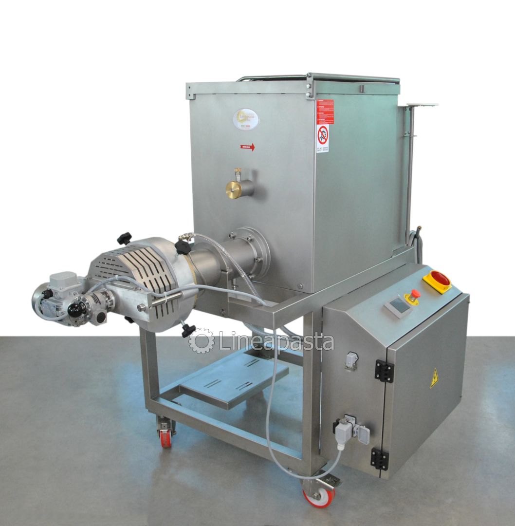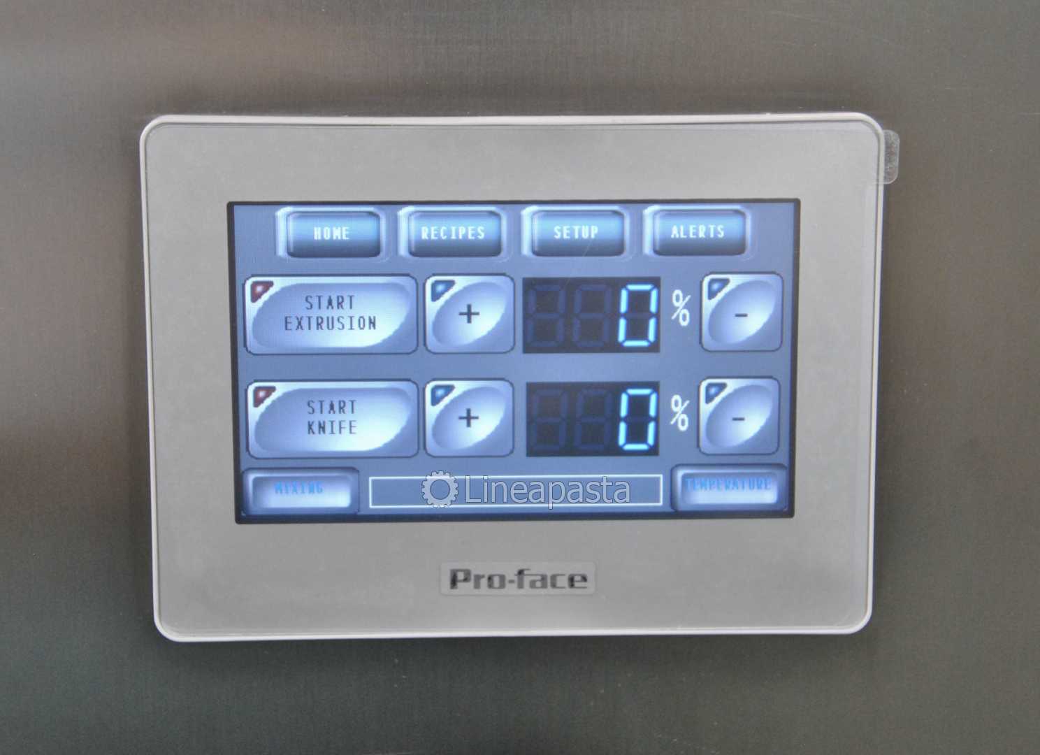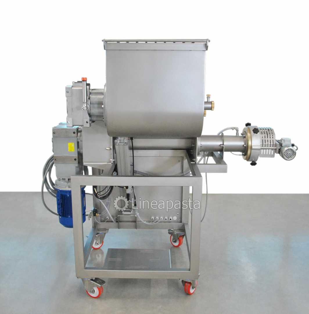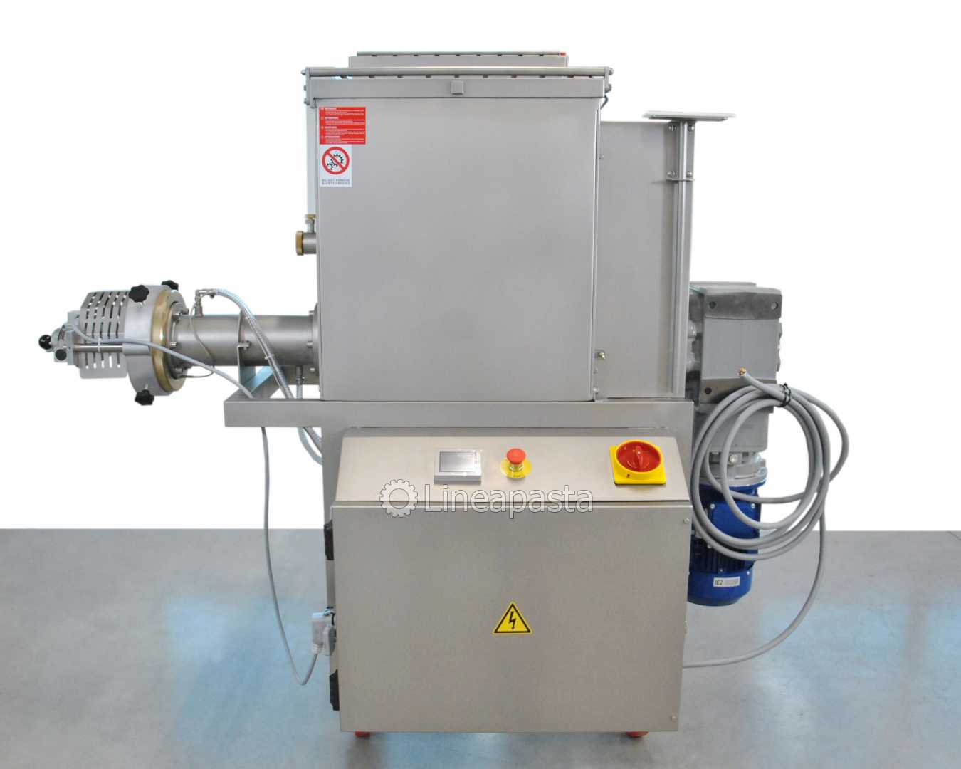 La machine à pâtes PS 200 est une machine à pâtes idéale pour la production industrielle. Elle a une production horaire de 200 Kg/h et la capacité du réservoir est de 50 Kg. La structure est entièrement en acier inoxydable Aisi304. Le cylindre d'extrusion est amovible pour faciliter le nettoyage ou réparation/remplacement, et est équipé d'un système de refroidissement par eau grâce auquel il est possible de travailler en continu sans problèmes de température. La machine à pâtes fraîches PS 200 est équipée d'un couteau rotatif électronique et est conçue pour monter le système d'extrusion sous vide. La machine est équipée d'un système de contrôle à écran tactile avec la possibilité de charger et de personnaliser des recettes en fonction de vos besoins de production, personnaliser la vitesse d'extrusion, la vitesse du couteau et la température du cylindre d'extrusion.