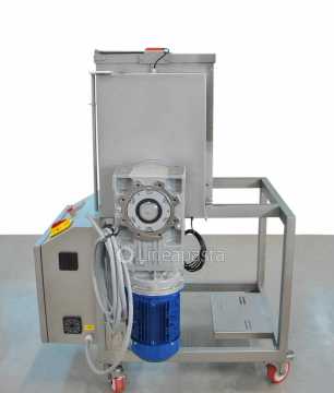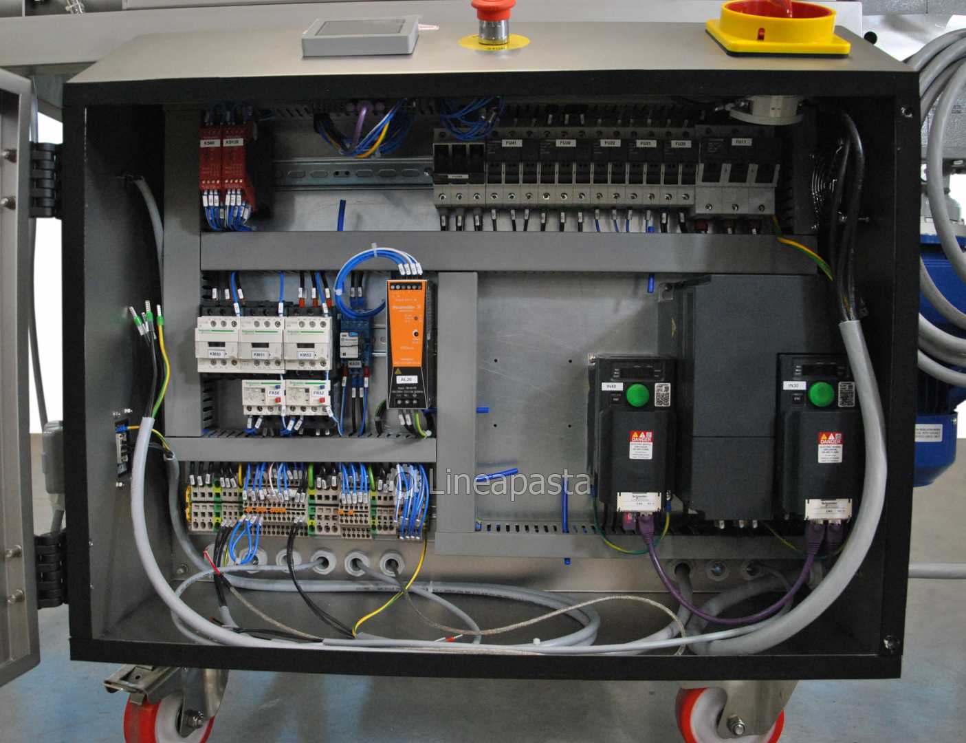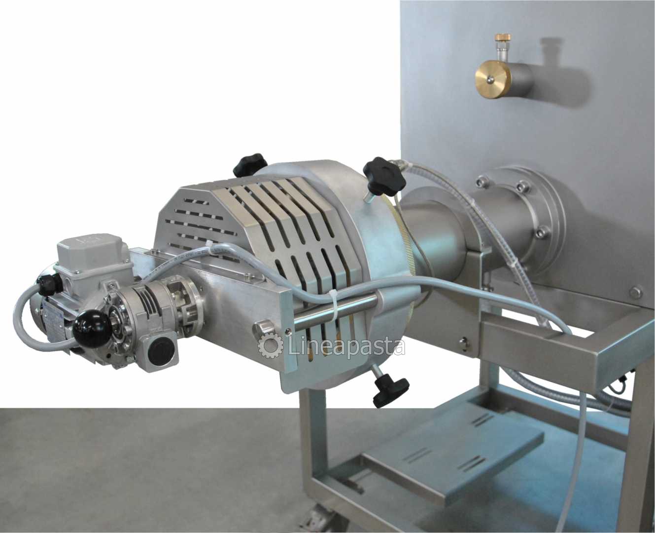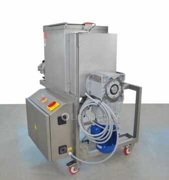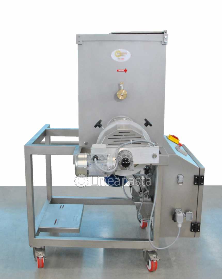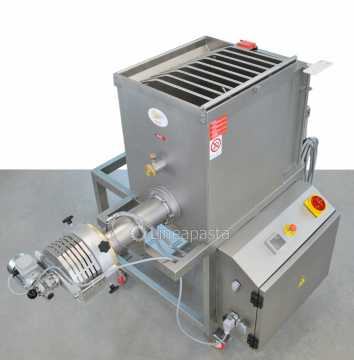La machine à pâtes PS 200 est une machine à pâtes idéale pour la production industrielle. Elle a une production horaire de 200 Kg/h et la capacité du réservoir est de 50 Kg. La structure est entièrement en acier inoxydable Aisi304. Le cylindre d'extrusion est amovible pour faciliter le nettoyage ou réparation/remplacement, et est équipé d'un système de refroidissement par eau grâce auquel il est possible de travailler en continu sans problèmes de température. La machine à pâtes fraîches PS 200 est équipée d'un couteau rotatif électronique et est conçue pour monter le système d'extrusion sous vide. La machine est équipée d'un système de contrôle à écran tactile avec la possibilité de charger et de personnaliser des recettes en fonction de vos besoins de production, personnaliser la vitesse d'extrusion, la vitesse du couteau et la température du cylindre d'extrusion.