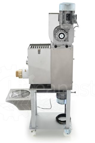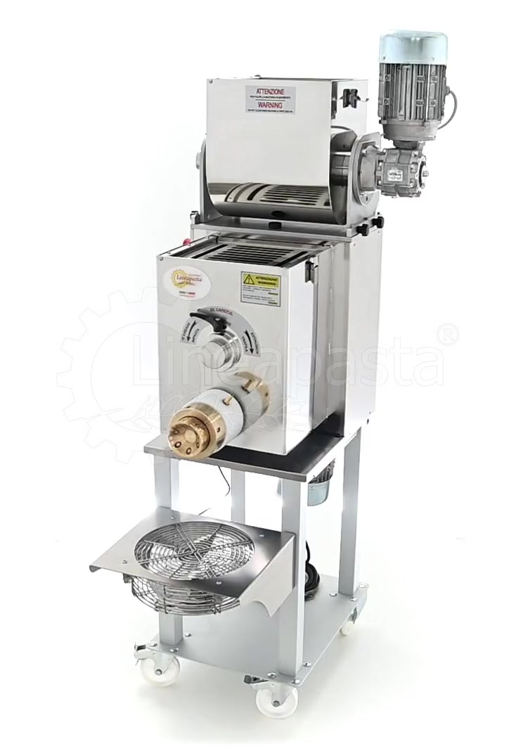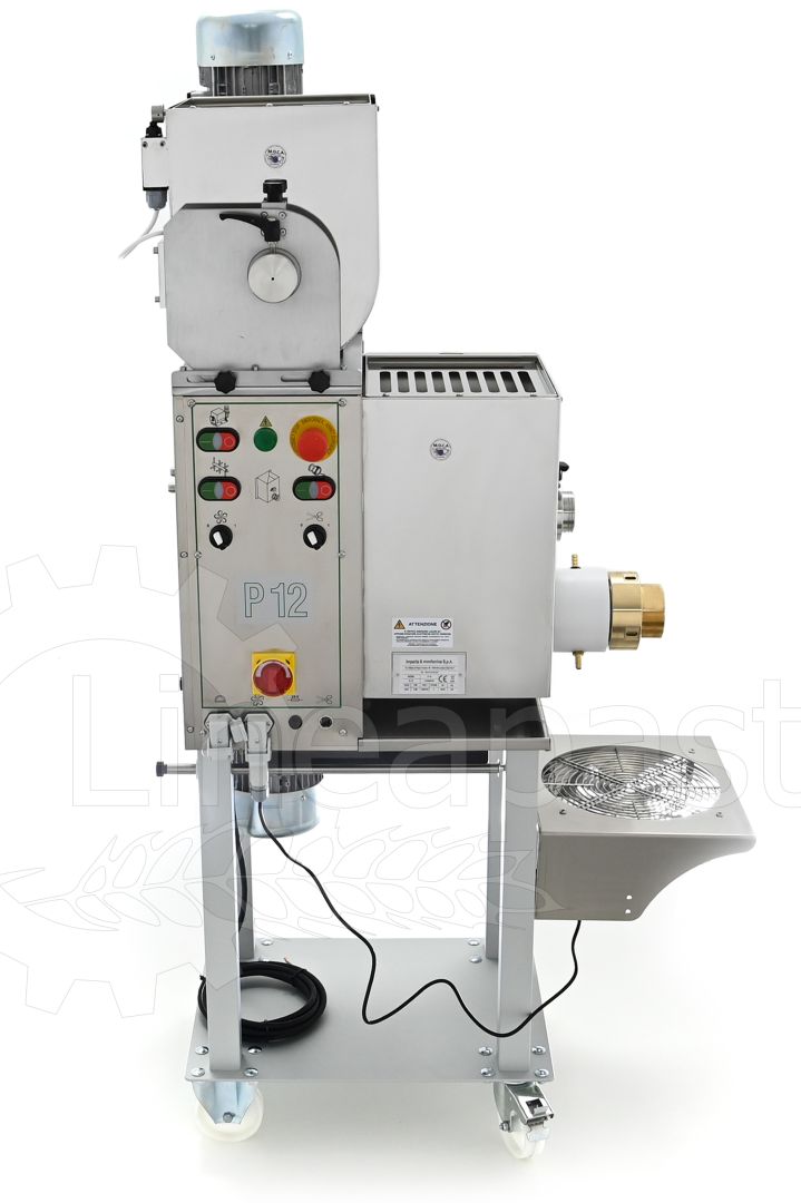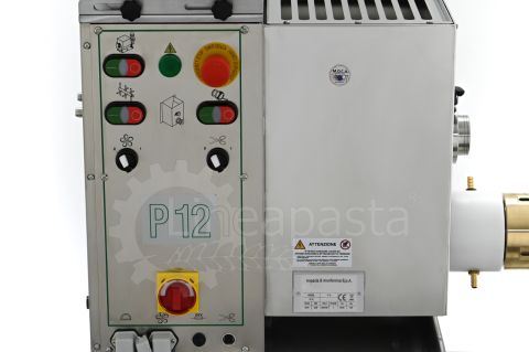 La Monferrina P12 est une machine automatique à double cuve de moyenne production, recommandée pour les restaurants, les fermes, les pizzerias, les épiceries fines et les activités de vente et de dégustation de pâtes fraîches. C'est une machine très fiable et adaptée au traitement de tout type de farine/semoule et de pâte avec ou sans œufs. La double cuve permet une production en cycle continu car il est possible de pétrir dans la cuve supérieure et d'extruder simultanément avec celle inférieure. Avec un simple changement de filière, il est possible de produire des pâtes courtes et longues et, grâce au coupe-pâtes rotatif automatique, la production de pâtes courtes devient encore plus rapide. De plus, le système de refroidissement par eau dont est équipée la machine permet de poursuivre la production sans interruption puisque la température du cylindre d'extrusion et celle de la filière restent constantes.