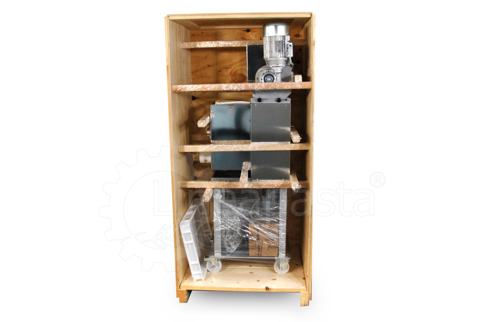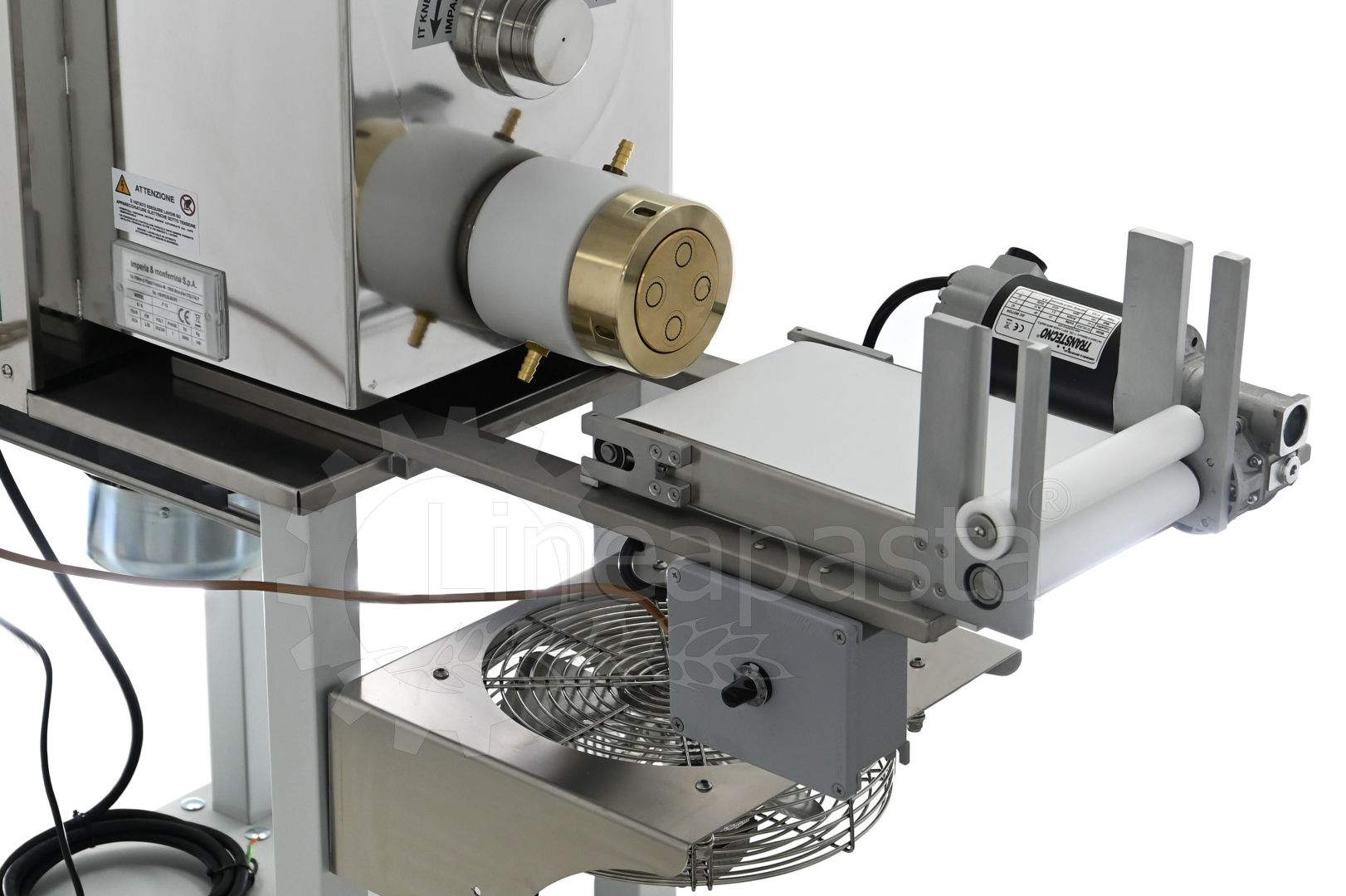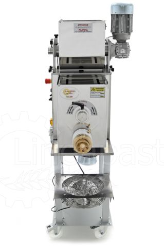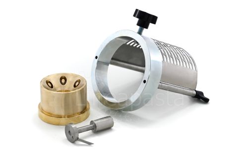 En plus du coupe-pâtes, 4 filières standards en laiton-bronze choisies dans le catalogue, un chariot avec ventilateur et un bac percé sont inclus. Des filières supplémentaires, ainsi que des filières spéciales en PTFE (téflon), des filières pour penne, la filières busiata, etc. peuvent être achetées séparément.