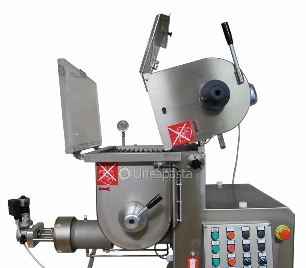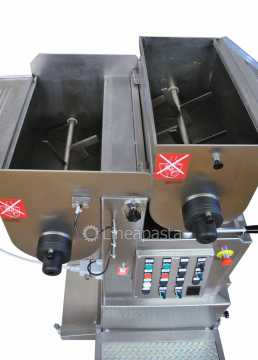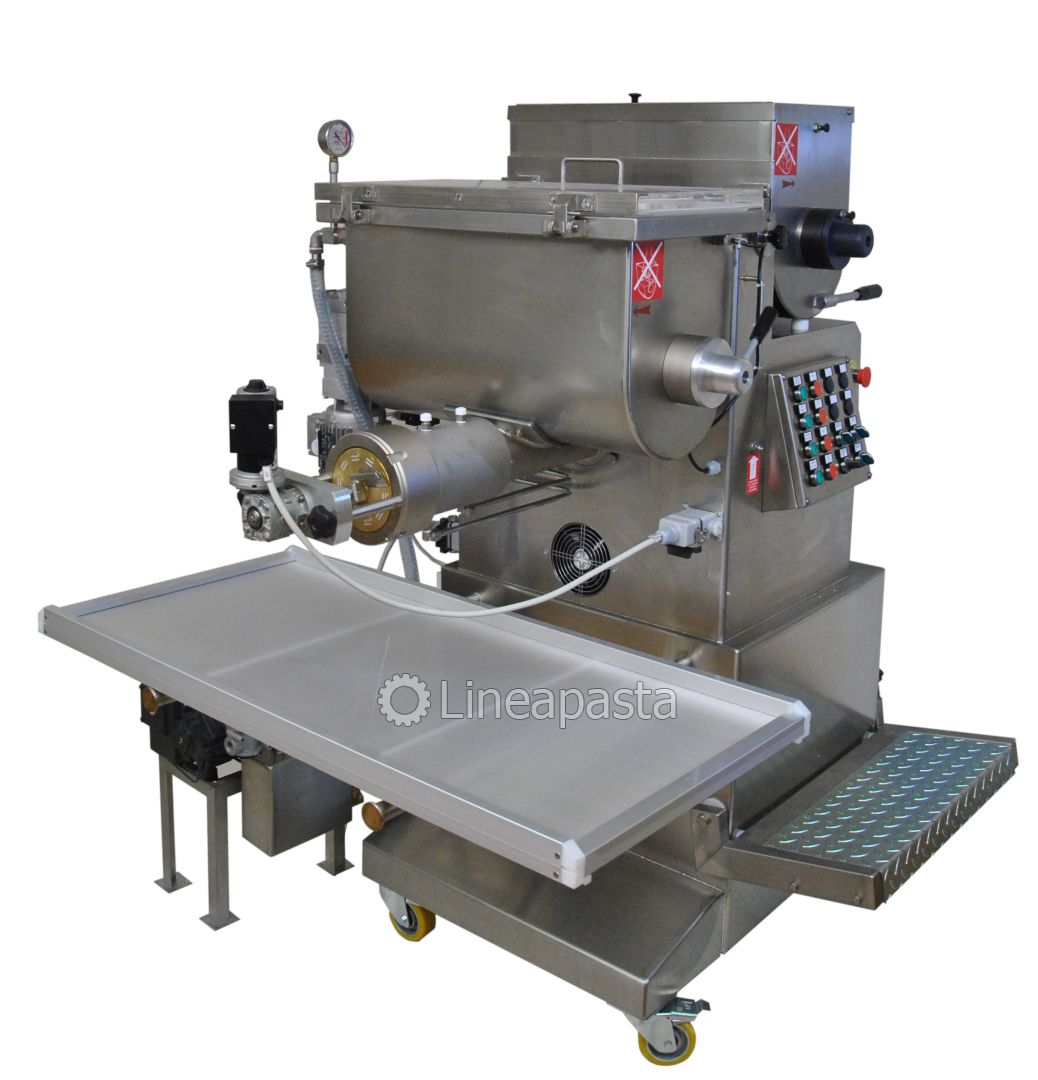 La machine à pâtes fraîches avec sous vide MAC 100S est un machine hautement fiable avec un fonctionnement simple et efficace; elle est équipée avec double cuve qui permet de pétrir et d'extruder en même temps et donc permet une production à cycle continu de pâtes fraîches, courtes, longues et de pâte feuilletée que peuvent être réalisés avec tout type de farine ou semoule. La seconde cuve avec la cochlée est équipée d'un dispositif permettant de mélanger les ingrédients sous vide, particulièrement recommandé pour ceux qui souhaitent sécher les pâtes plus tard, car il permet d'obtenir un mélange plus homogène, sans noyau et plus résistant à la casse une fois séchées. De plus, le produit est plus coloré et sans bulles d'air. Les filières peuvent être fournies en laiton-bronze pour produire des pâtes plus rugueuses et plus poreuses, mieux adaptées à la rétention de la sauce, ou en PTFE (Teflon) pour des pâtes plus lisses et plus brillantes. Particulièrement conseillée pour les magasin et les laboratoires, cette machine est équipée d’un panneau de commande et construite entièrement en acier inox et est conformes aux règles de prevention des accidents et aux règles d'hygiène internationales. Elle est livrée avec un coupe-pâte automatique pour pâtes courtes avec variateur de vitesse avec des couteaux à 1, 2 et 4 lames et deux bacs percés.