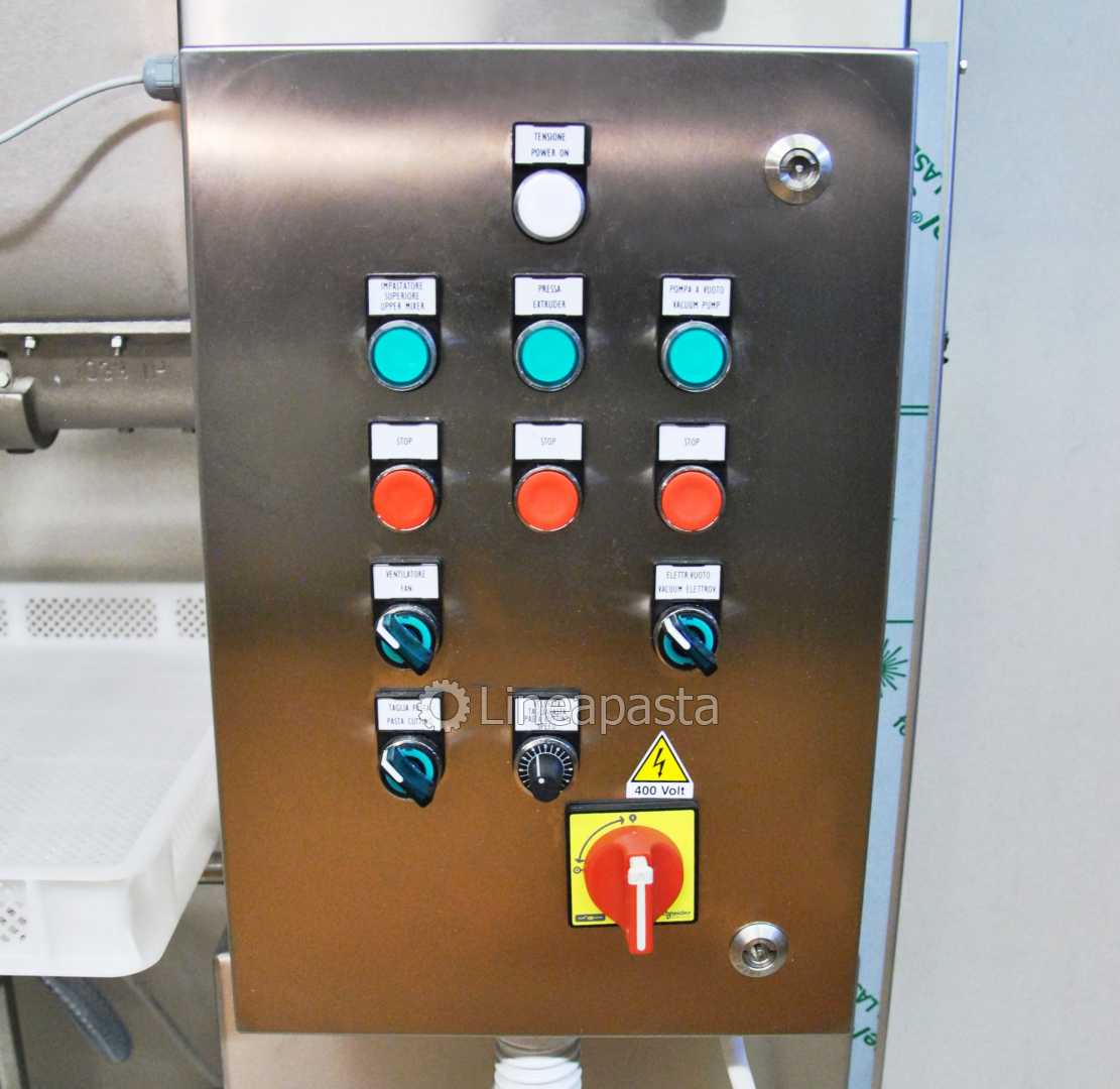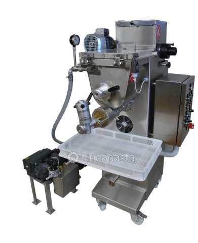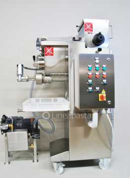 La machine à pâtes fraîches avec sous vide MAC 30S est un machine hautement fiable avec un fonctionnement simple et efficace; elle est équipée avec double cuve qui permet de pétrir et d'extruder en même temps et donc permet une production à cycle continu de pâtes fraîches, courtes, longues et de pâte feuilletée que peuvent être réalisés avec tout type de farine ou semoule. Elle est équipée d'un dispositif d'extrusion sous vide particulièrement recommandé pour ceux qui souhaitent sécher les pâtes plus tard, car il permet d'obtenir un mélange plus homogène, sans noyau et plus résistant à la casse une fois séchées. De plus, le produit est plus coloré et sans bulles d'air. Les filières peuvent être fournies en laiton-bronze pour produire des pâtes plus rugueuses et plus poreuses, mieux adaptées à la rétention de la sauce, ou en PTFE (Teflon) pour des pâtes plus lisses et plus brillantes. Particulièrement conseillée pour les magasin et les laboratoires, cette machine est équipée d’un panneau de commande et construite entièrement en acier inox et est conformes aux règles de prevention des accidents et aux règles d'hygiène internationales. La MAC 30S est livrée avec un coupe-pâte automatique pour pâtes courtes avec variateur de vitesse avec des couteaux à 1, 2 et 4 lames et deux bacs percés.