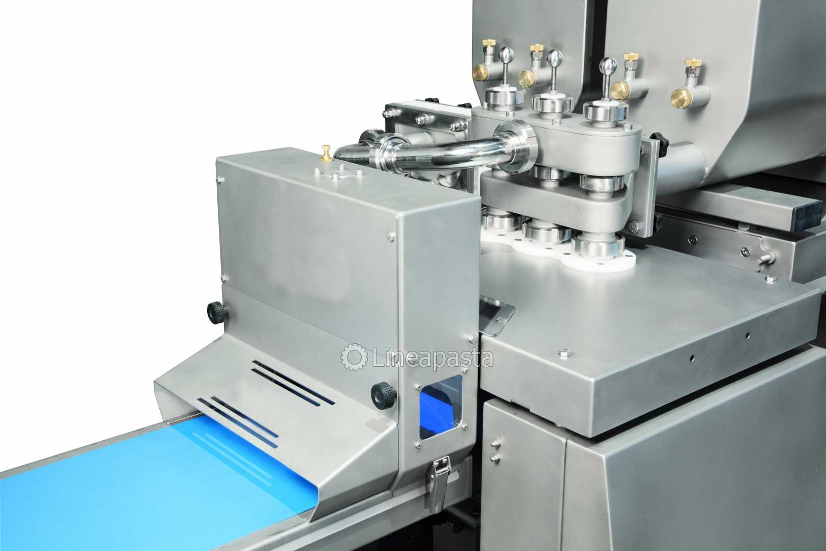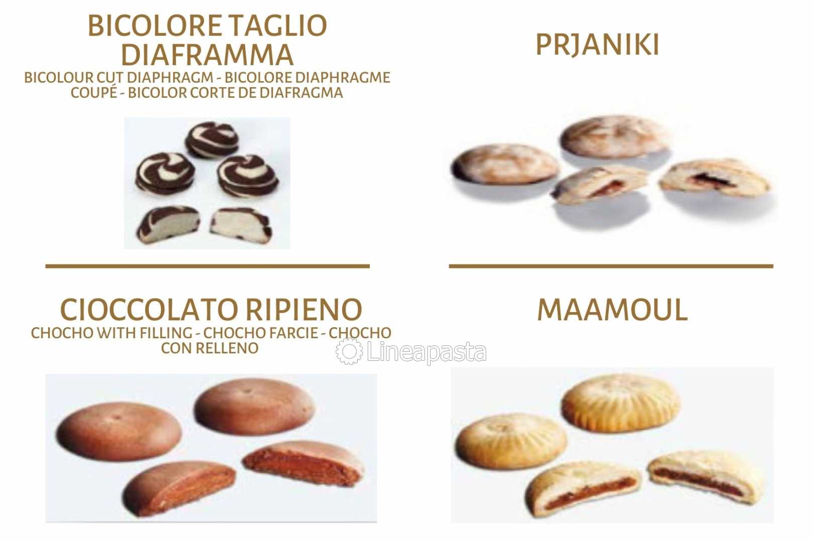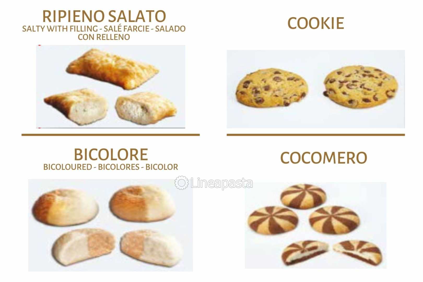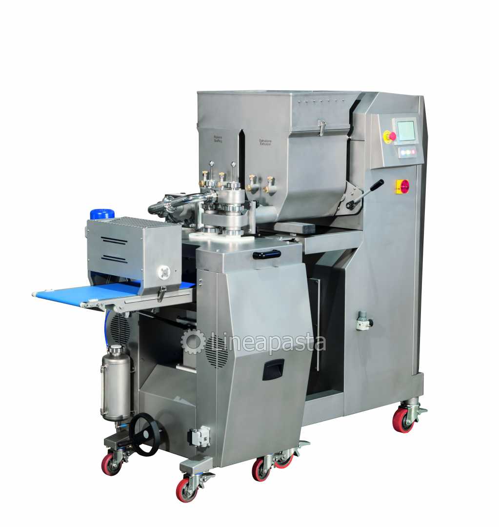 La MBS 250DV n'est pas seulement une machine à biscuits et barres monochromes, bicolores et tricolores, mais c'est avant tout une extrudeuse à vis pour produits sucrés et salés, farcis ou non, idéale pour la production de barres et biscuits ainsi que pour tout autre type de produit gastronomique de forme ronde, sphérique, cylindrique, avec une structure granulaire jusqu'à 1 cm de diamètre. C'est une machine à double cuve d'une capacité de 250 kg/h par cuve, idéale pour les laboratoires, les gastronomies et les entreprises de restauration qui souhaitent disposer d'une machine à fort potentiel à dimensions réduites, et qui souhaitent une production continue de différents types de produits allant du sucré au salé en utilisant une seule machine. Avec l'ajout de l'accessoire "troisième cuve", il est possible de produire des formats tricolores ou bicolores avec remplissage. L'accessoire "troisième cuve" au moyen d'un système de lobes permet un calibrage précis de la quantité de fourrage crémeux comme le nutella, la crème, la confiture et les fromages fondus. Dans les deux cuves, l'extrusion est alimentée par deux arbres de mélange qui pressent le mélange contre les vis d'extrusion pour rendre la vitesse d'extrusion aussi homogène que possible. Ce système à double arbre permet une production continue sans avoir à arrêter la machine pour remplir les cuves. Le MBS 250DV est idéal pour produire en continu des barres, des biscuits ronds farcies tels que Grisbi, biscuits, Maamoul, Kibbeh, ainsi que des produits salés tels que riz arancini, gnocchi, gnocchi farcis, boulettes de viande, canederli, etc. Avec cette machine, c'est possible produire des barres de différentes formes telles que des barres énergétiques et des craquelins qui avec le MBS 250DV peuvent être coupées automatiquement au moyen d'un système de coupe à guillotine automatique. De plus, il est possible de réaliser des biscuits roulés, des biscuits imprimés avec un moule personnalisé et des garnitures en vue sous une forme personnalisable. Grâce aux rouleaux à positionner sur la bande transporteuse, il est possible de personnaliser davantage le produit avec des décorations de surface. Vous pouvez éventuellement décorer les biscuits avec des stries de confiture ou d'autres revêtements. Enfin, avec des accessoires sur demande, il sera possible d'obtenir une forme sphérique parfaite avec un arrondisseur automatique, et de décorer la surface du produit avec du sucre ou des pralines à l'aide d'un accessoire plumeau. La production peut également être davantage automatisée grâce à des bandes transporteuses à dépôt automatique rétractable qui rempliront les plateaux de manière automatique et ordonnée pour être prêts à être insérés dans le four. La grande polyvalence de cette machine lui permet de s'adapter parfaitement aux besoins de production en créant un ou plusieurs produits adaptés au client qui détermine les dimensions et les caractéristiques du produit. La machine à biscuits MBS 250DV est équipée d'un dispositif d'extrusion à valeur variable, d'un dispositif d'injection de remplissage à vitesse variable pour régler la quantité souhaitée de remplissage, d'un dispositif de coupe à diaphragme minuté et d'un dispositif de coupe à guillotine. Il est entièrement construit en acier inoxydable certifié AISI 304 et toutes les pièces en contact avec le produit sont facilement démontables pour un lavage efficace même au lave-vaisselle. Enfin, la machine est conforme aux directives de la norme européenne CE.