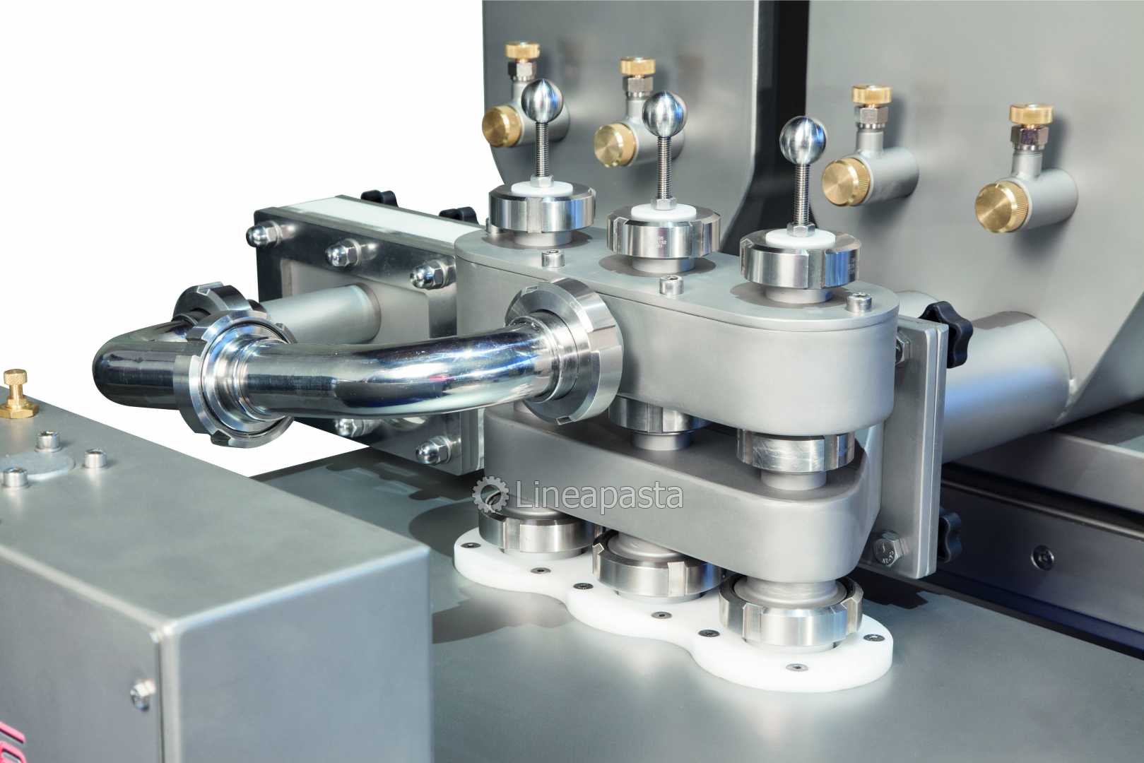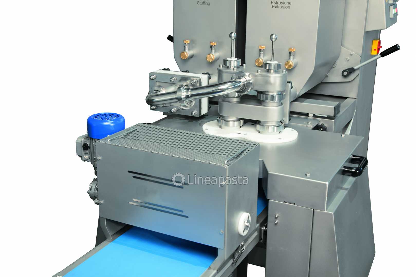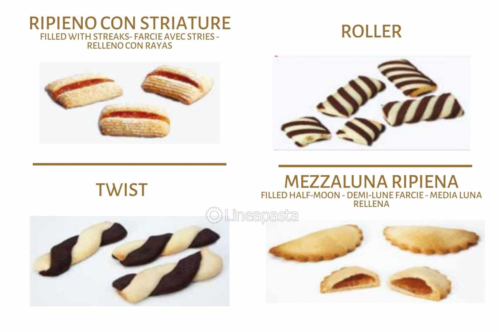 La MBS 250DV n'est pas seulement une machine à biscuits et barres monochromes, bicolores et tricolores, mais c'est avant tout une extrudeuse à vis pour produits sucrés et salés, farcis ou non, idéale pour la production de barres et biscuits ainsi que pour tout autre type de produit gastronomique de forme ronde, sphérique, cylindrique, avec une structure granulaire jusqu'à 1 cm de diamètre. C'est une machine à double cuve d'une capacité de 250 kg/h par cuve, idéale pour les laboratoires, les gastronomies et les entreprises de restauration qui souhaitent disposer d'une machine à fort potentiel à dimensions réduites, et qui souhaitent une production continue de différents types de produits allant du sucré au salé en utilisant une seule machine. Avec l'ajout de l'accessoire "troisième cuve", il est possible de produire des formats tricolores ou bicolores avec remplissage. L'accessoire "troisième cuve" au moyen d'un système de lobes permet un calibrage précis de la quantité de fourrage crémeux comme le nutella, la crème, la confiture et les fromages fondus. Dans les deux cuves, l'extrusion est alimentée par deux arbres de mélange qui pressent le mélange contre les vis d'extrusion pour rendre la vitesse d'extrusion aussi homogène que possible. Ce système à double arbre permet une production continue sans avoir à arrêter la machine pour remplir les cuves. Le MBS 250DV est idéal pour produire en continu des barres, des biscuits ronds farcies tels que Grisbi, biscuits, Maamoul, Kibbeh, ainsi que des produits salés tels que riz arancini, gnocchi, gnocchi farcis, boulettes de viande, canederli, etc. Avec cette machine, c'est possible produire des barres de différentes formes telles que des barres énergétiques et des craquelins qui avec le MBS 250DV peuvent être coupées automatiquement au moyen d'un système de coupe à guillotine automatique. De plus, il est possible de réaliser des biscuits roulés, des biscuits imprimés avec un moule personnalisé et des garnitures en vue sous une forme personnalisable. Grâce aux rouleaux à positionner sur la bande transporteuse, il est possible de personnaliser davantage le produit avec des décorations de surface. Vous pouvez éventuellement décorer les biscuits avec des stries de confiture ou d'autres revêtements. Enfin, avec des accessoires sur demande, il sera possible d'obtenir une forme sphérique parfaite avec un arrondisseur automatique, et de décorer la surface du produit avec du sucre ou des pralines à l'aide d'un accessoire plumeau. La production peut également être davantage automatisée grâce à des bandes transporteuses à dépôt automatique rétractable qui rempliront les plateaux de manière automatique et ordonnée pour être prêts à être insérés dans le four. La grande polyvalence de cette machine lui permet de s'adapter parfaitement aux besoins de production en créant un ou plusieurs produits adaptés au client qui détermine les dimensions et les caractéristiques du produit. La machine à biscuits MBS 250DV est équipée d'un dispositif d'extrusion à valeur variable, d'un dispositif d'injection de remplissage à vitesse variable pour régler la quantité souhaitée de remplissage, d'un dispositif de coupe à diaphragme minuté et d'un dispositif de coupe à guillotine. Il est entièrement construit en acier inoxydable certifié AISI 304 et toutes les pièces en contact avec le produit sont facilement démontables pour un lavage efficace même au lave-vaisselle. Enfin, la machine est conforme aux directives de la norme européenne CE.