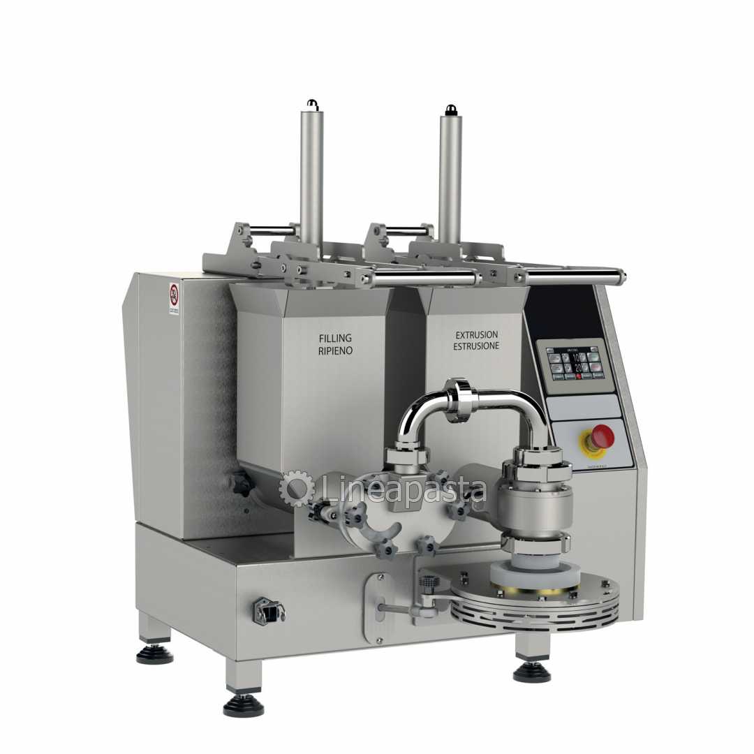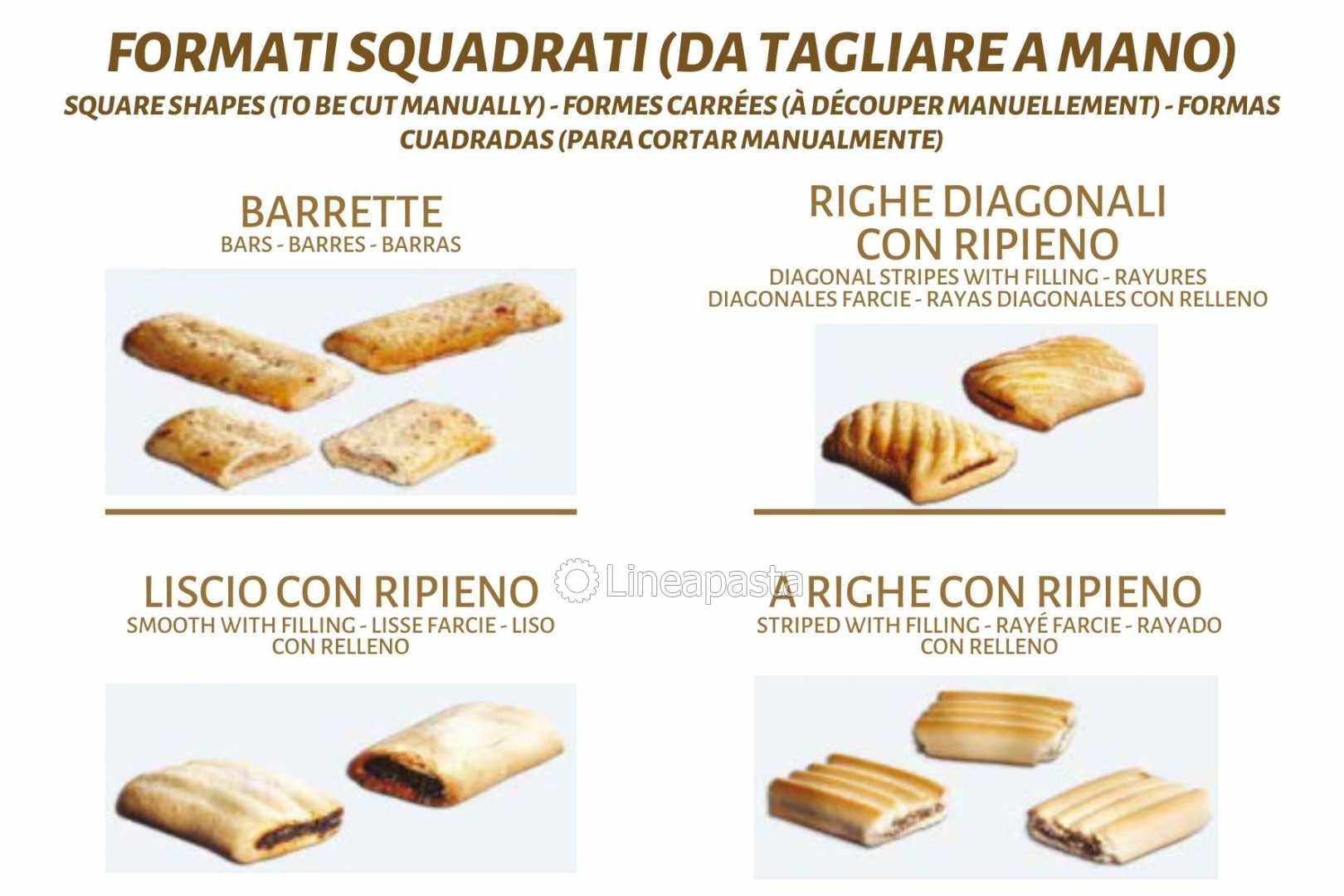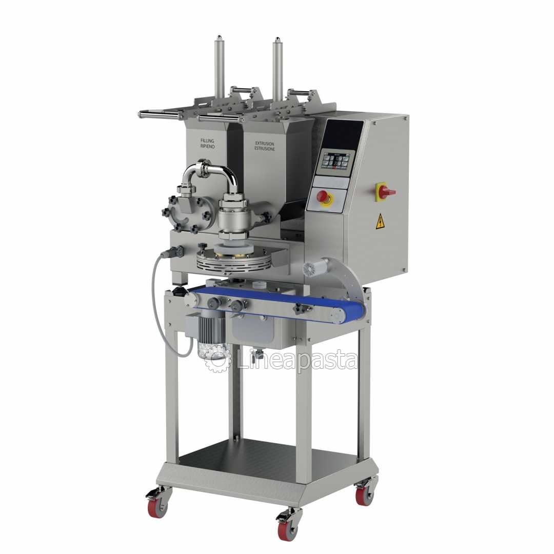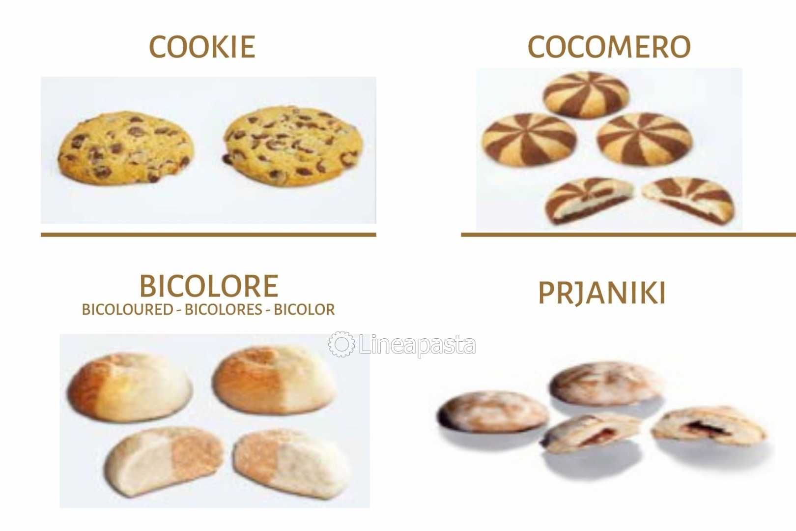 Appelant cette machine "machine à biscuits" est réductrice car la machine à biscuits MBS 70 est en fait une extrudeuse à vis pour produits farcies et non farcies, sucrés et salés, capable de produire des biscuits et tout autre type de produit gastronomique de forme ronde, sphérique, cylindrique ou quadrilatère d'une capacité de 70 kg/h par cuve. C'est une machine idéale pour les petits ateliers, la gastronomie et la restauration qui souhaitent produire différents types de produits allant du sucré au salé à l'aide d'une seule machine, économisant de l'argent et de l'espace. La cuve double permet de réaliser des formats bicolores, monochromes ou monochromes avec remplissage, et il est possible d'extruder du matériau granulaire jusqu'à 1 cm de diamètre. L'extrusion a lieu grâce à la pression dans la cuve des pistons qui pressent la pâte contre la vis d'extrusion pour rendre l'extrusion la plus homogène possible. Le MBS 70 est idéal pour faire des biscuits ronds fourrés tels que Grisbi, cookies, Maamoul, Kibbeh, ainsi que des produits salés tels que riz arancini, gnocchi, canederli farci, boulettes de viande, gnocchi, etc. Il est possible de produire des barres unicolores, bicolores ou fourrées telles que des biscuits rectangulaires, des barres énergétiques et des craquelins qui dans ce format doivent être coupées à la main en longueur. Grâce aux rouleaux à positionner sur la bande transporteuse, il est possible de personnaliser davantage le produit avec des décorations de surface. La grande polyvalence de cette machine permet de s'adapter parfaitement aux besoins de production en créant un ou plusieurs produits adaptés au client qui détermine les dimensions et les caractéristiques du produit. La machine à biscuit MBS 70 est équipée d'un dispositif d'extrusion à vitesse variable, d'un dispositif d'injection de remplissage à vitesse variable pour régler la quantité désirée de remplissage et d'un dispositif de coupe à diaphragme temporisé. Il est entièrement construit en acier inoxydable certifié AISI 304 et toutes les pièces en contact avec le produit sont facilement démontables pour un lavage efficace même au lave-vaisselle. Reposant sur quatre pieds, il est apte à être placé sur une table de travail ou sur le chariot à roulettes disponible en option. Enfin, la machine est conforme aux directives de la norme européenne CE.