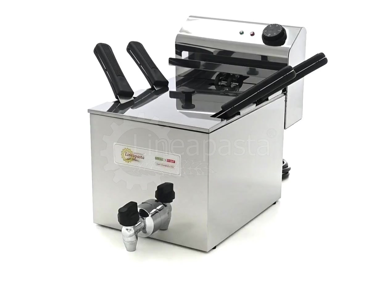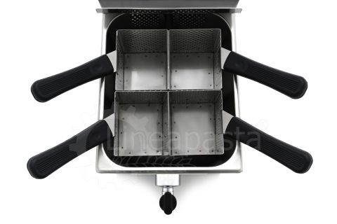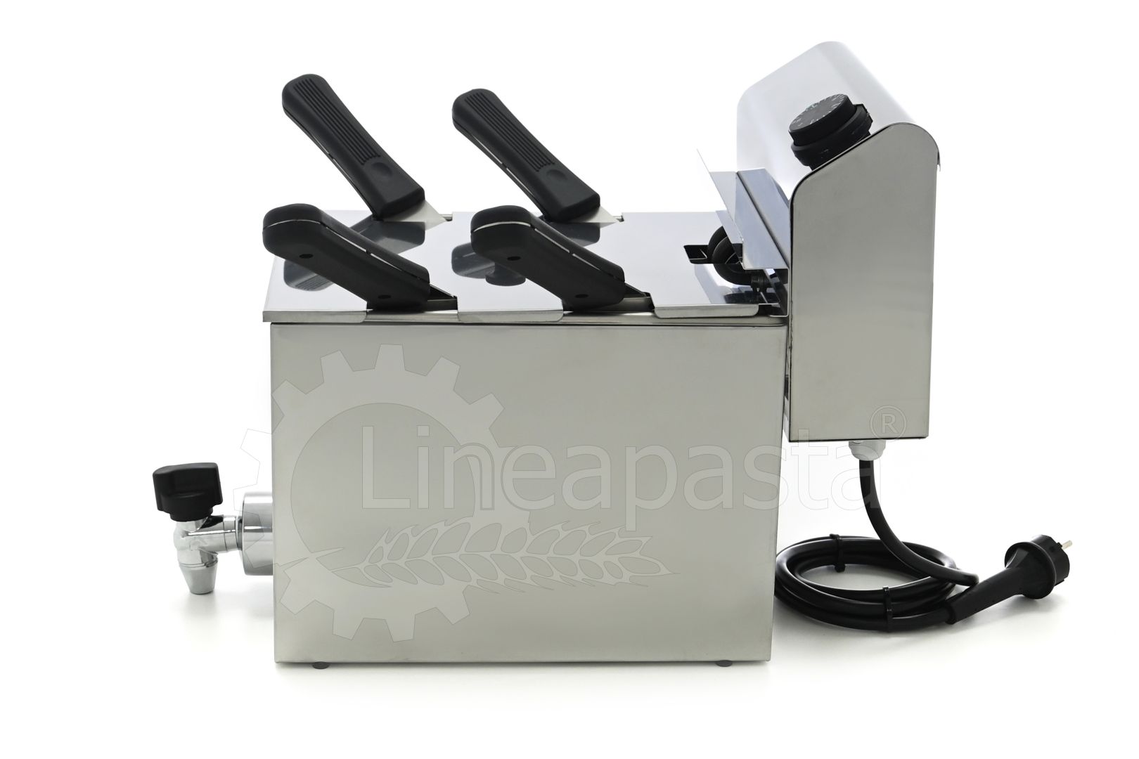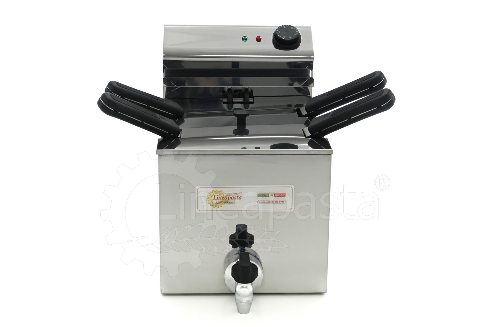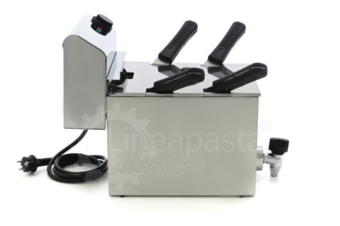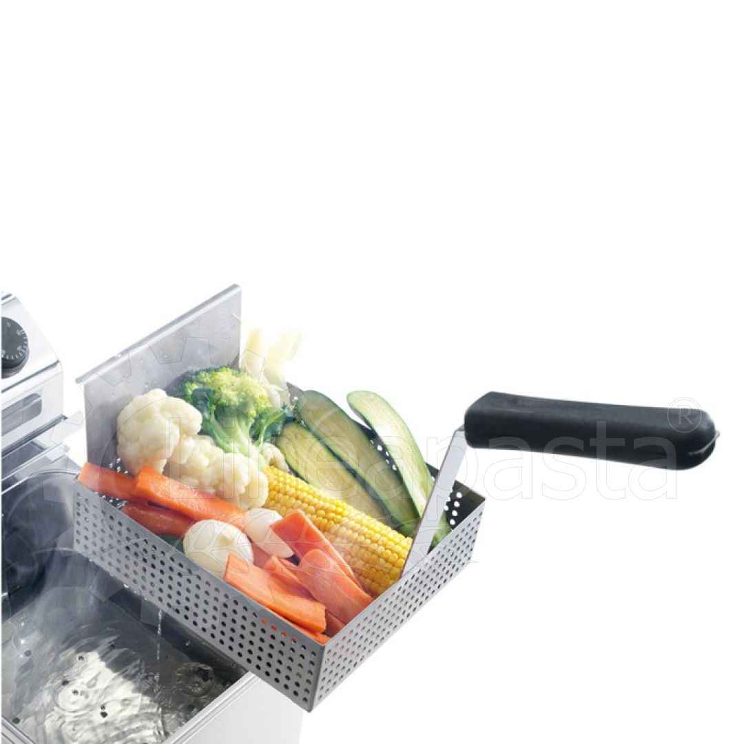 Cuiseur à pâtes avec une capacité de 6 litres d’eau, adapté à la cuisson rapide des pâtes, adapté aux établissements commerciaux tels que les bars ou les activités qui n’ont pas besoin de préparer de grandes quantités de pâtes. La machine entièrement en acier inoxydable est équipée de quatre paniers micro-perforés, qui sont équipés d’une poignée pratique. Ce cuiseur à pâtes est équipé de résistances spéciales avec traitement antirouille et dispose d’un robinet pour l’évacuation de l’eau. Le cuiseur à pâtes dispose d’un thermostat de contrôle et d’une protection thermique de sécurité, qui empêche la température de dépasser le seuil au-delà duquel on risque d’endommager l’équipement. Vous pouvez combiner le cuiseur à pâtes avec un panier plus grand que ceux fournis, ou un panier spécial pour la cuisson à la vapeur.
