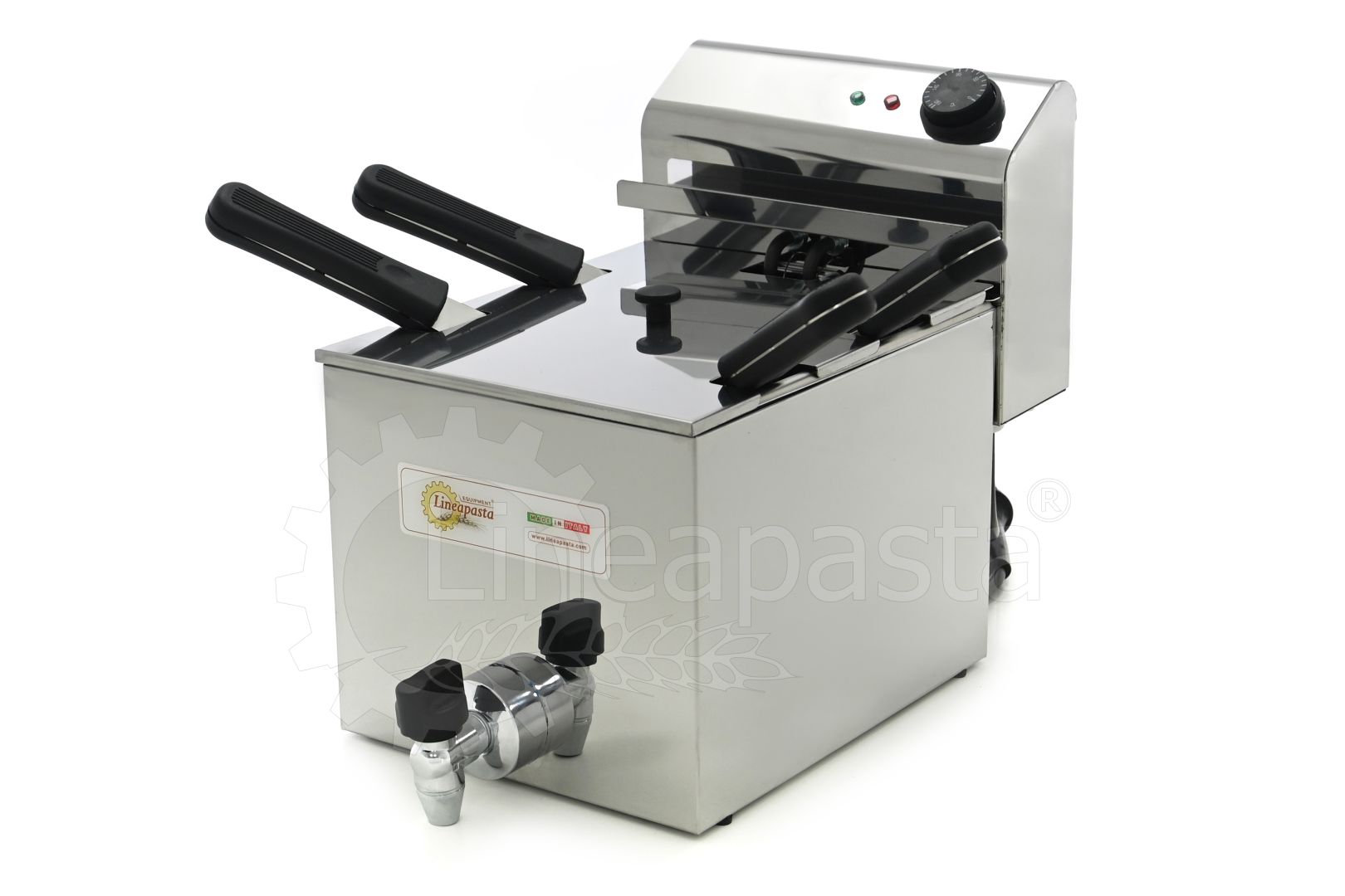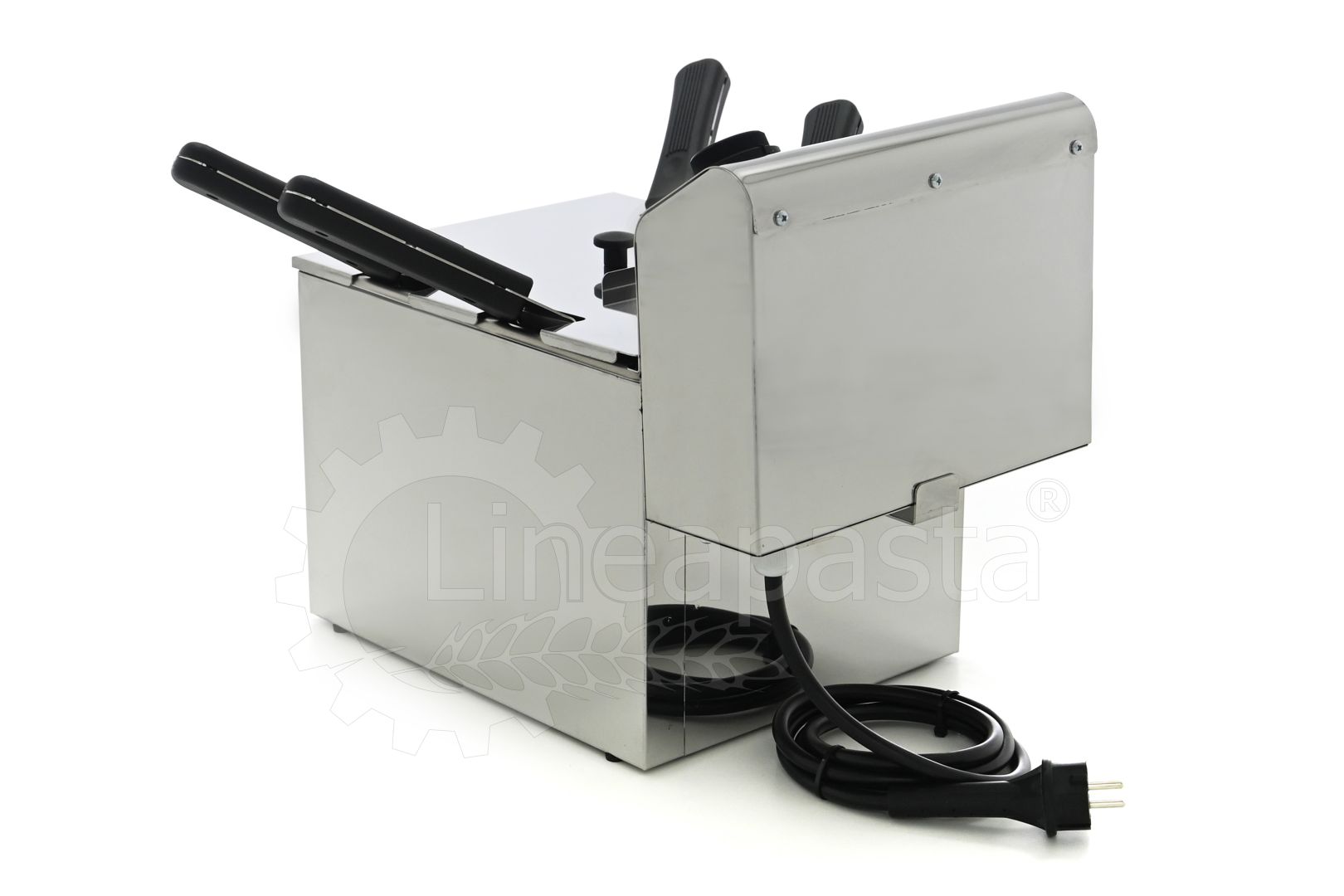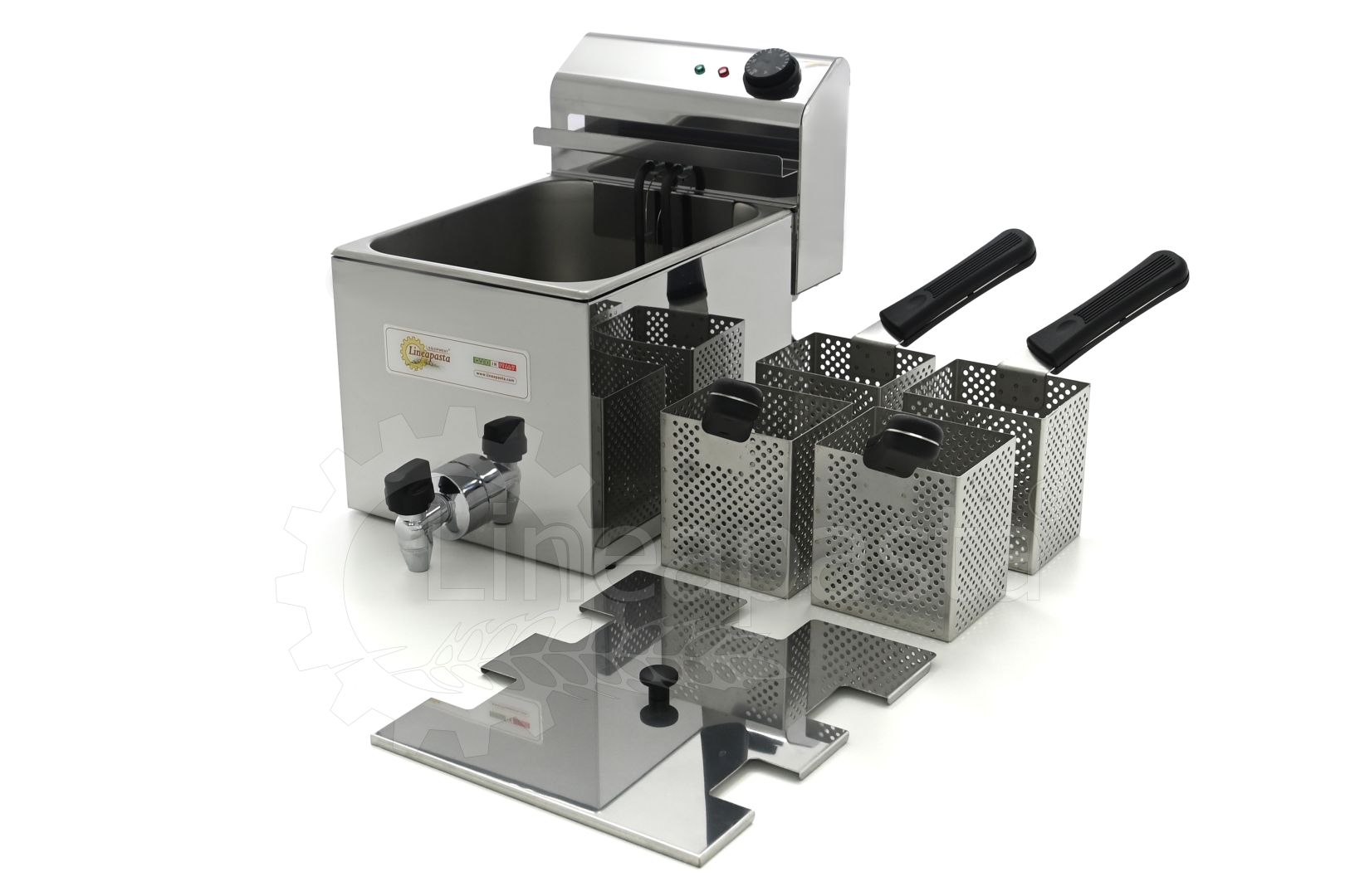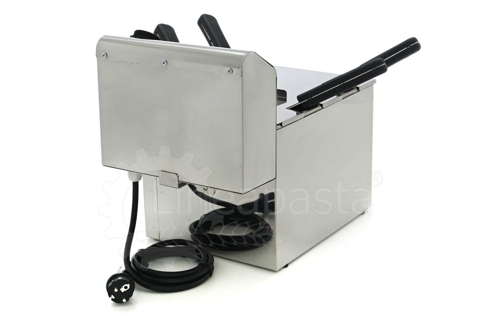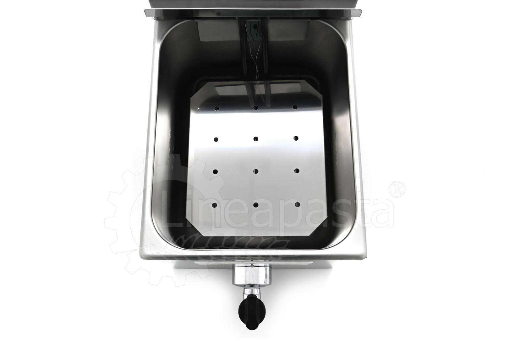 Cuiseur à pâtes avec une capacité de 6 litres d’eau, adapté à la cuisson rapide des pâtes, adapté aux établissements commerciaux tels que les bars ou les activités qui n’ont pas besoin de préparer de grandes quantités de pâtes. La machine entièrement en acier inoxydable est équipée de quatre paniers micro-perforés, qui sont équipés d’une poignée pratique. Ce cuiseur à pâtes est équipé de résistances spéciales avec traitement antirouille et dispose d’un robinet pour l’évacuation de l’eau. Le cuiseur à pâtes dispose d’un thermostat de contrôle et d’une protection thermique de sécurité, qui empêche la température de dépasser le seuil au-delà duquel on risque d’endommager l’équipement. Vous pouvez combiner le cuiseur à pâtes avec un panier plus grand que ceux fournis, ou un panier spécial pour la cuisson à la vapeur.