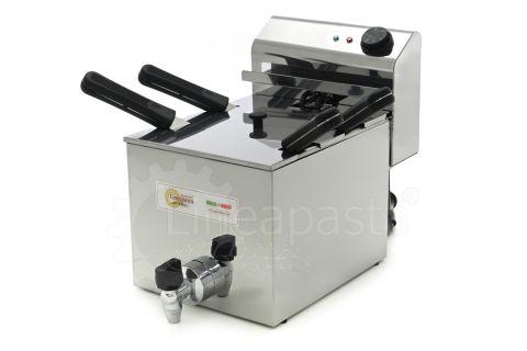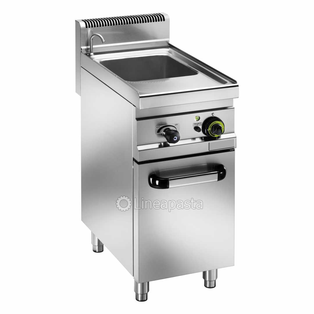 Cuiseur de pâtes electriques CPM/30 avec structure, couvercles et paniers en acier inox, cuve en acier inox AISI316 épaisseur 15/10, poignées paniers et couvercles en matière isolante, résistances blindées en acier inox incoloy. Il y a un robinet de vidange d’eau raccordable au réseau et un robinet de sécurité extérieur. Le cheminée surélevée servant de pare-gouttes. Cet modèle est accompagné d’un meuble. Il dispose d’un système de vidange raccordé au réseau et d’un système à effleurement pour éliminer les dépôts d’amidon des pâtes.