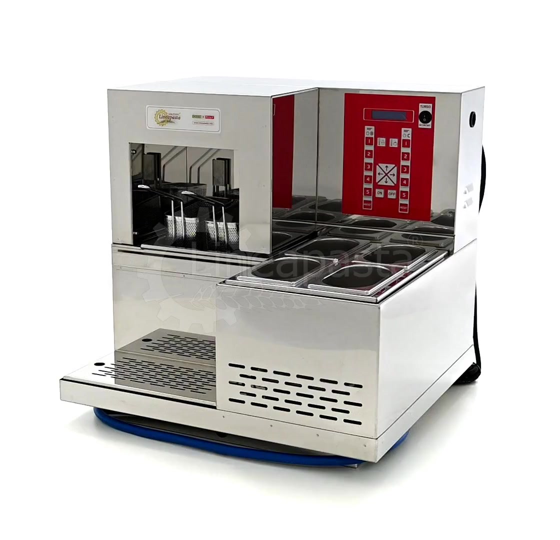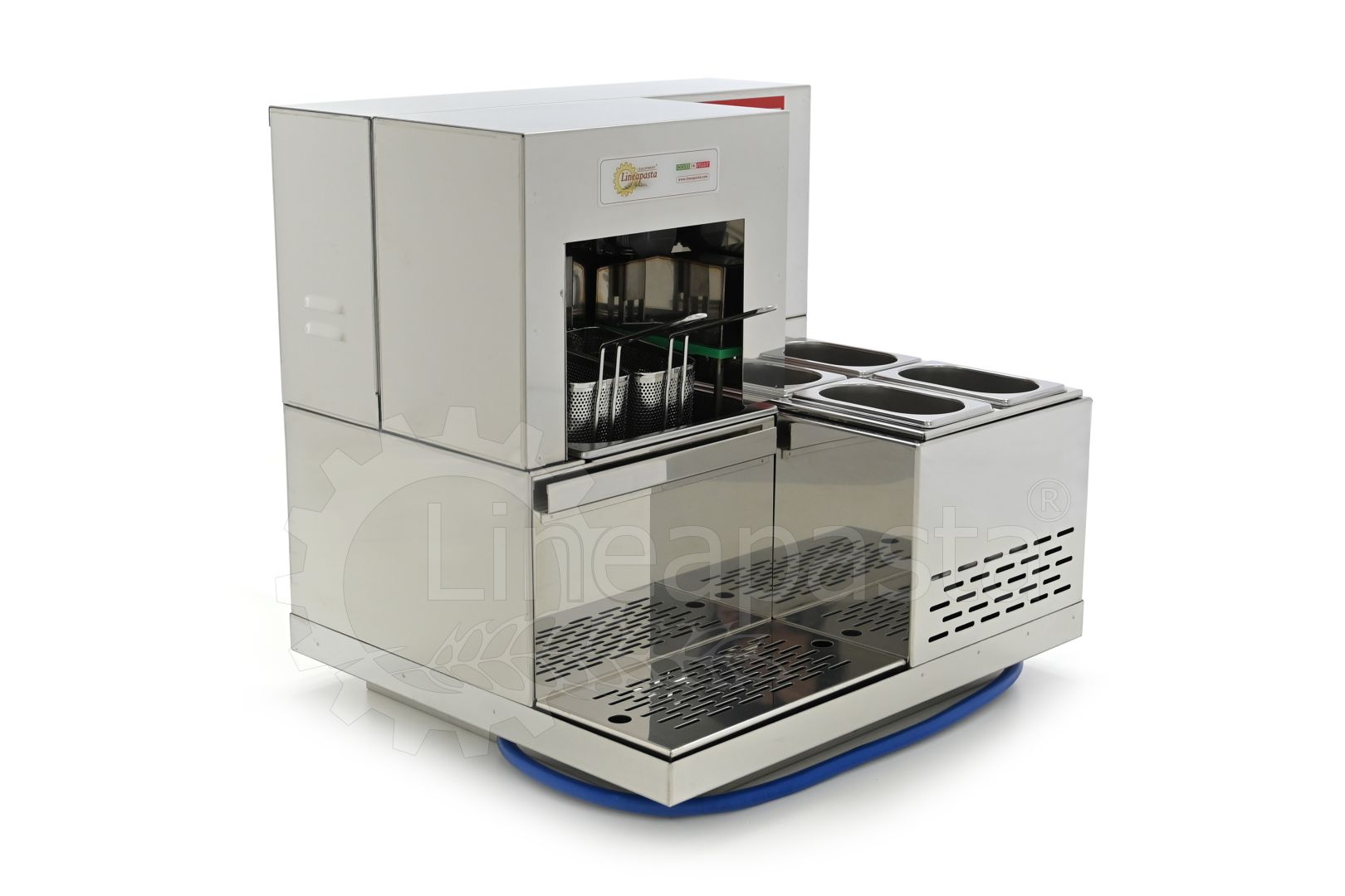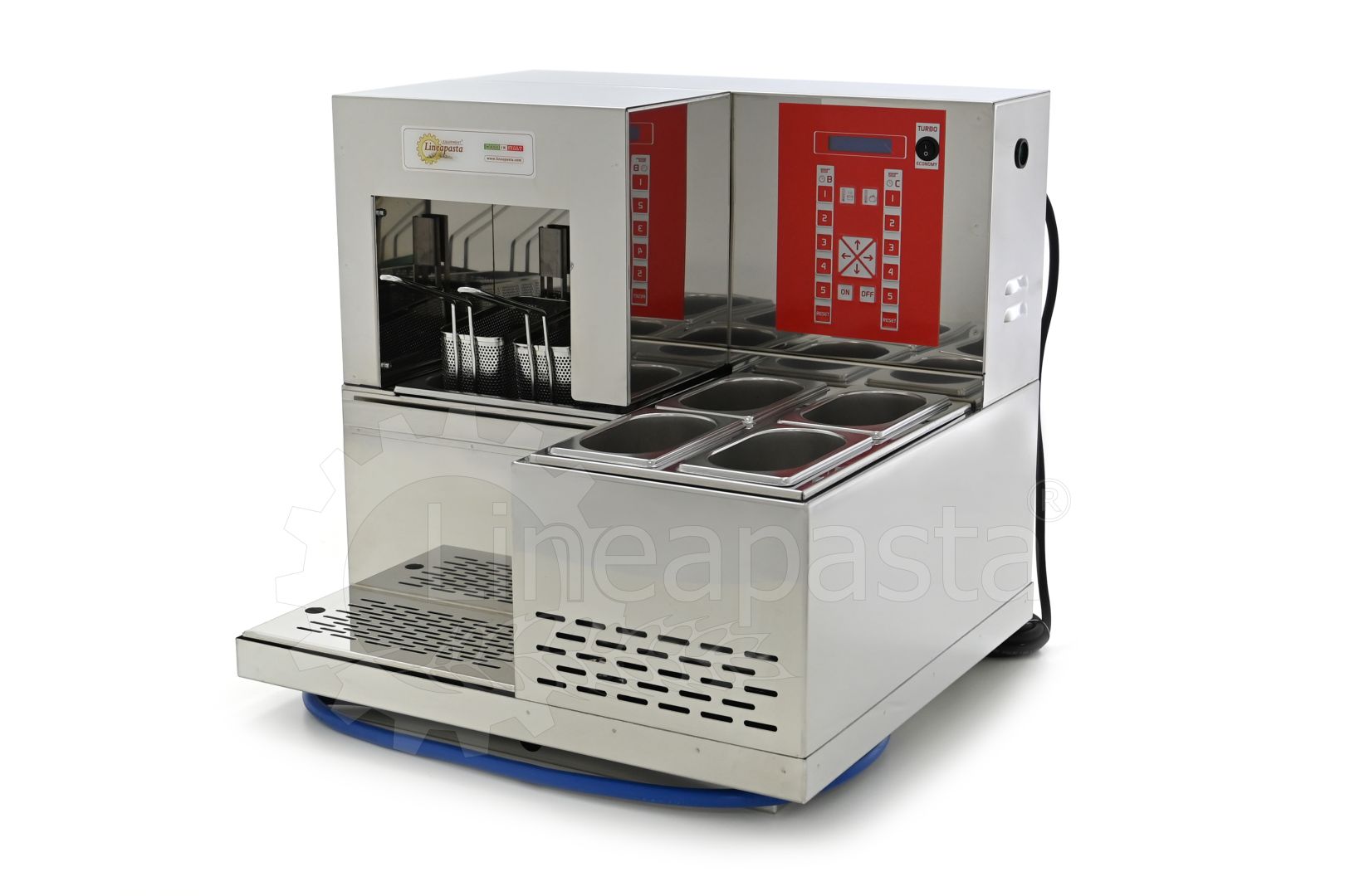 La station de cuisson électrique CS pour comptoir vous permet de préparer d'excellentes pâtes en quelques minutes en gardant les sauces au chaud. Cuiseur à pâtes révolutionnaire automatique avec un système d'aspiration des fumées breveté et ne nécessite donc pas d'une locale équipée d'une hotte aspirante. La machine est entièrement automatique et permet un gain de temps considerable: il suffit de charger le panier jusqu'à 500gr de pâtes et d'appuyer sur un bouton du panneau de commande. Le panier descendra automatiquement puis remontera à la fin de la minuterie réglée, avec les pâtes déjà égouttées. La machine se prête parfaitement à la fois pour faire revivre les pâtes précuites et non, pour un total d'environ 150 portions/h.
