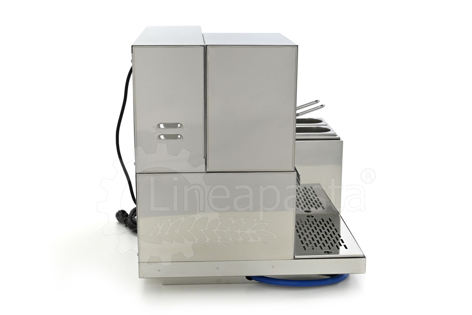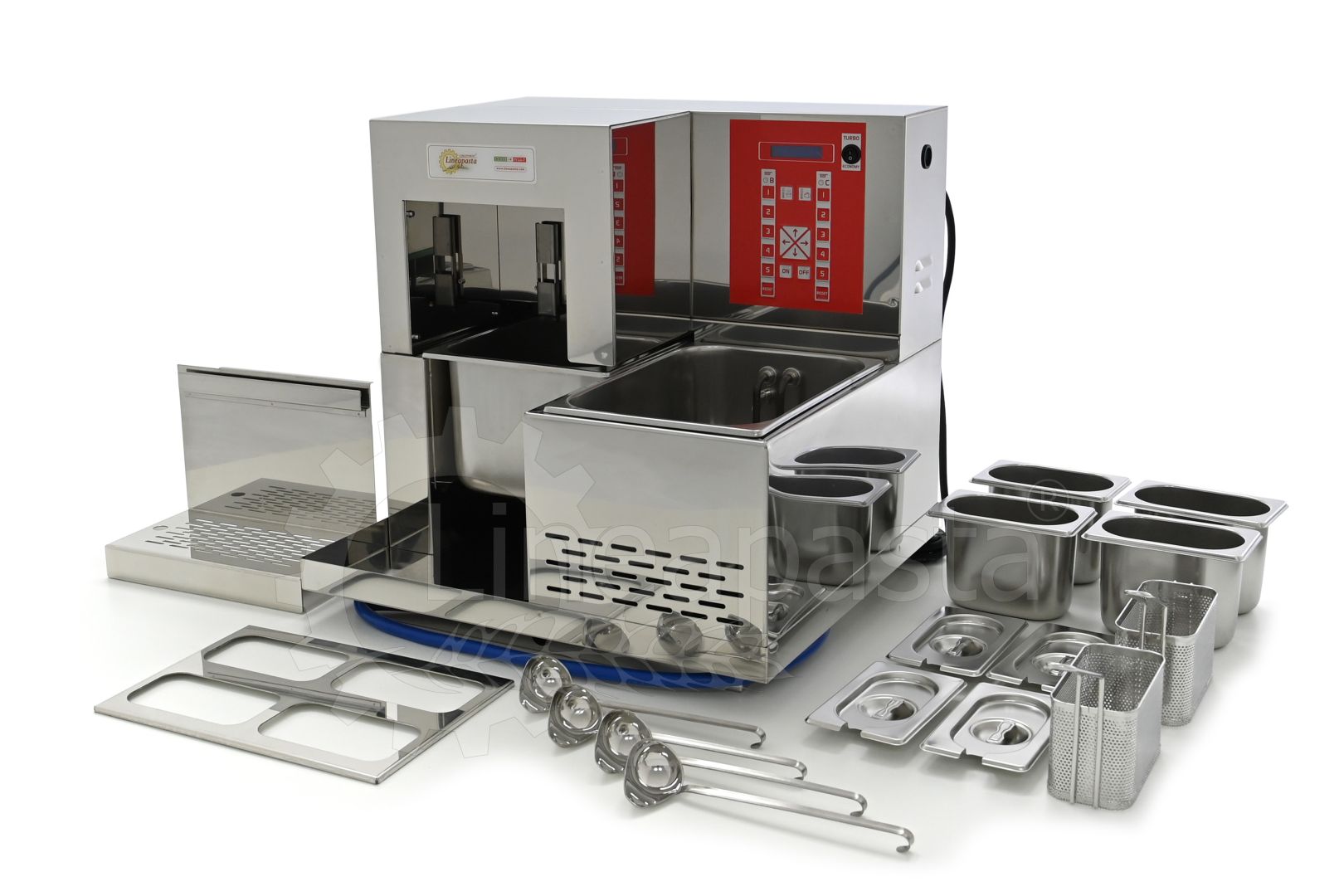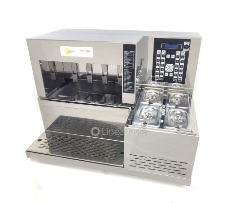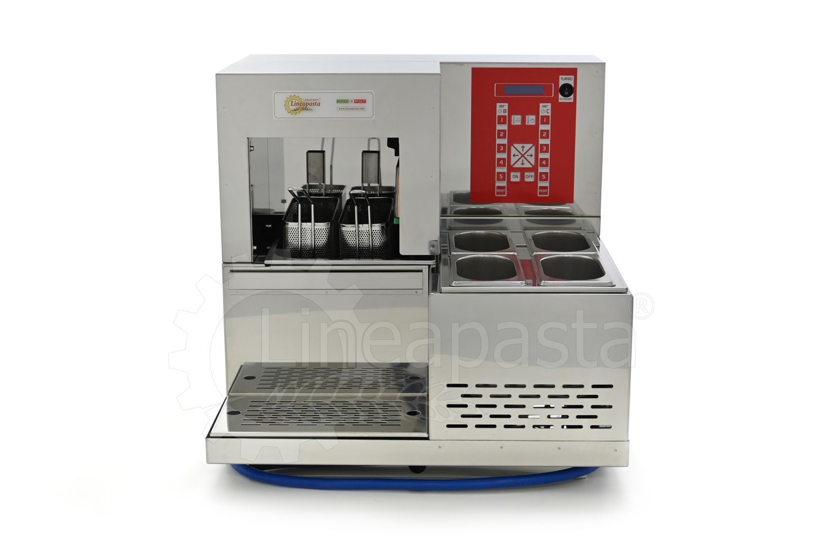 La station de cuisson électrique CS pour comptoir vous permet de préparer d'excellentes pâtes en quelques minutes en gardant les sauces au chaud. Cuiseur à pâtes révolutionnaire automatique avec un système d'aspiration des fumées breveté et ne nécessite donc pas d'une locale équipée d'une hotte aspirante. La machine est entièrement automatique et permet un gain de temps considerable: il suffit de charger le panier jusqu'à 500gr de pâtes et d'appuyer sur un bouton du panneau de commande. Le panier descendra automatiquement puis remontera à la fin de la minuterie réglée, avec les pâtes déjà égouttées. La machine se prête parfaitement à la fois pour faire revivre les pâtes précuites et non, pour un total d'environ 150 portions/h.