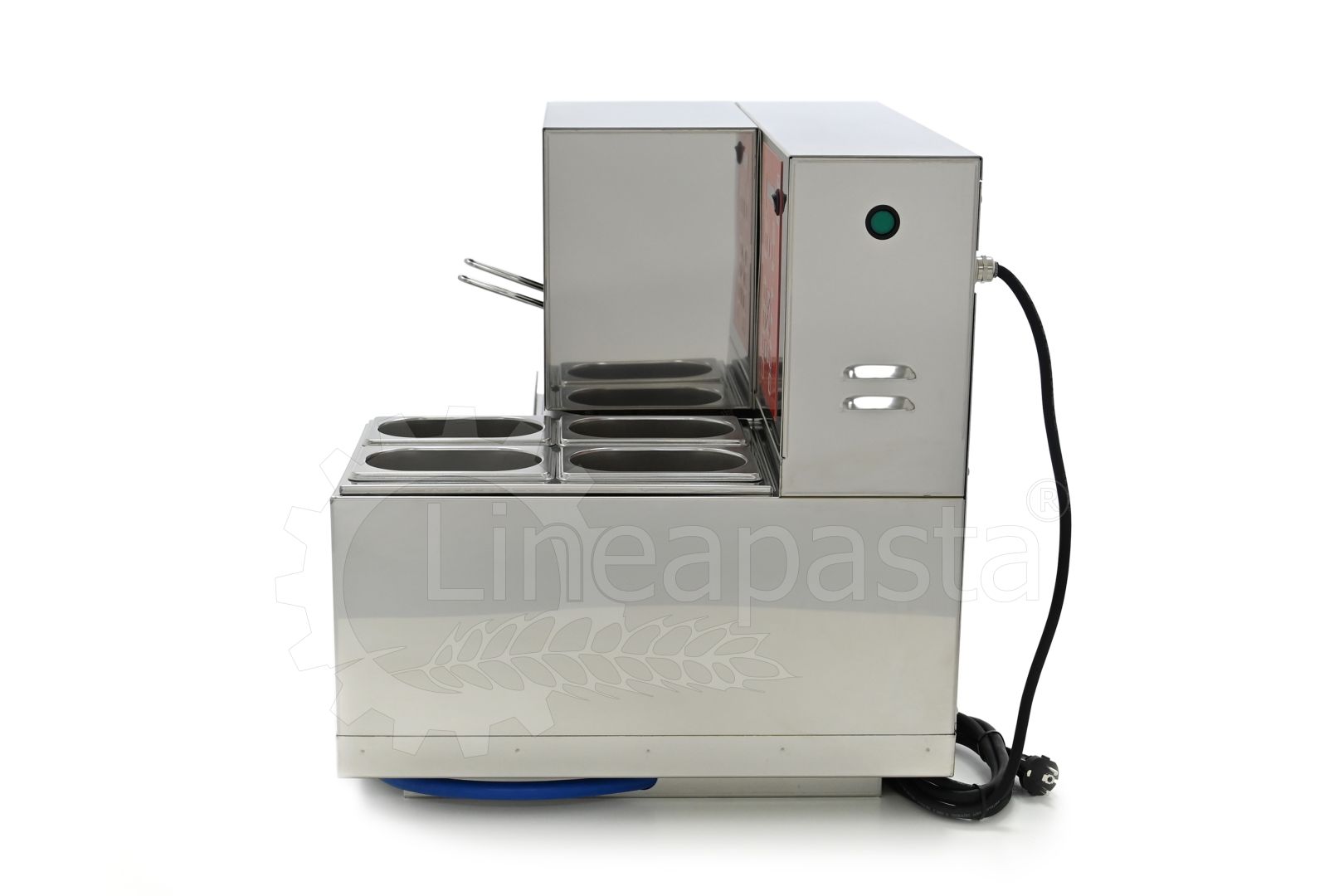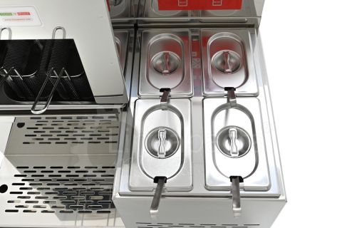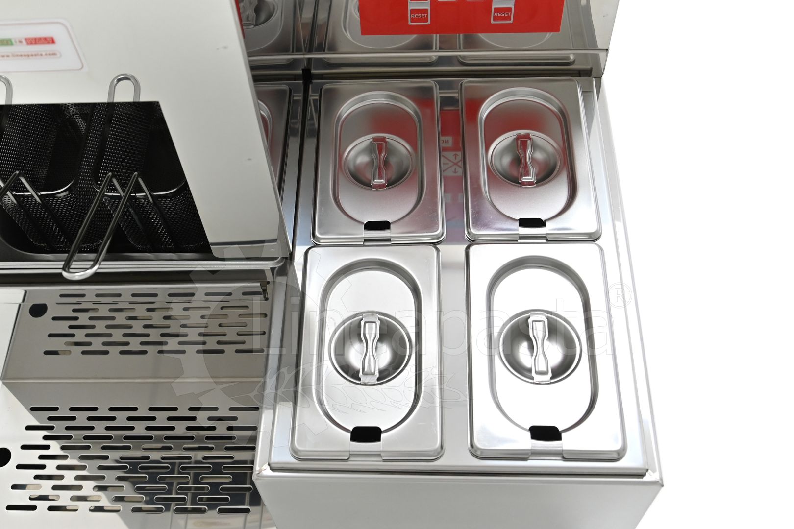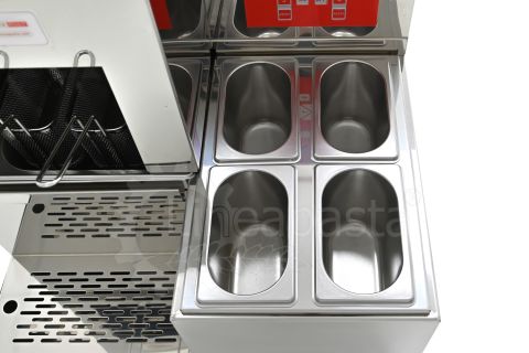 À côté des paniers, un système de bain-marie automatique vous permet de vous réchauffer jusqu'à quatre sauces différentes; la fissure dans la partie supérieure des plateaux permet à l'humidité générée par le bain-marie de reconstituer l'eau contenue dans les sauces et l'empêche de se dessécher. Entièrement en acier inoxydable, il peut fonctionner sans être connecté à l'alimentation en eau.