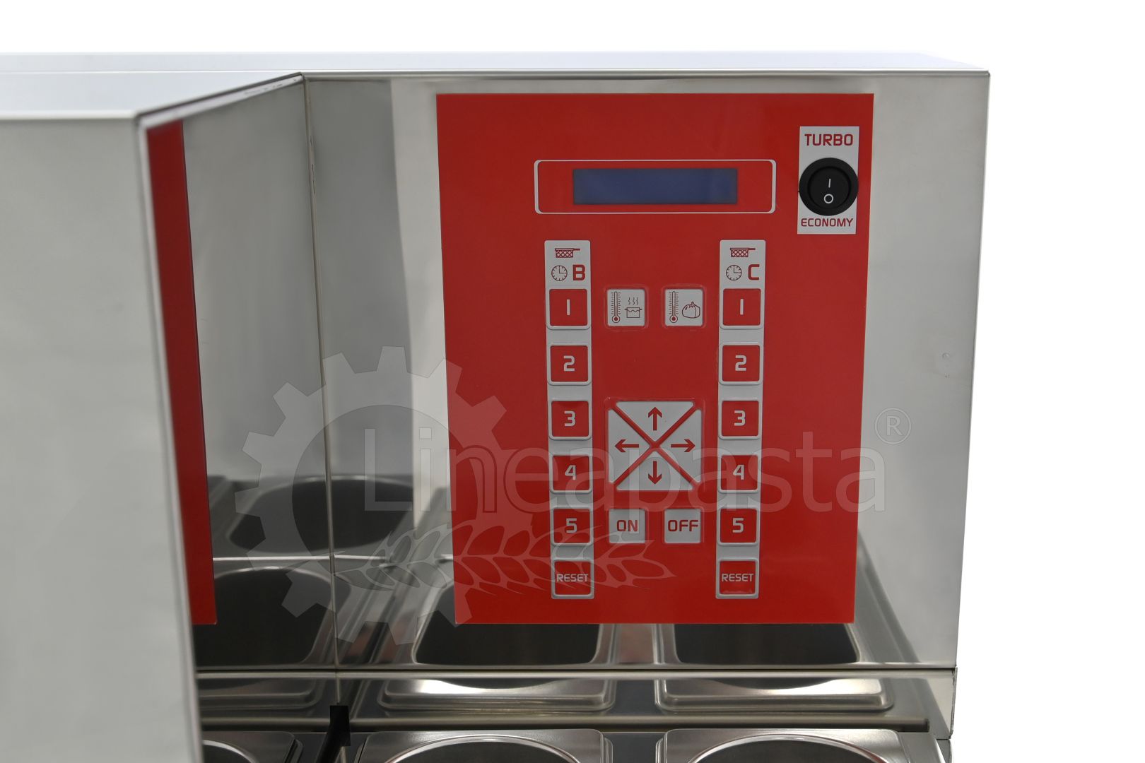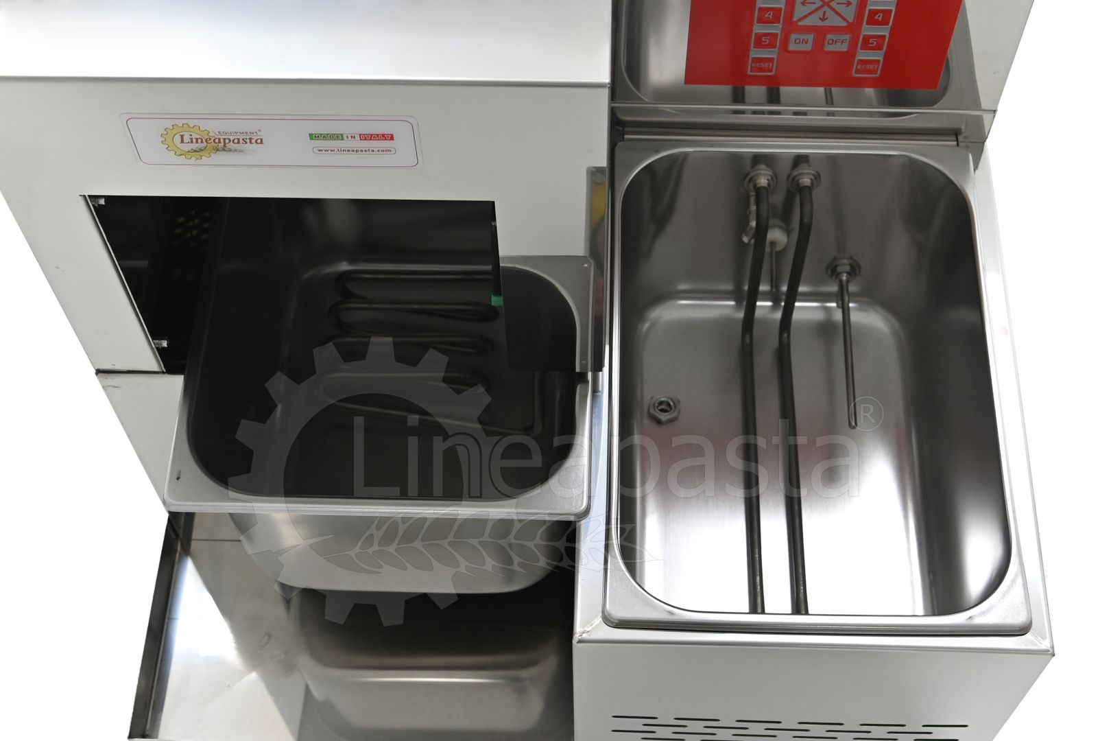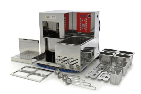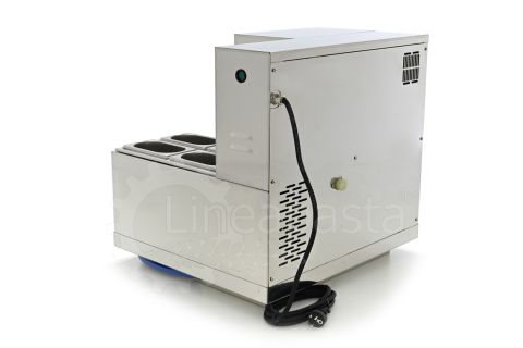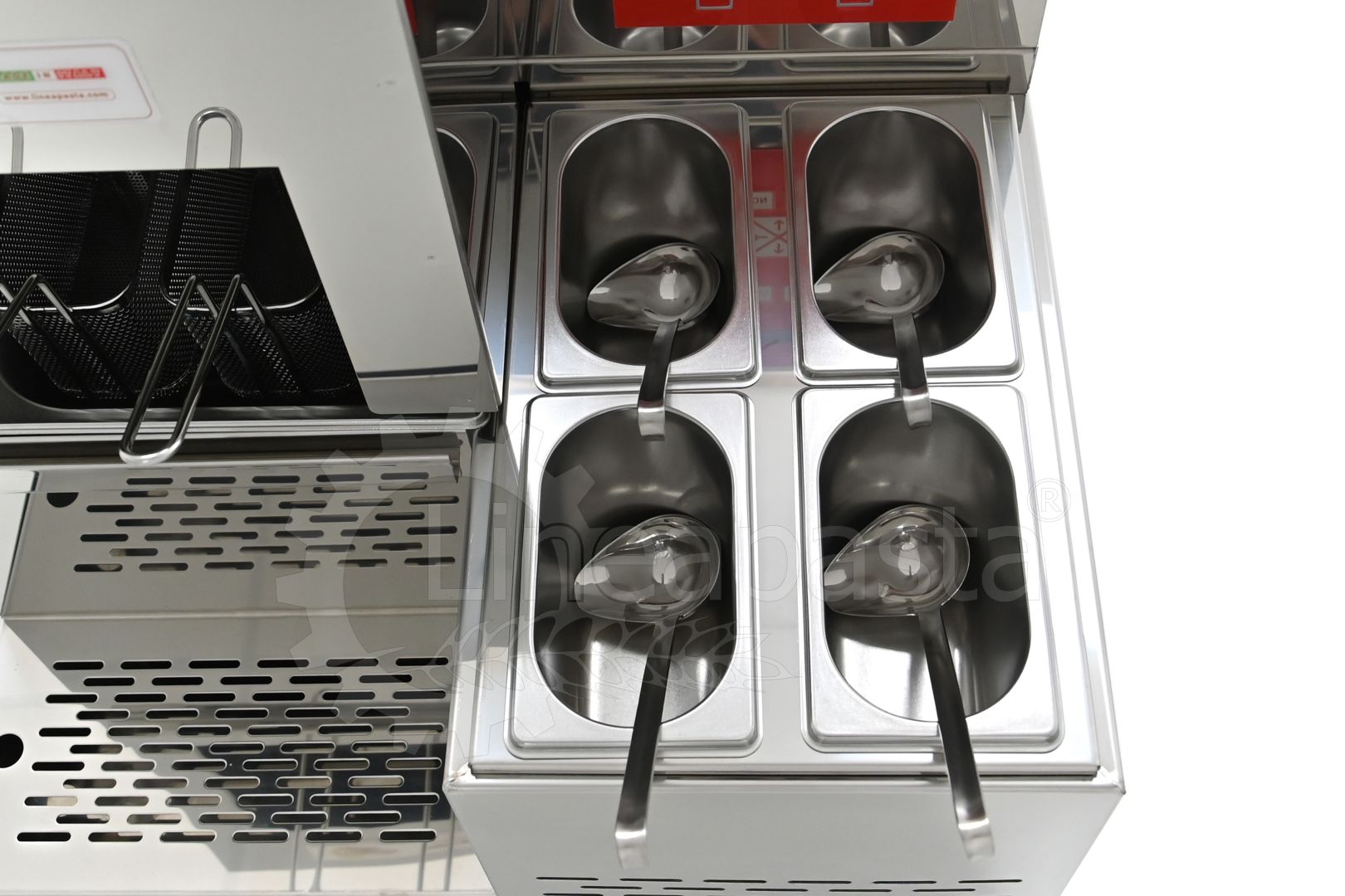 À côté des paniers, un système de bain-marie automatique vous permet de vous réchauffer jusqu'à quatre sauces différentes; la fissure dans la partie supérieure des plateaux permet à l'humidité générée par le bain-marie de reconstituer l'eau contenue dans les sauces et l'empêche de se dessécher. Entièrement en acier inoxydable, il peut fonctionner sans être connecté à l'alimentation en eau.