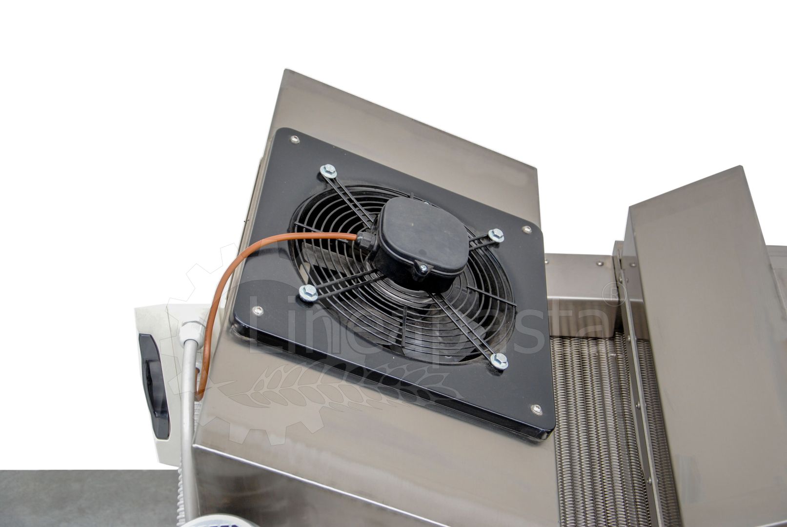 À l'extrémité du tapis se trouve une zone de séchage équipée de lampes à quartz et d'un ventilateur de 250 mm de diamètre.