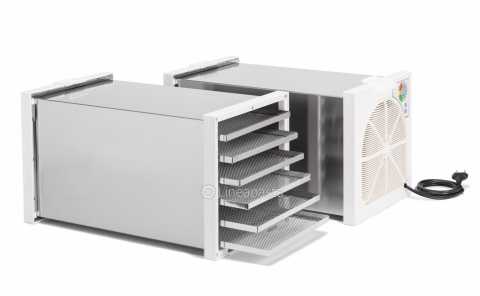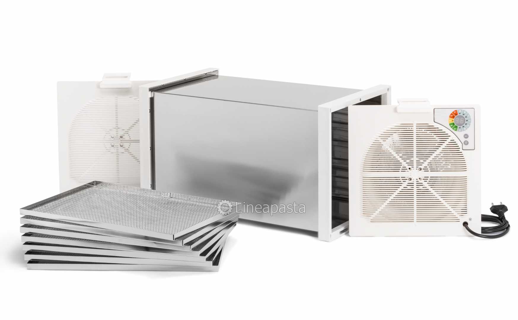 Il est équipé de 6 cadres en acier inoxydable (d'une capacité de 2,5 à 3,5 kg selon le produit à sécher) et d'un moteur électronique avec 7 programmes automatiques et 5 réglages de température.