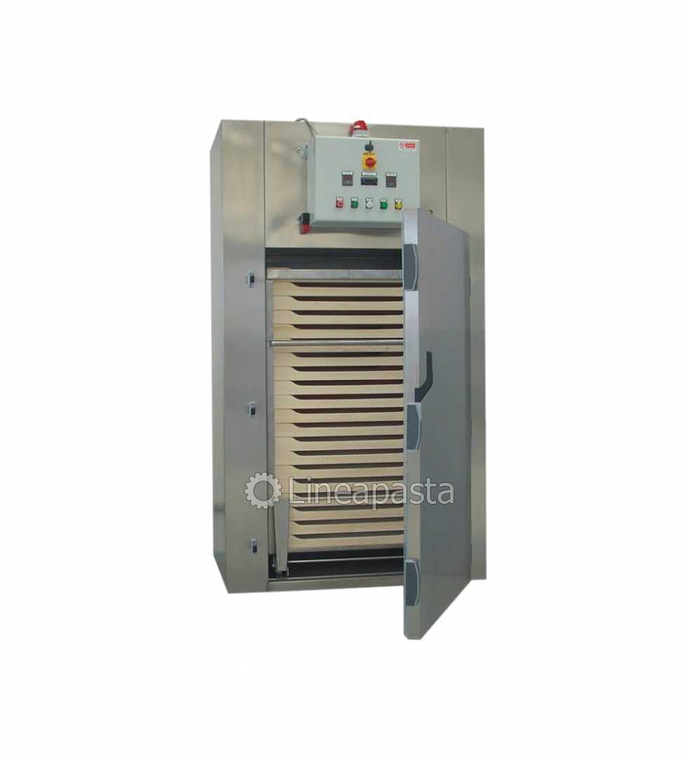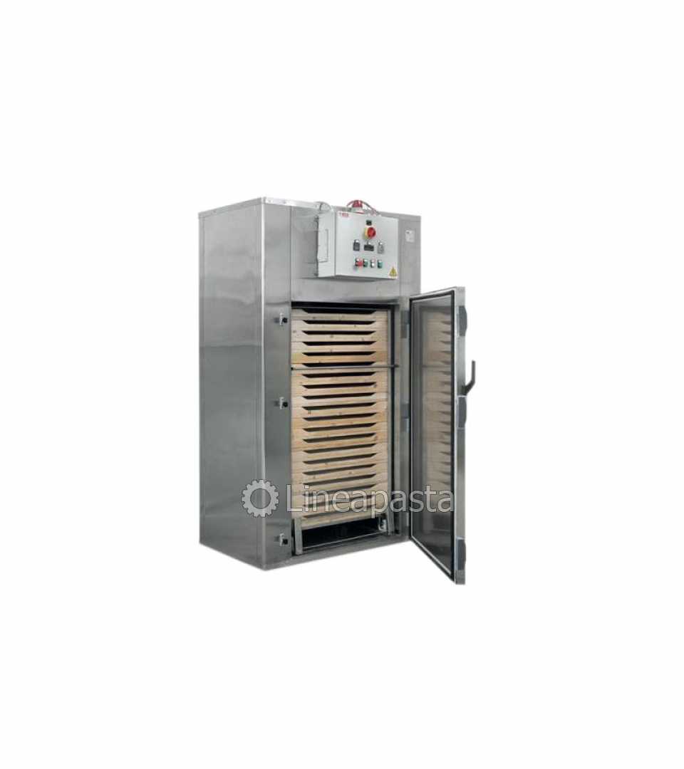 Le stérilisateur statique ST-100 permet de neutraliser la charge bactérienne des pâtes, également farcies, emballées dans une atmosphère modifiée, avec une capacité allant jusqu'à 100 kg par cycle. Pour être utilisé avec des emballages adaptés à des températures élevées (environ 95° C), ce processus peut être remplacé ou combiné à la pasteurisation pour une plus grande sécurité; en effet, la stérilisation permet d'allonger la durée de vie des produits et convient particulièrement dans les pays chauds ou ayant des difficultés à maintenir la chaîne du froid. Le comptage de la durée du processus de stérilisation commence à partir du moment où la machine a atteint la température définie jusqu'au noyau du produit; il y a aussi un minuteur interne qui vous permet de définir un délai de comptage supplémentaire pour une sécurité accrue des processus. Une alarme sonore et visuelle vous avertira que le cycle est terminé. La machine comprend 1 chariot en acier inoxydable sur roues pivotantes avec poignée et 20 tamis en bois profilés avec une base en maille de polyester. Tableau électrique standard CE avec minuterie de cycle de ventilation droite, pause et ventilation gauche.