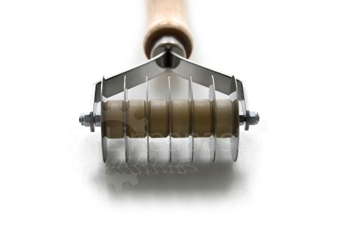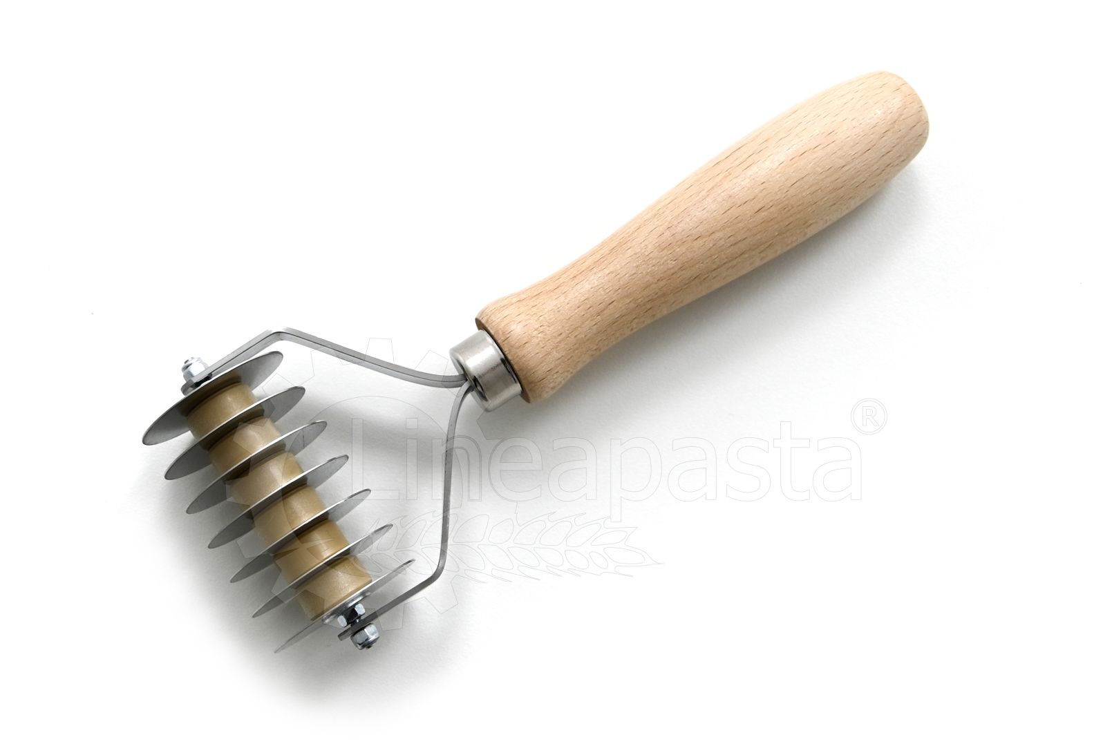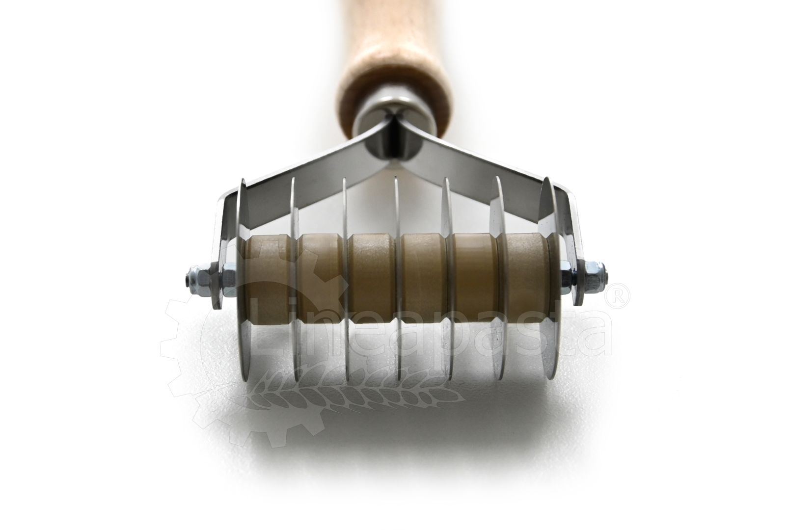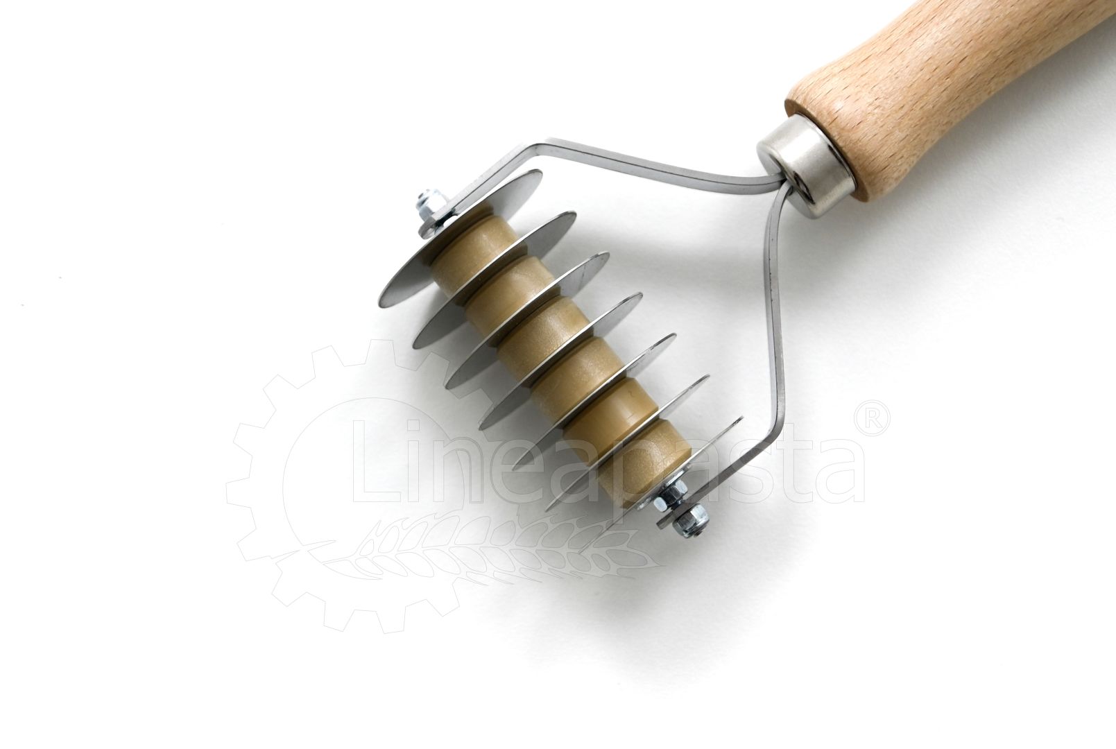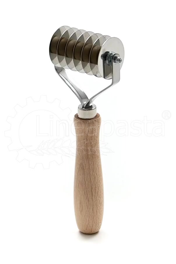 Coupe-pâte avec un manche en bois pratique et une structure en acier inoxydable, composé de sept lames lisses espacées de manière à former six pistes de coupe. Ce coupe-pâte est conçu pour couper la pâte feuilletée de manière pratique et rapide, en gravant la pâte feuilletée en tagliatelle de 8,5 mm sans utiliser de machines telles que des presses ou des laminoirs.