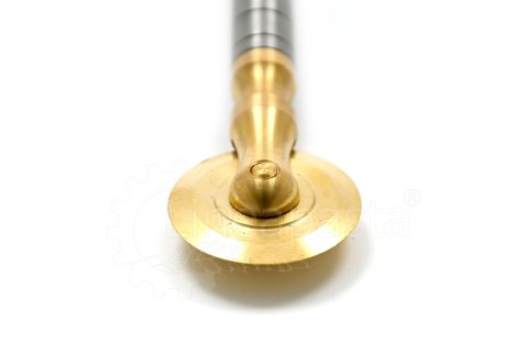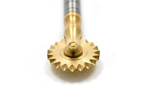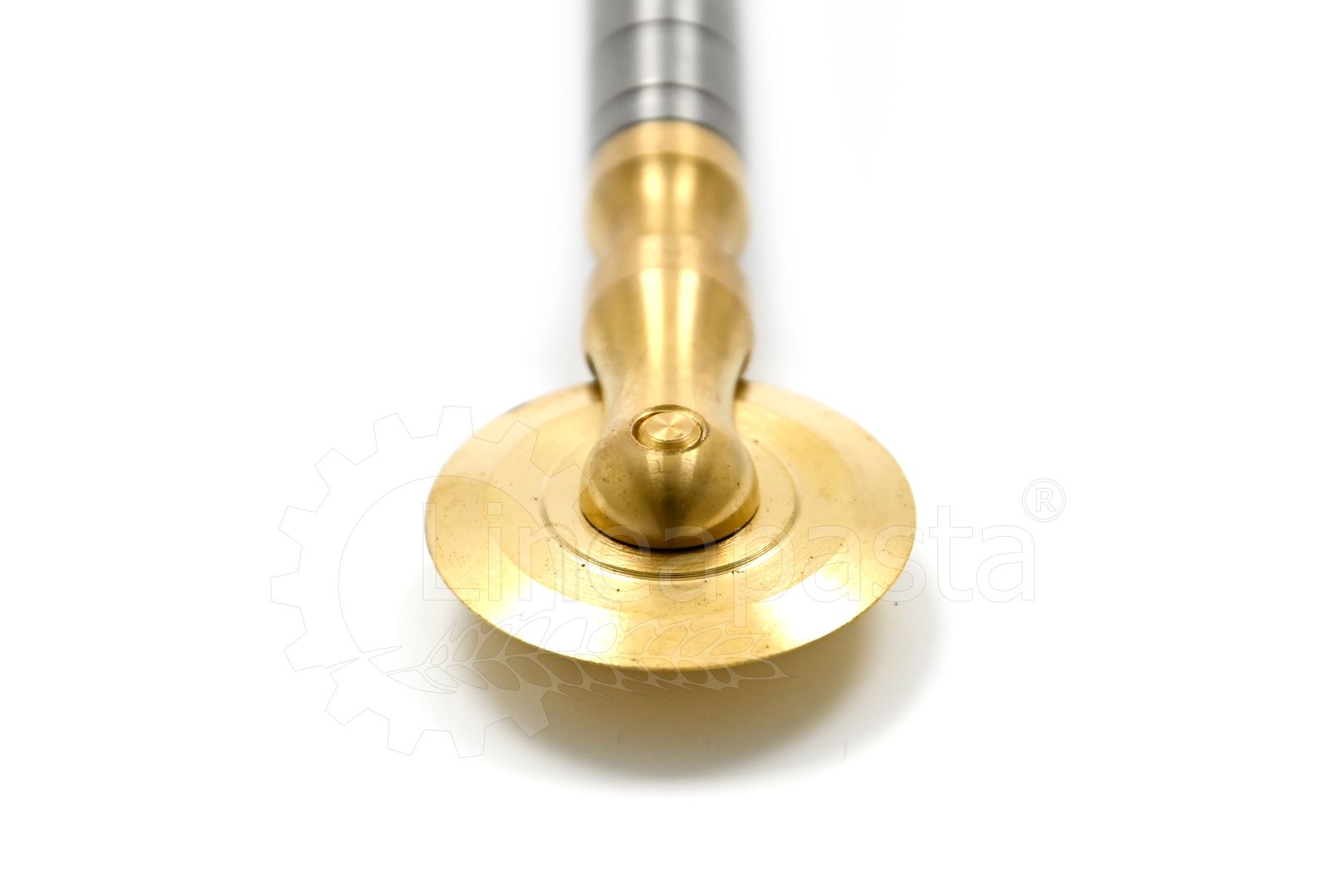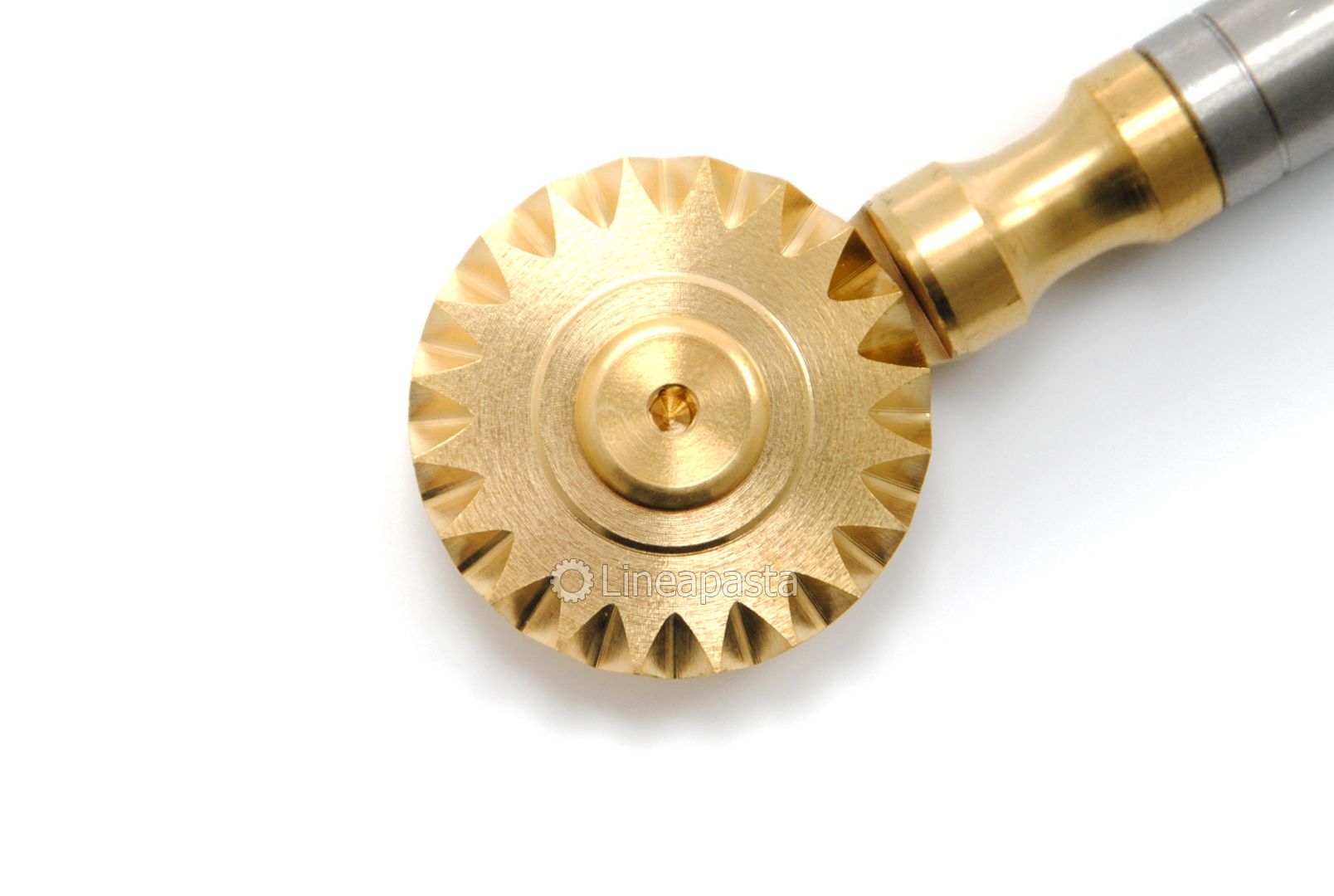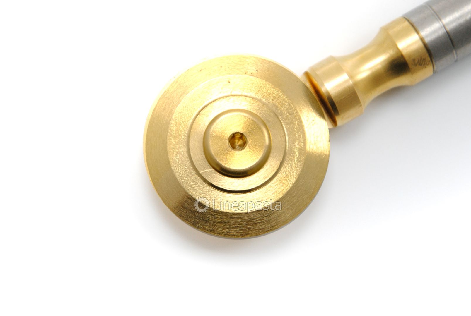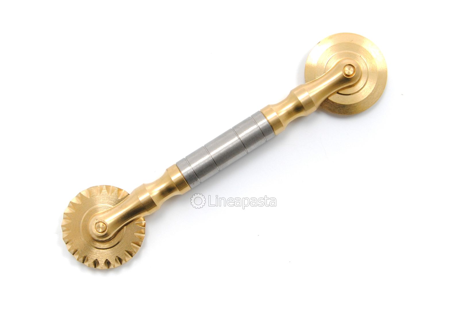 Coupe-pâte à double roue pratique et robuste en laiton et acier INOX. De fabrication artisanale, l’outil permet une coupe nette et précise de la feuille. Idéal pour un usage domestique et professionnel, ce coupe-pâte est composé d’une poignée en acier chromé aux extrémités de laquelle est posée une lame lisse et une lame dentée en laiton, les deux d’un diamètre de 38 mm, pour avoir deux types de coupe différents dans un seul outil.