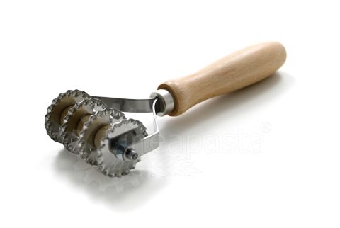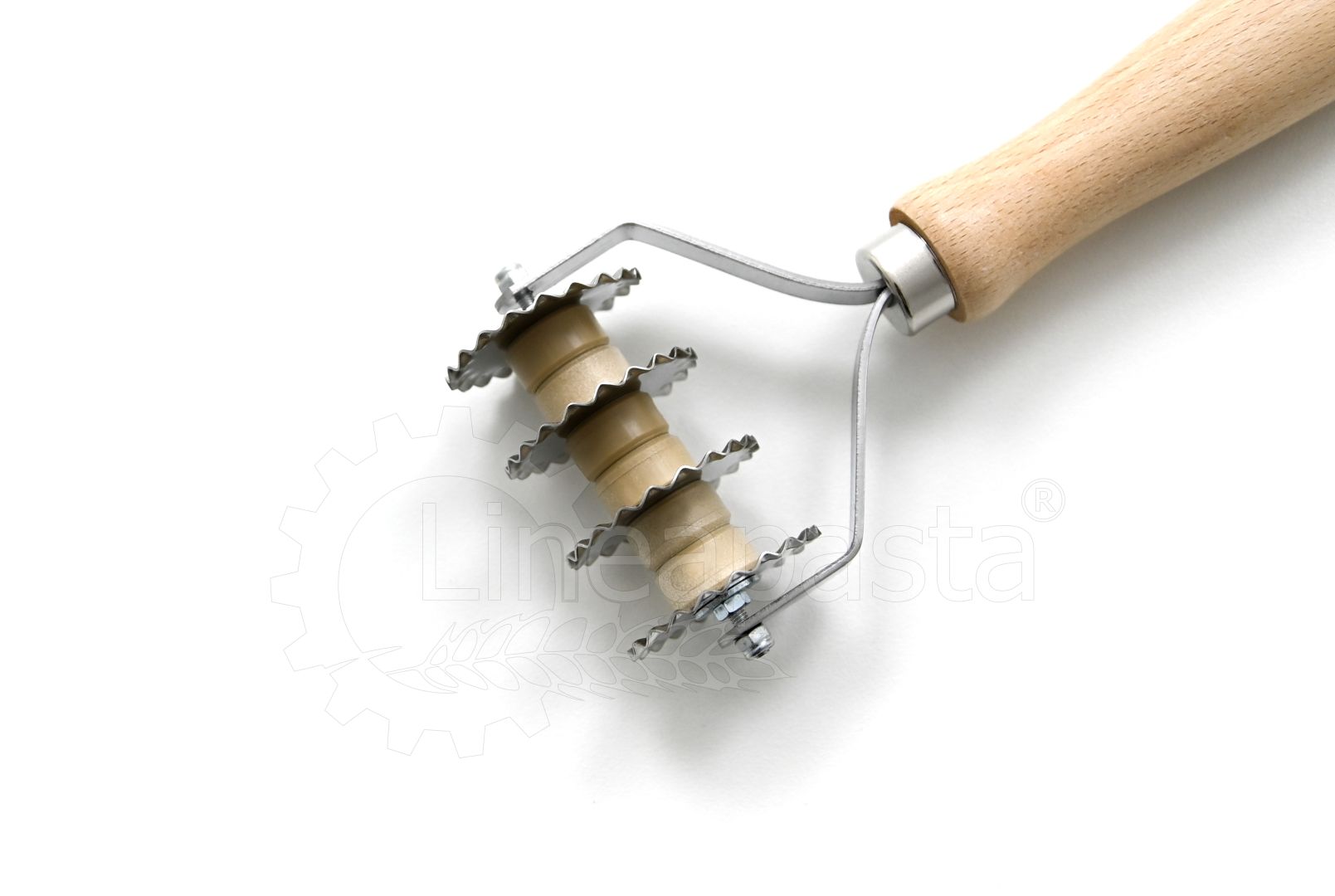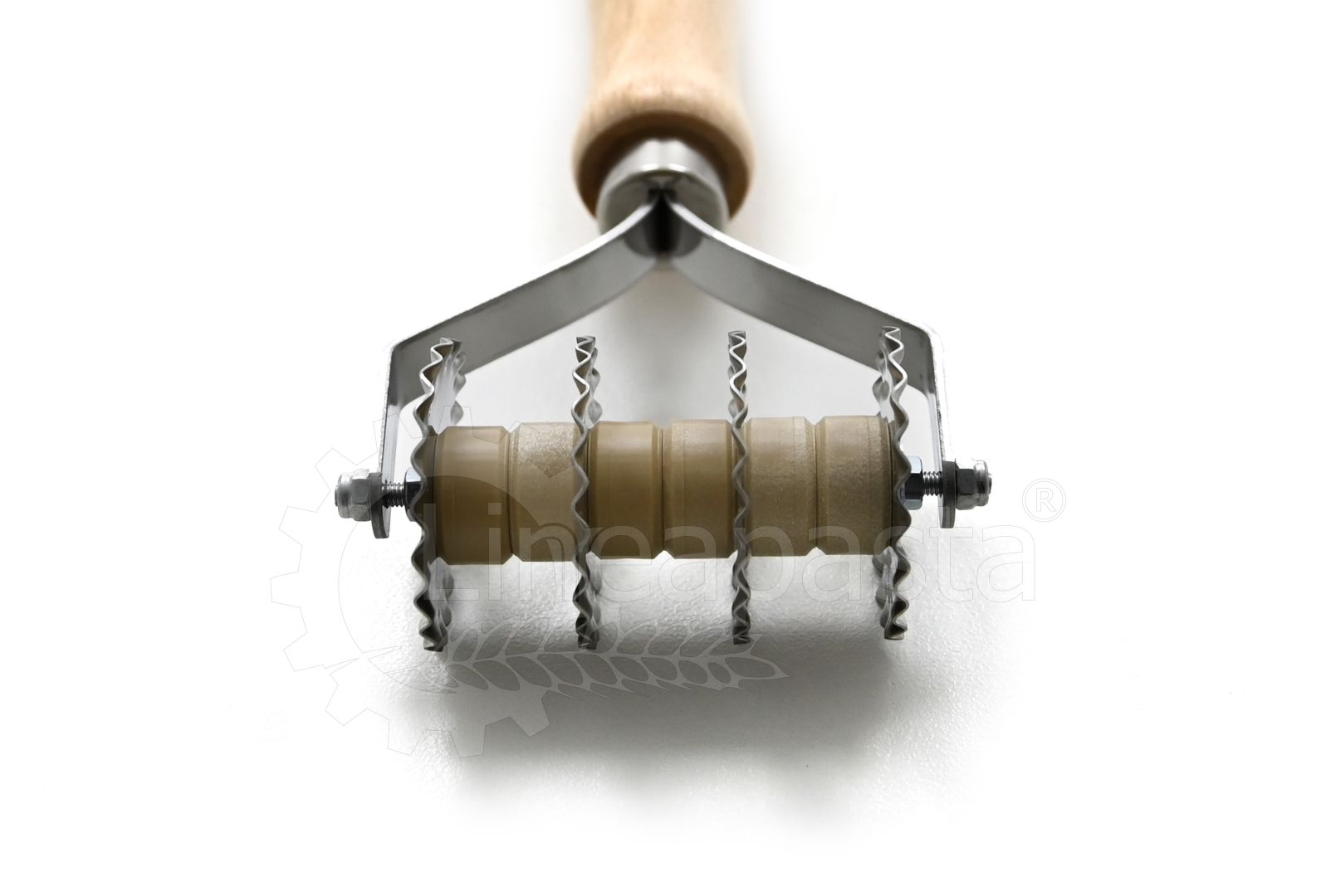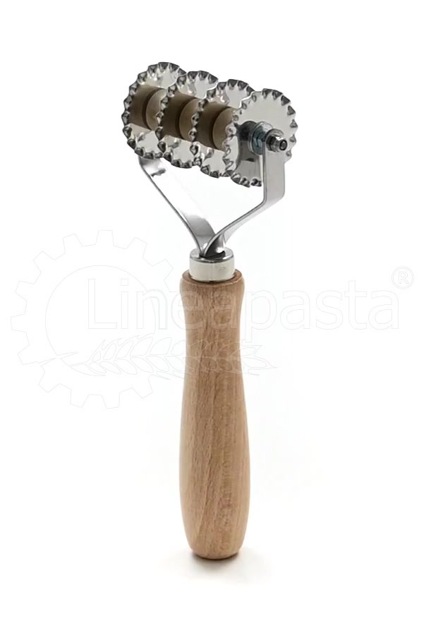 Coupe-pâte conçu pour la préparation de pappardelle de 16 mm. Cet outil est composé d’un manche en bois confortable et de quatre lames dentées, qui sont espacées de manière à former trois pistes de coupe. L’utilisation de ce coupe-pâtes est rapide et pratique, adapté à un usage professionnel et domestique.