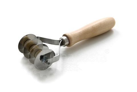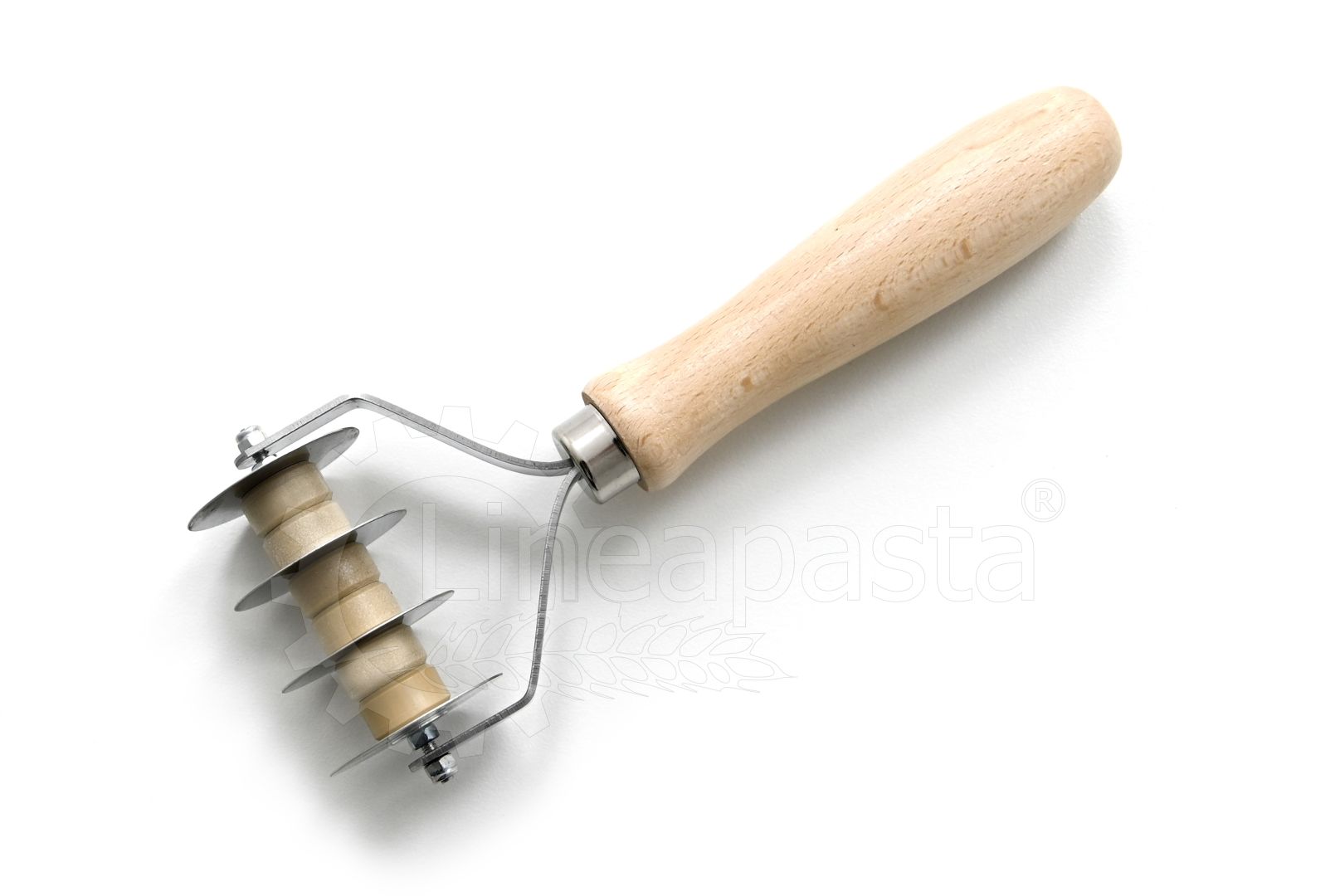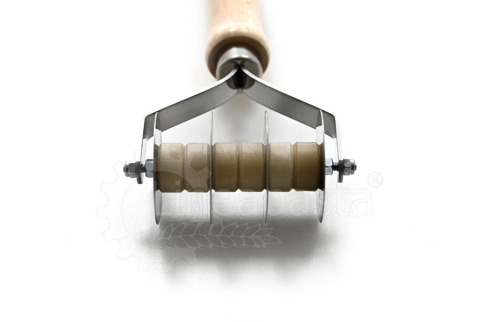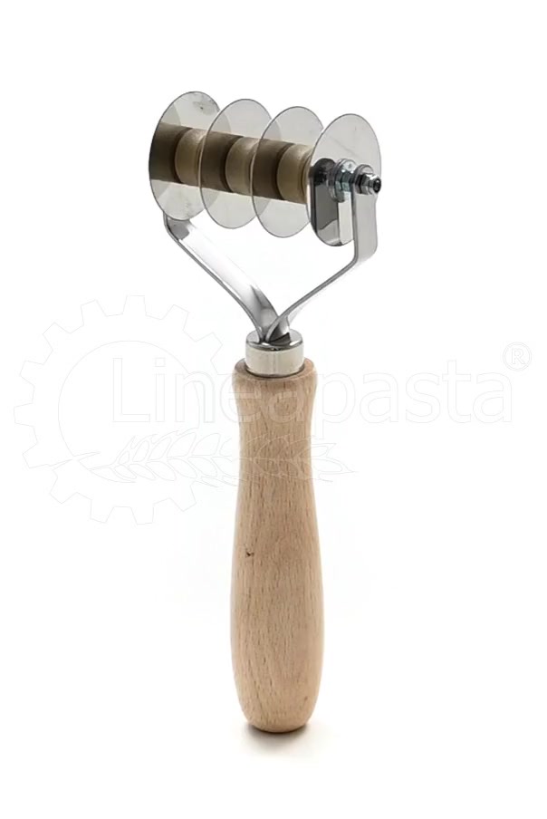 Coupe-pâte conçu pour la production de pappardelle de 16 mm. Cet outil est composé d’un manche en bois pratique et de quatre lames lisses, qui sont placées à égale distance les unes des autres de manière à former trois pistes de coupe. L’utilisation de ce coupe-pâte est simple et rapide, adapté à un usage domestique et professionnel.