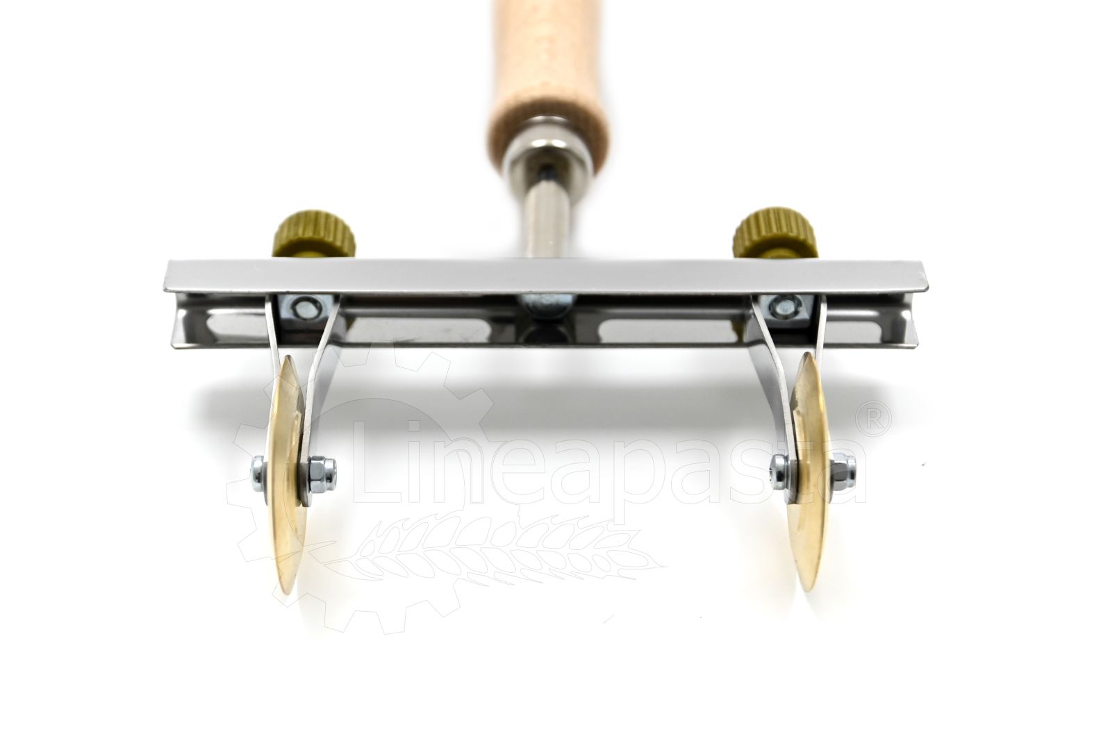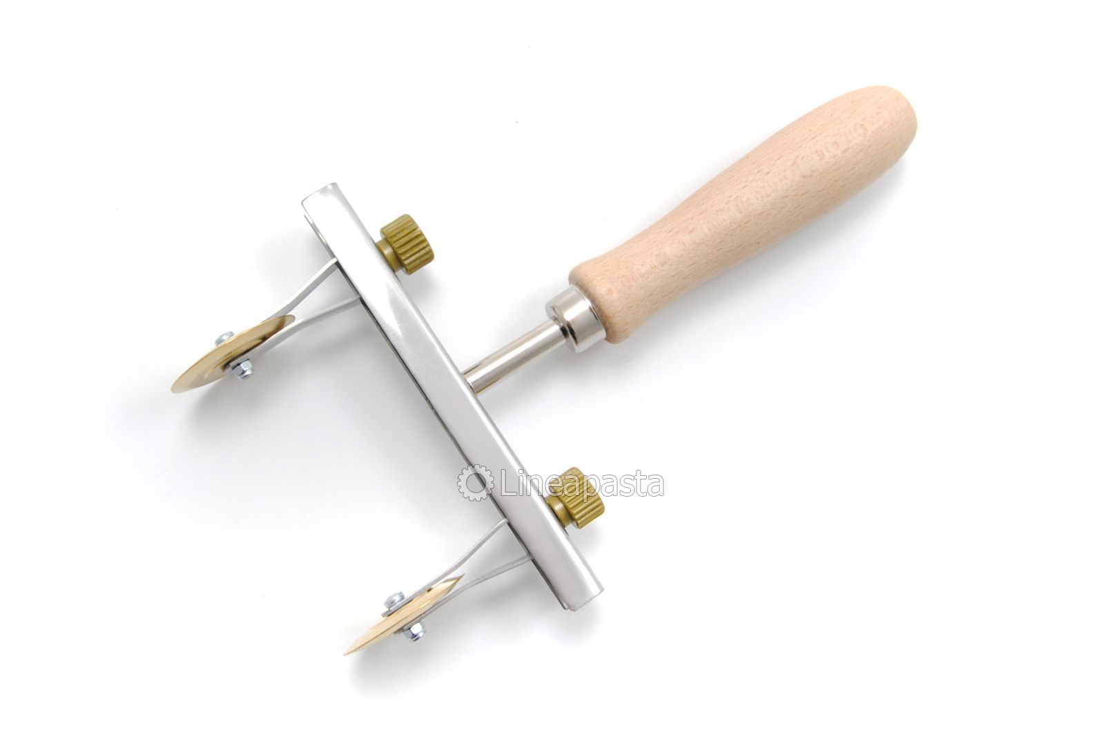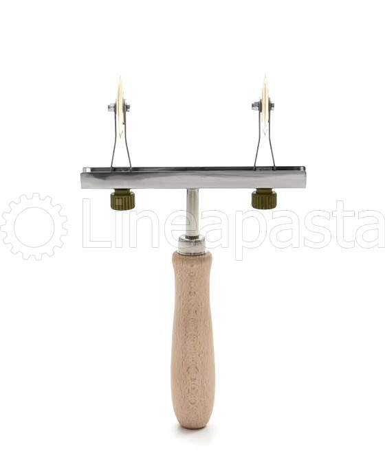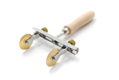 Coupe-pâte à roulettes multiple composé d’une poignée en bois, une structure en acier et deux lames lisses en laiton de 38 mm de diamètre. Les deux lames lisses en laiton sont réglables à une distance de 22 à 116 mm, idéales pour la réalisation de tortellini, tortelloni et ravioli. L’outil artisanal permet une coupe précise de la feuille, il est robuste et maniable, adapté pour un usage professionnel et domestique.
