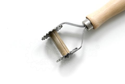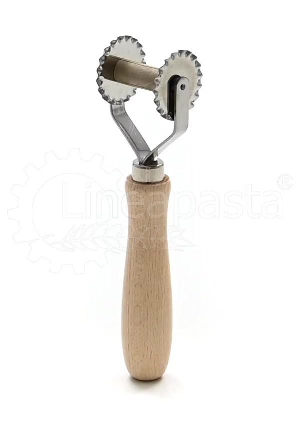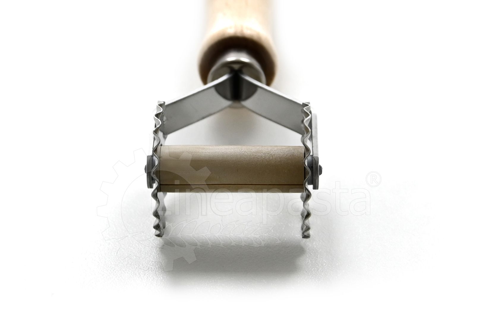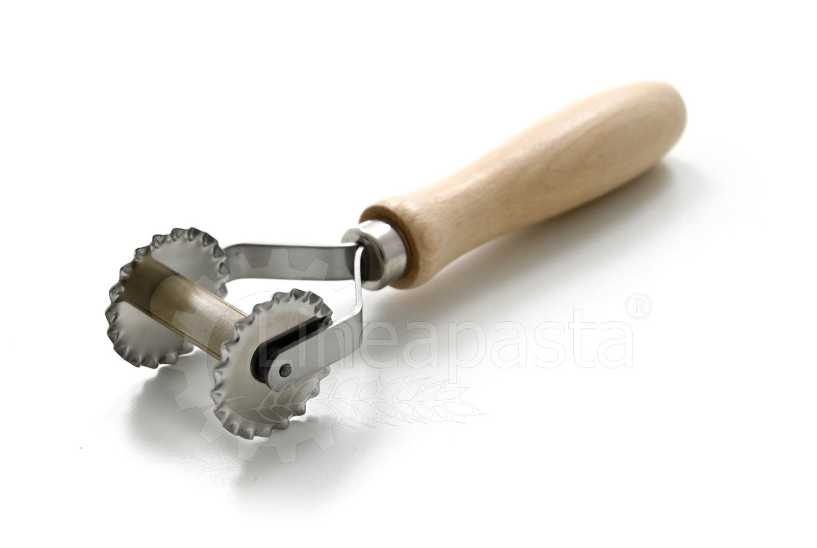 Coupe-pâte équipé d'un manche en bois pratique et composé de deux lames dentées en acier inoxydable, espacées de manière à couper pratiquement et rapidement une bande de pâte feuilletée de 38 mm de large. Ce coupe-pâtes est conçu pour la production de raviolis, cappelletti et tortellini, aussi bien à usage professionnel que domestique.