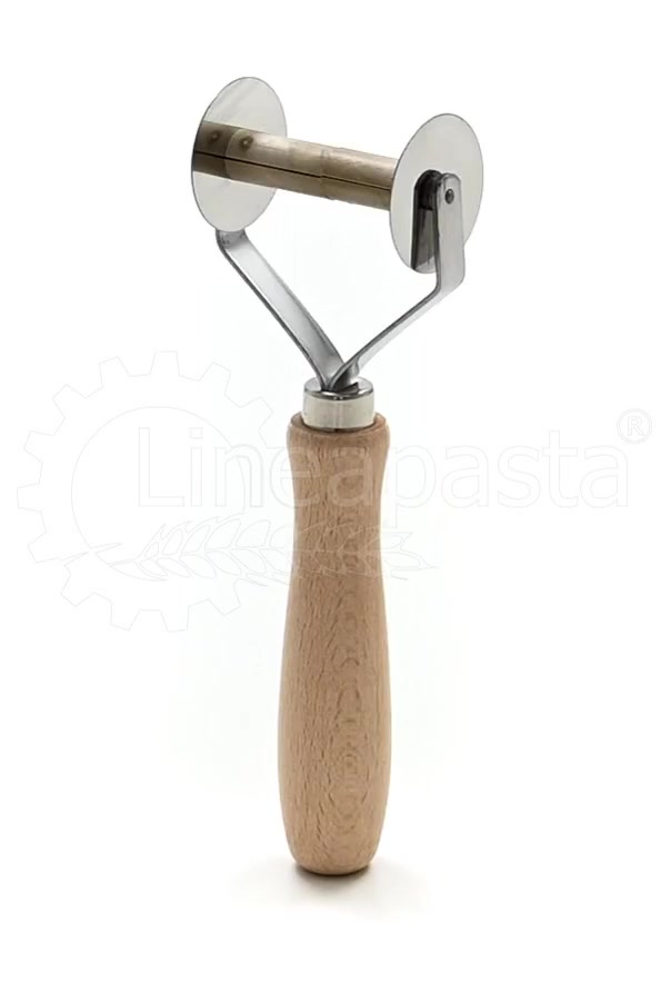 Coupe-pâtes composé de deux lames lisses en inox placées à une distance de 56 mm l'une de l'autre, il permet de découper une bande de pâte feuilletée proprement et rapidement. Equipé d'un manche en bois pratique, ce coupe-pâtes est conçu pour la réalisation de tortellini, raviolis et cappelletti.