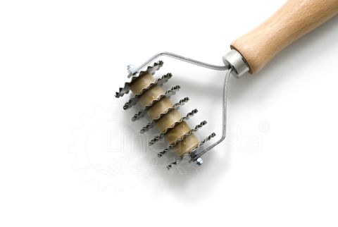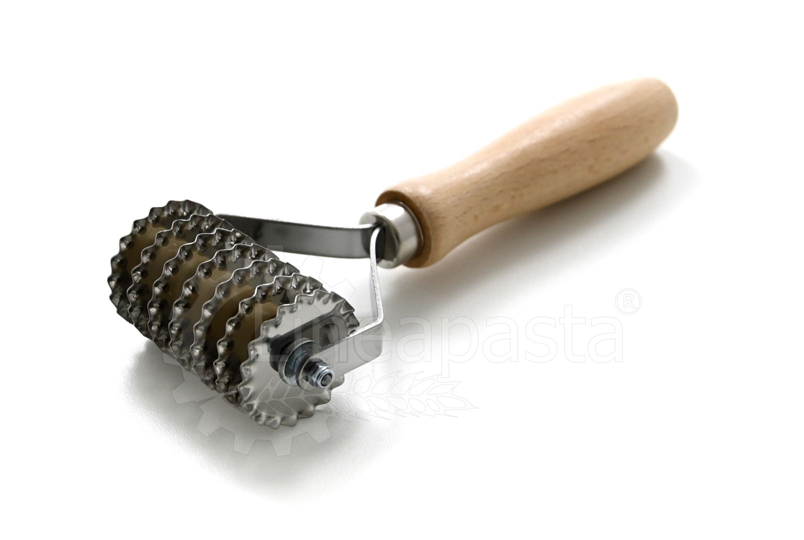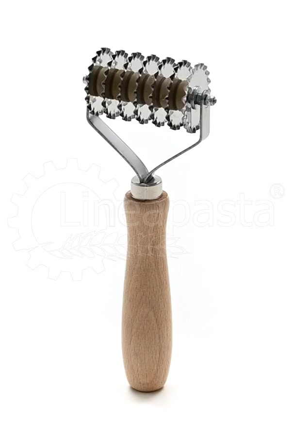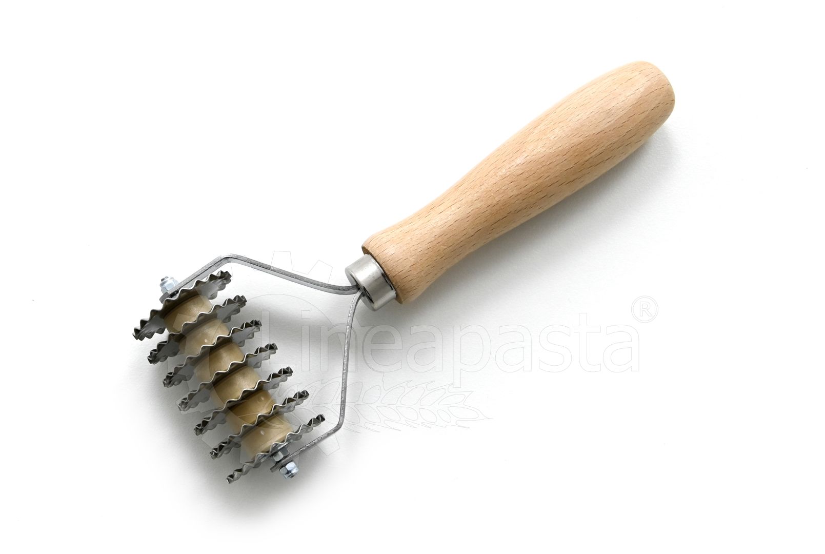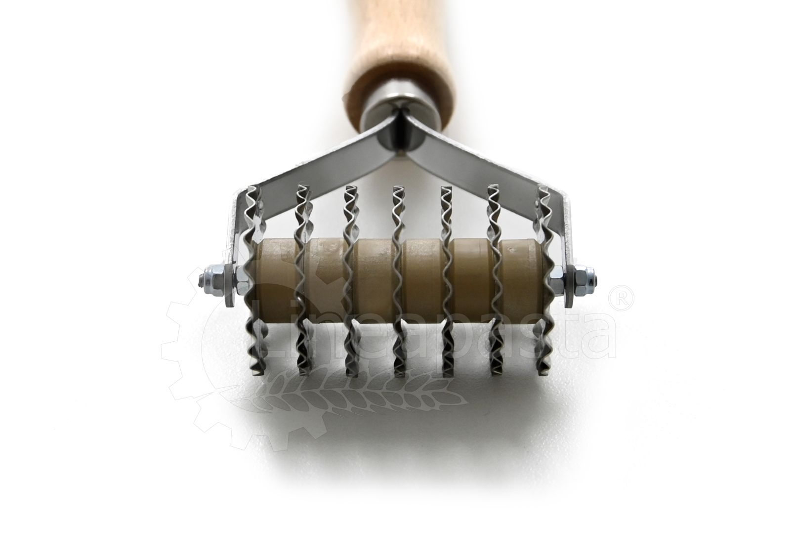 Coupe-pâtes équipé d'un manche en bois pratique et d'une structure en acier inoxydable, composé de sept lames dentées équidistantes qui forment six pistes de coupe. Ce coupe-pâte est conçu pour marquer la pâte feuilletée rapidement et facilement, en coupant la pâte feuilletée en tagliatelles de 8,5 mm sans utiliser de laminoirs ou de presses.